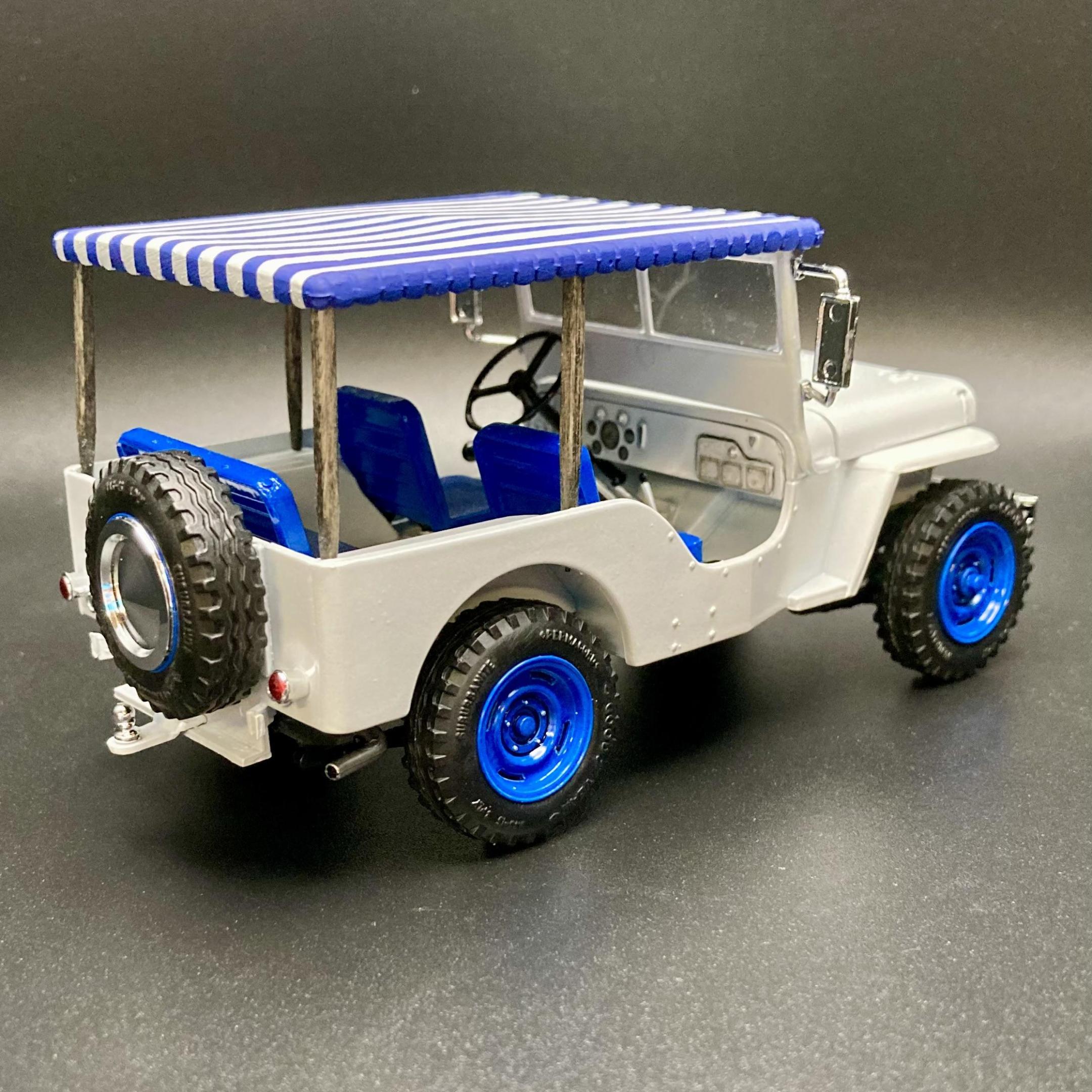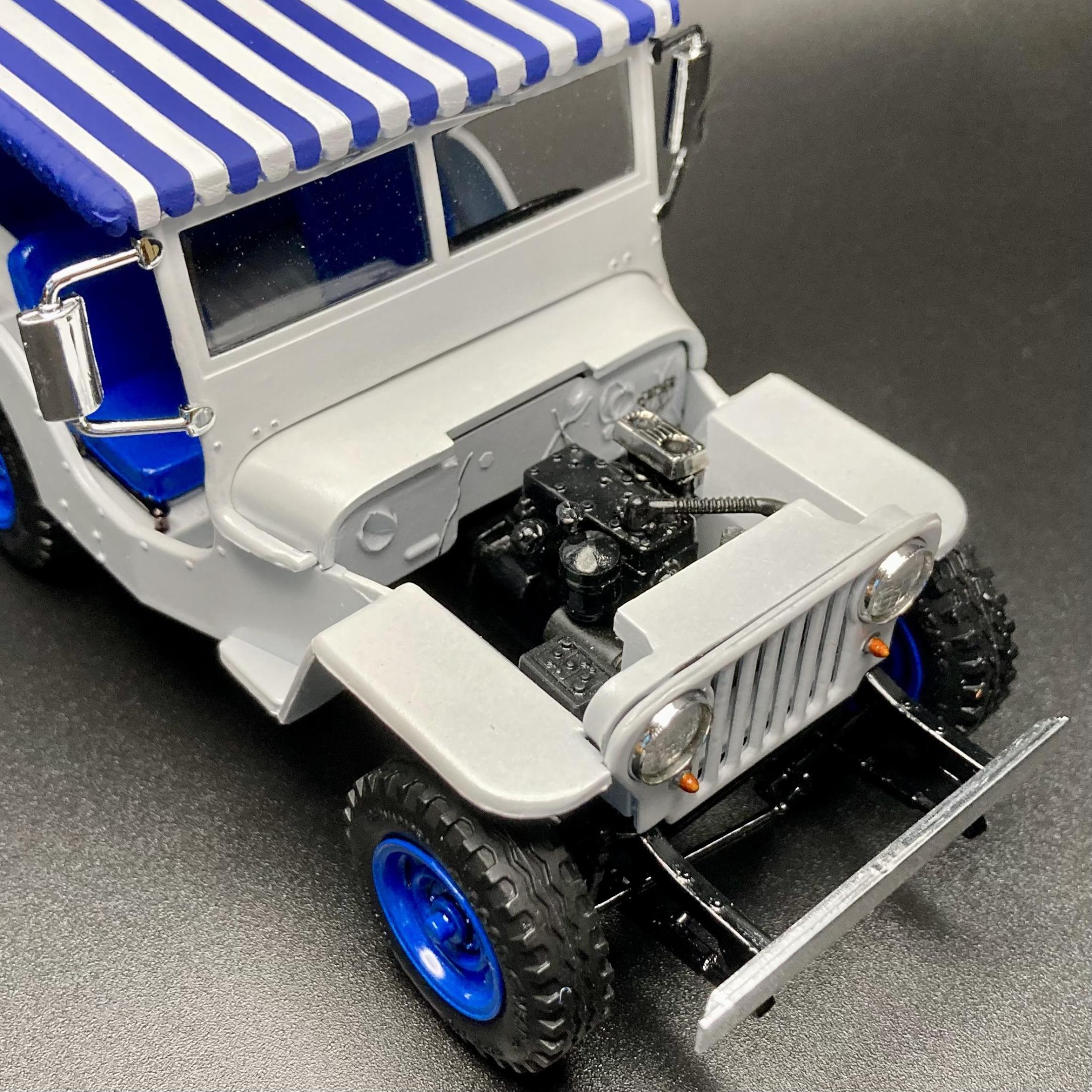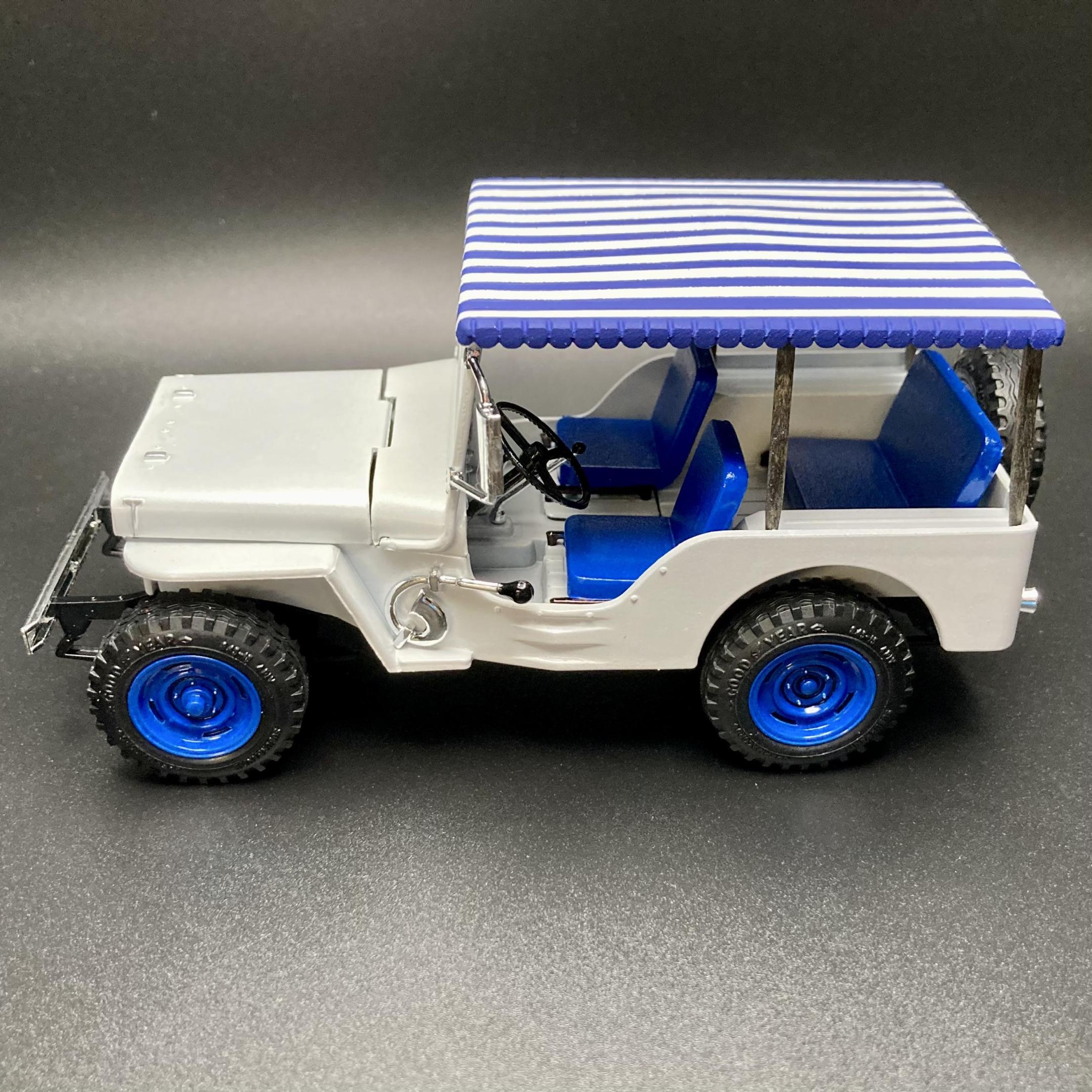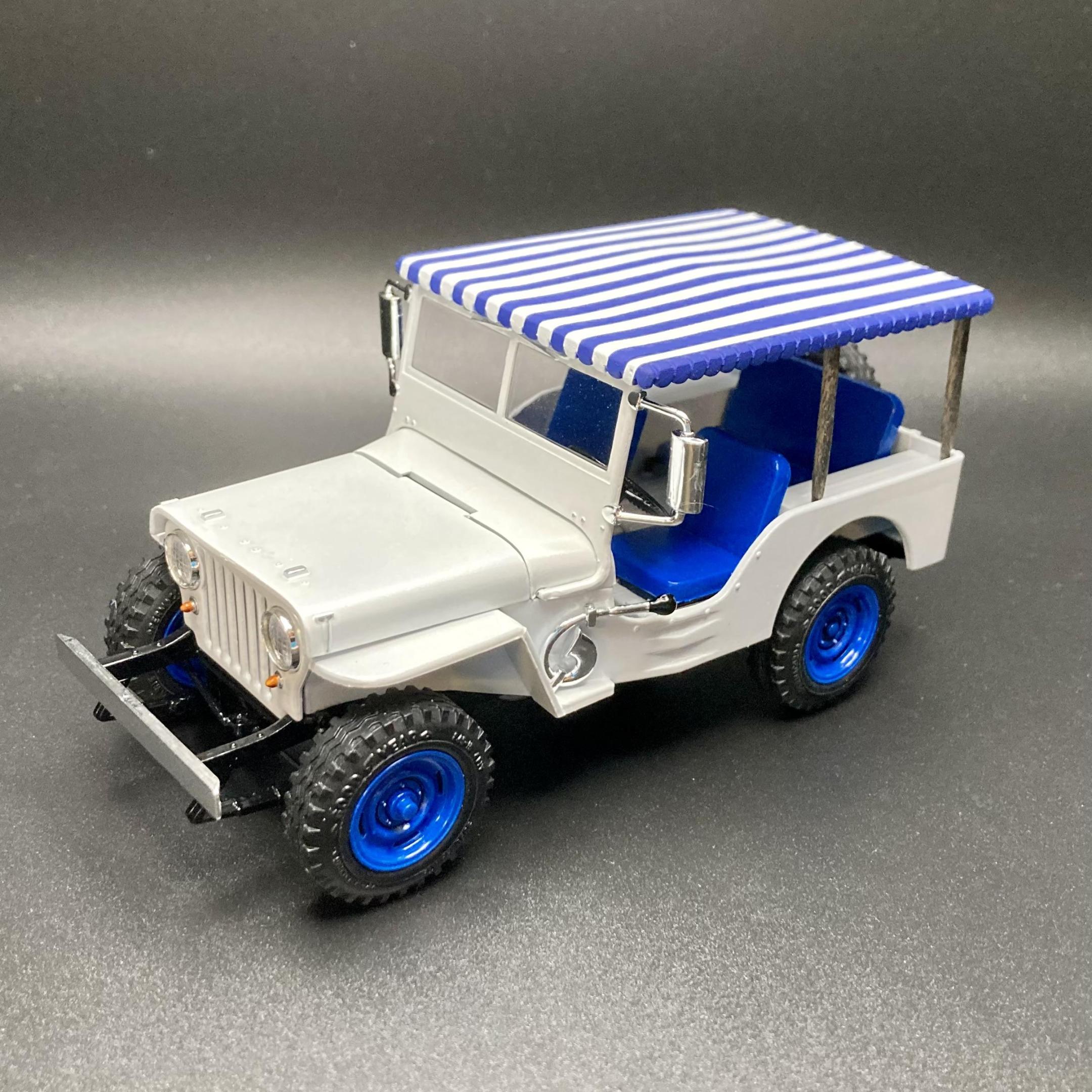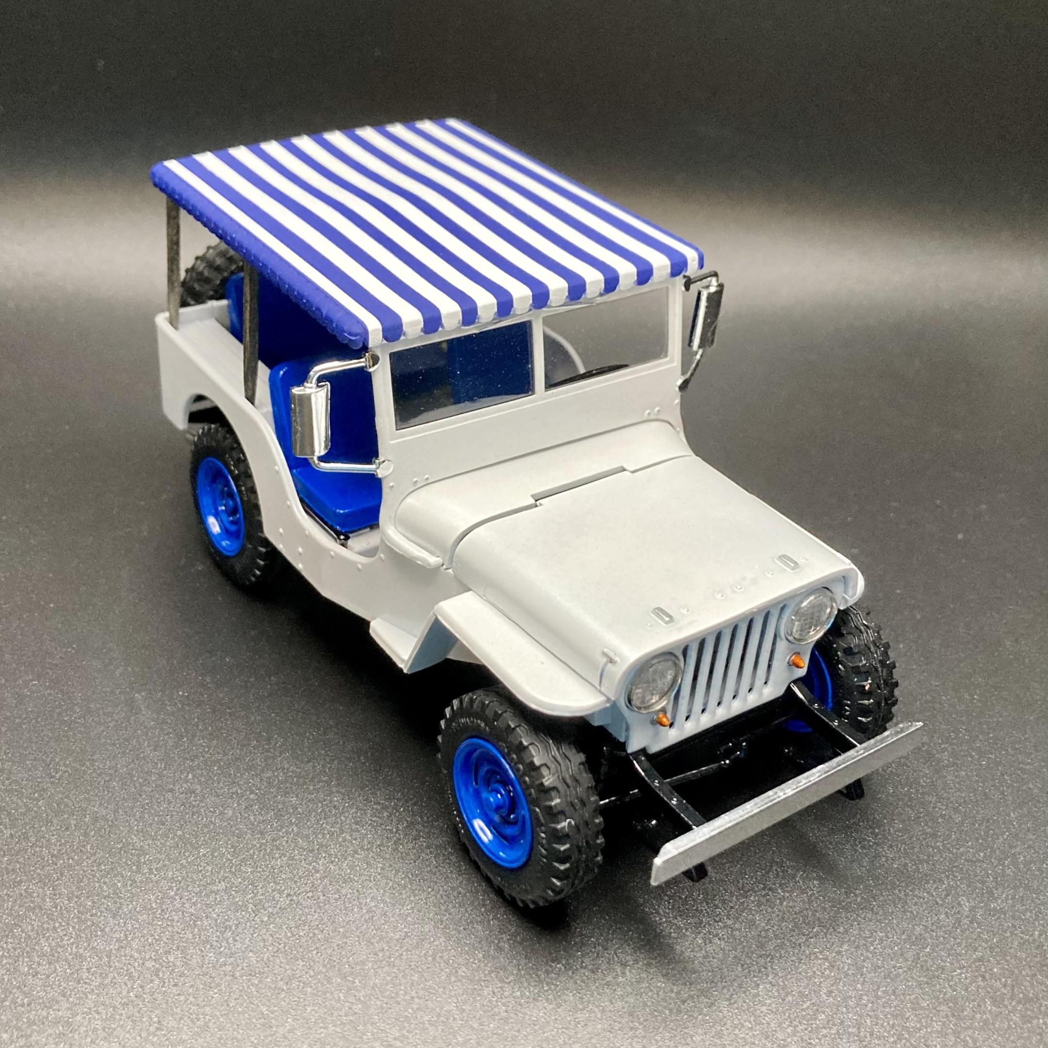 Just finished this MPC Jeep CJ-2A! It’s the Godzilla movie kit that I picked up from Ollie’s a little while ago for $12. Like most classic MPC kits, there’s lots of detail and build options, but also questionable fit and finish and tons of flash. My kit had several warped trees including most of the military parts, so Surrey top it is! The hood was very warped too so I got it as straight as I could. Paint is Tamiya TS45 Pearl White (first primed in gray to cover the green plastic, then white primer) with Krylon True Blue for the seats and wheels. Top is Tamiya white primer and XF-8 Flat Blue. The top supports that come with the kit are way too short for the height of the windshield, so I used toothpicks with Tamiya black wash. Overall it goes together ok and was pretty fun to design.