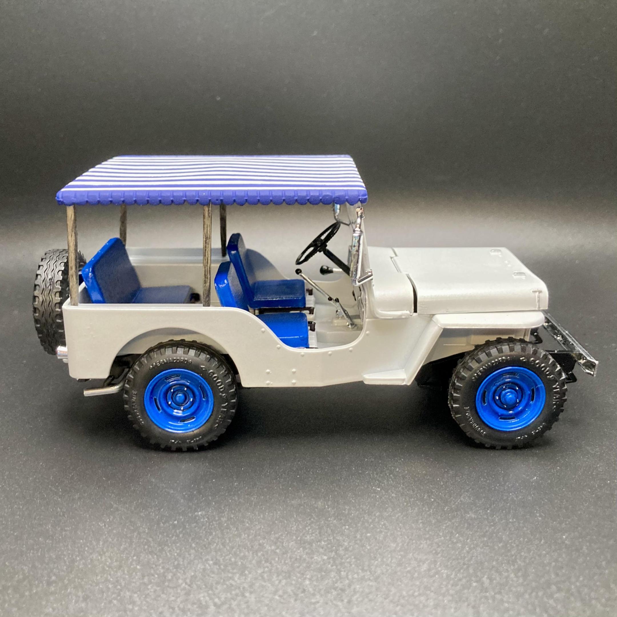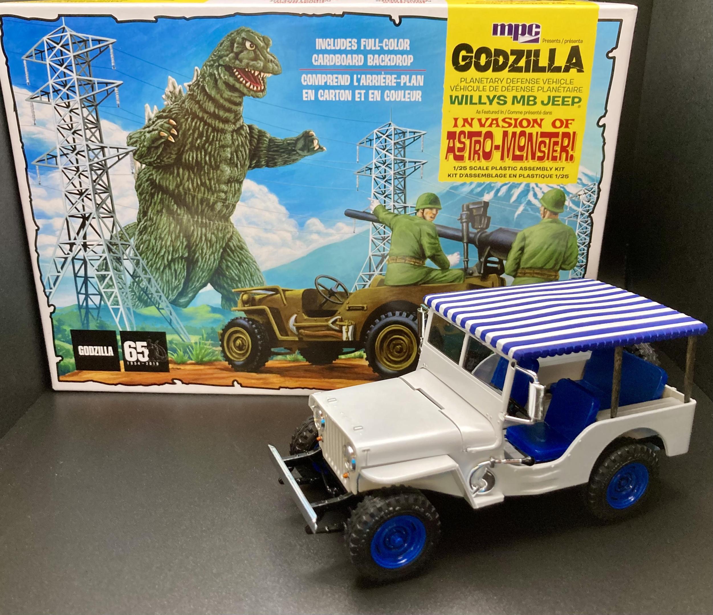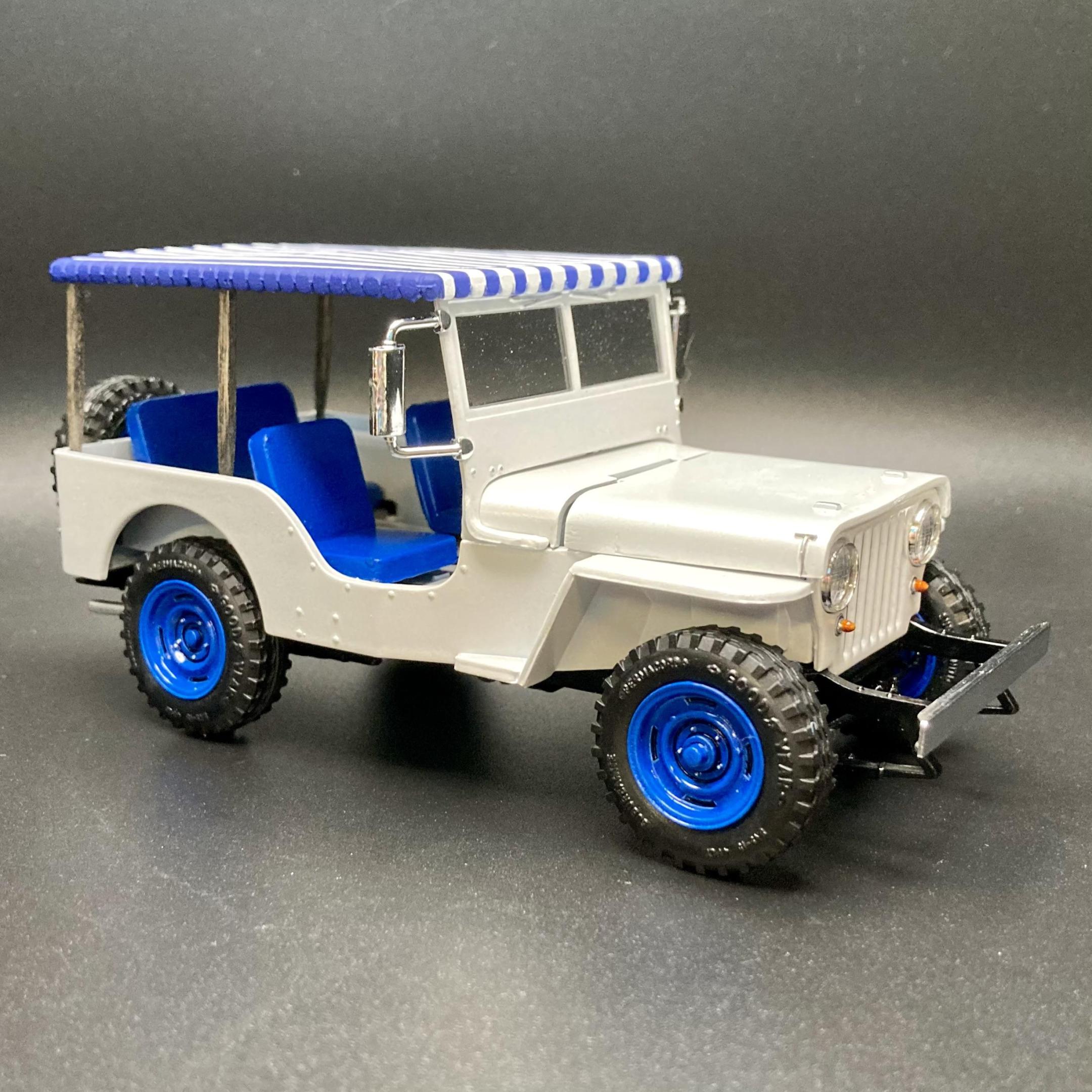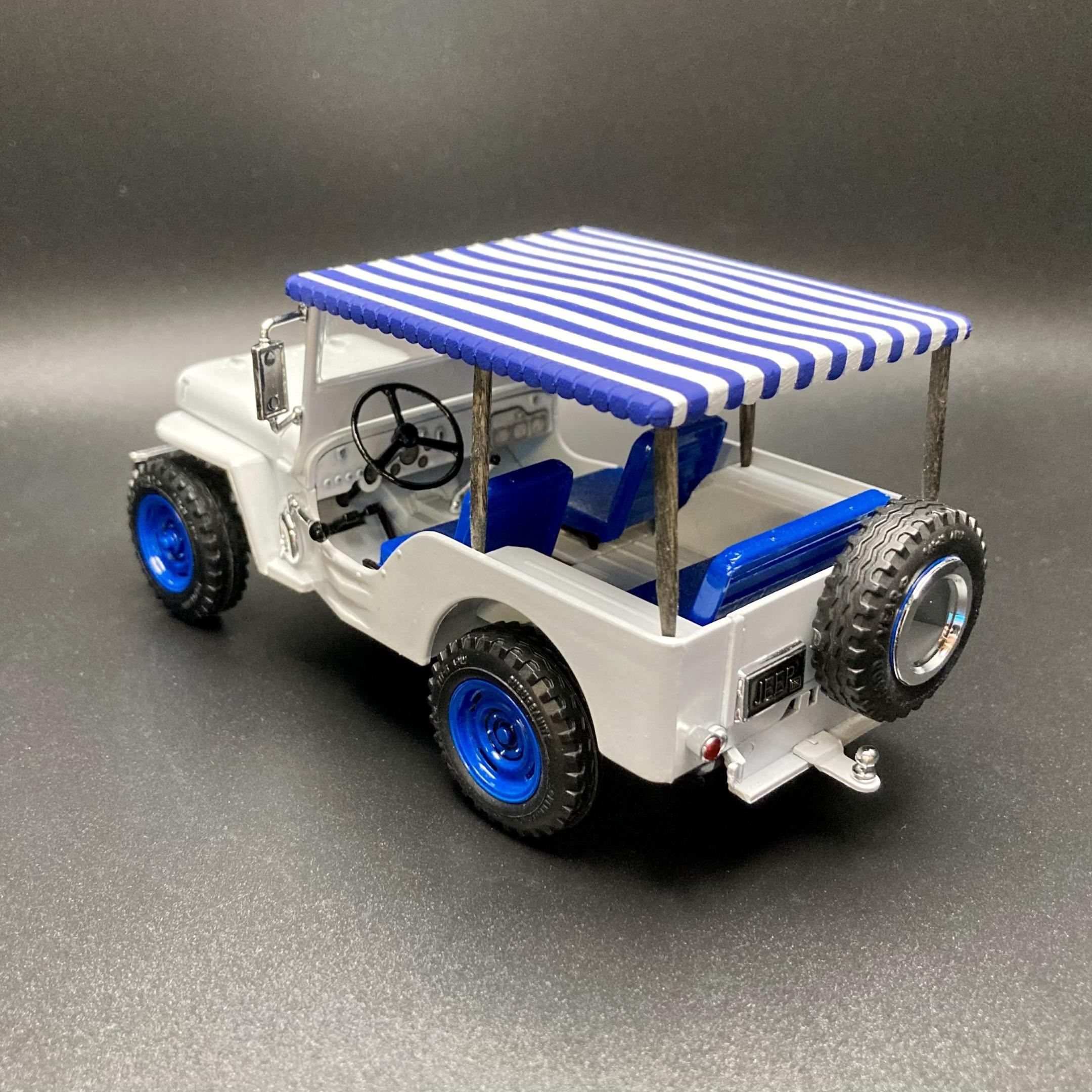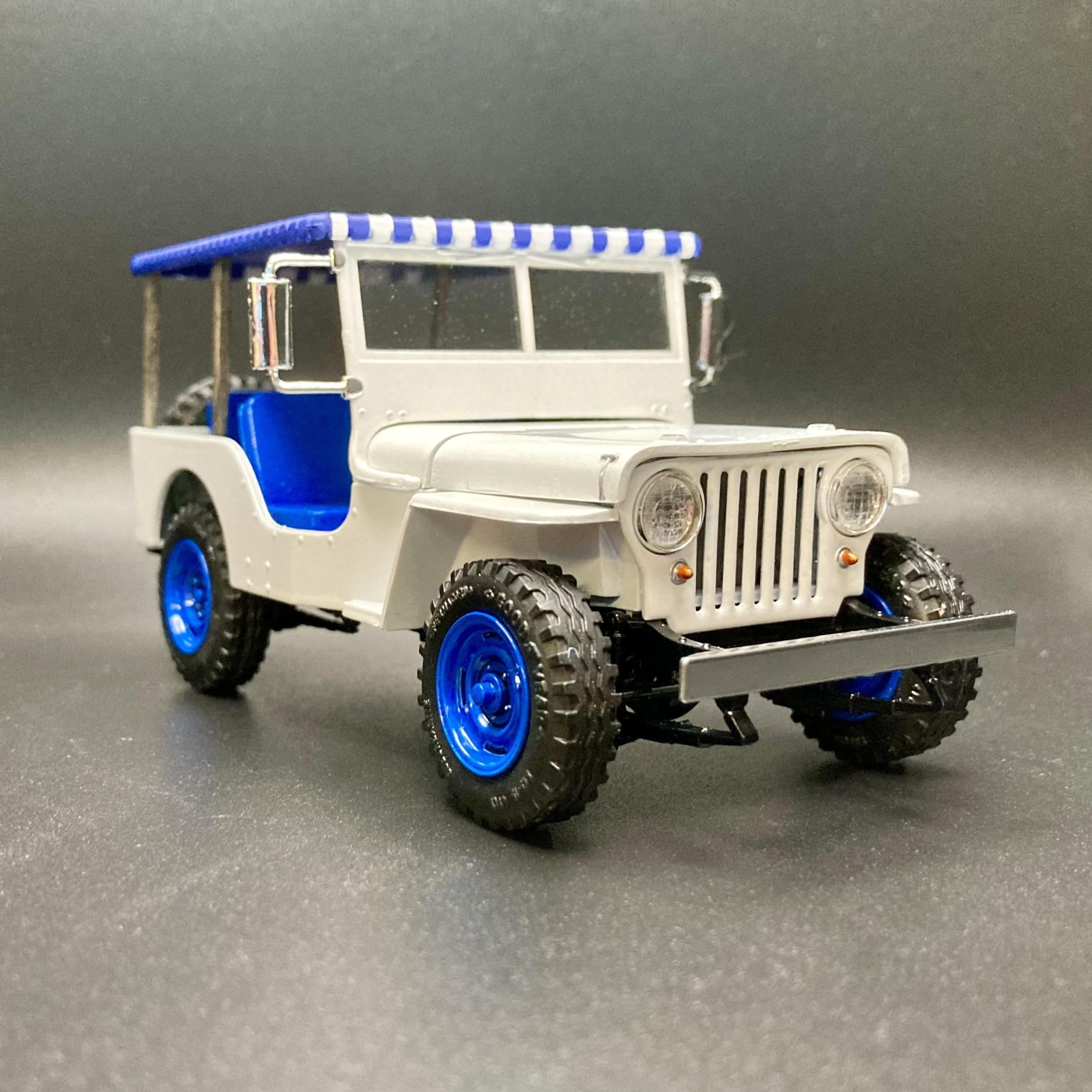 Just finished this MPC Jeep CJ-2A! It’s the Godzilla movie kit that I picked up from Ollie’s a little while ago for $12. Like most classic MPC kits, there’s lots of detail and build options, but also questionable fit and finish and tons of flash. My kit had several warped trees including most of the military parts, so Surrey top it is! The hood was very warped too so I got it as straight as I could. Paint is Tamiya TS45 Pearl White (first primed in gray to cover the green plastic, then white primer) with Krylon True Blue for the seats and wheels. Top is Tamiya white primer and XF-8 Flat Blue. The top supports that come with the kit are way too short for the height of the windshield, so I used toothpicks with Tamiya black wash. Overall it goes together ok and was pretty fun to design.
