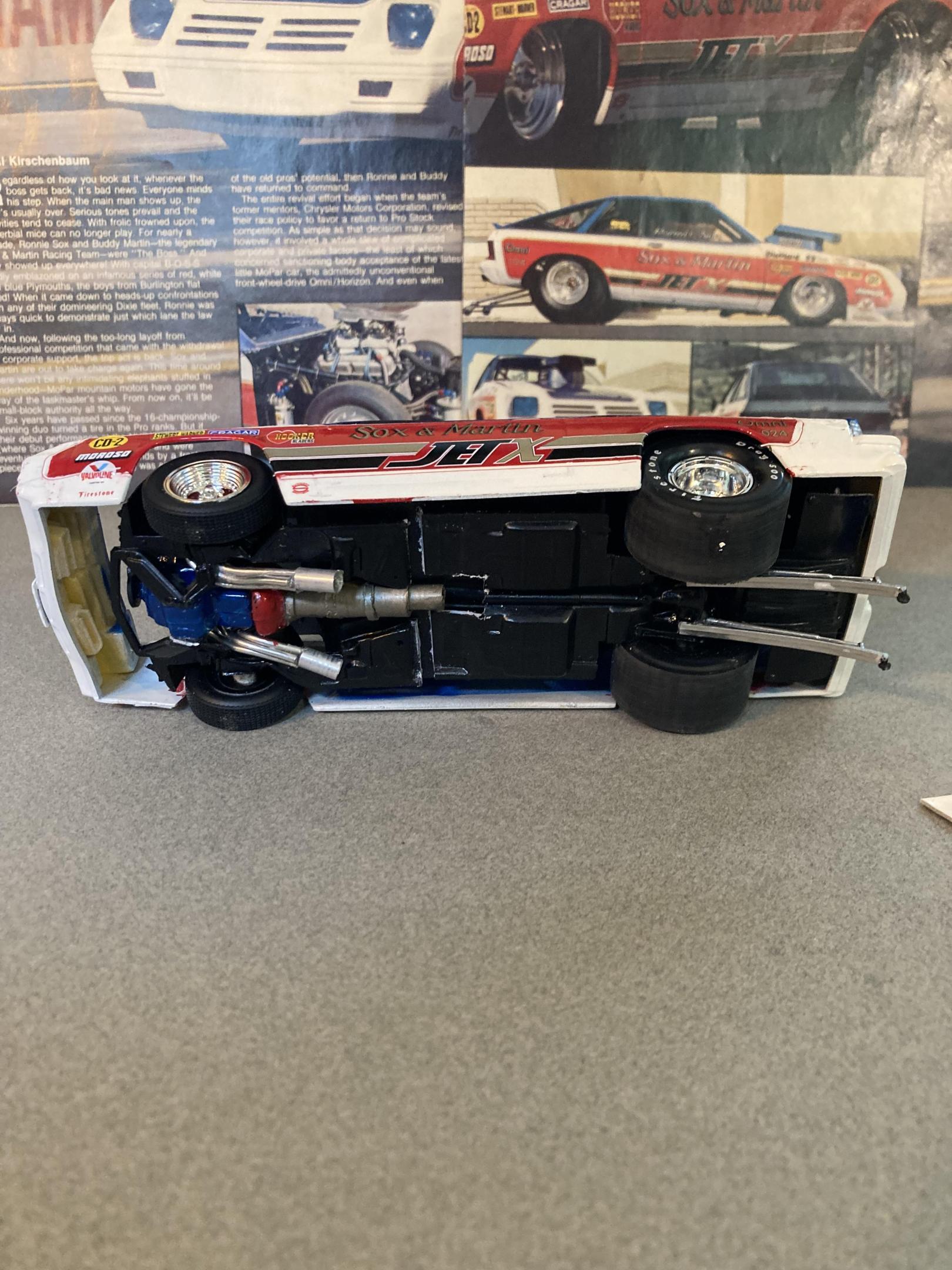 I started out with the mpc volare kit and I used the chassis from a amt pro street gtx from the fire wall back . The hemi was also pulled from the gtx . The hood scoop is from comp. Resins I do think it’s a little to tall I should have cut it down. The window net is cut from a piece of window screen. The wheels came with the gtx. It’s finished in testors white enamel with decals from southern Motorsport hobbies. Until next time thanks for looking ?. Mike