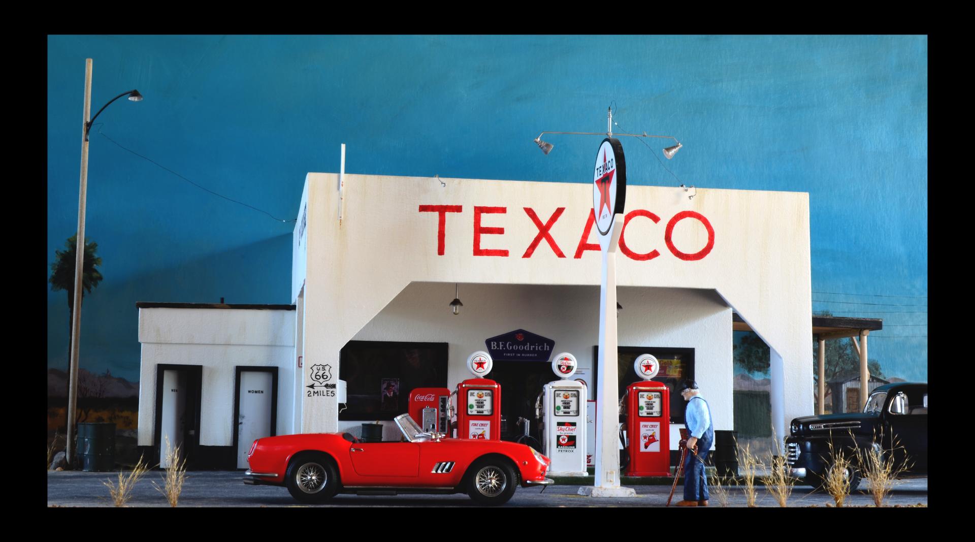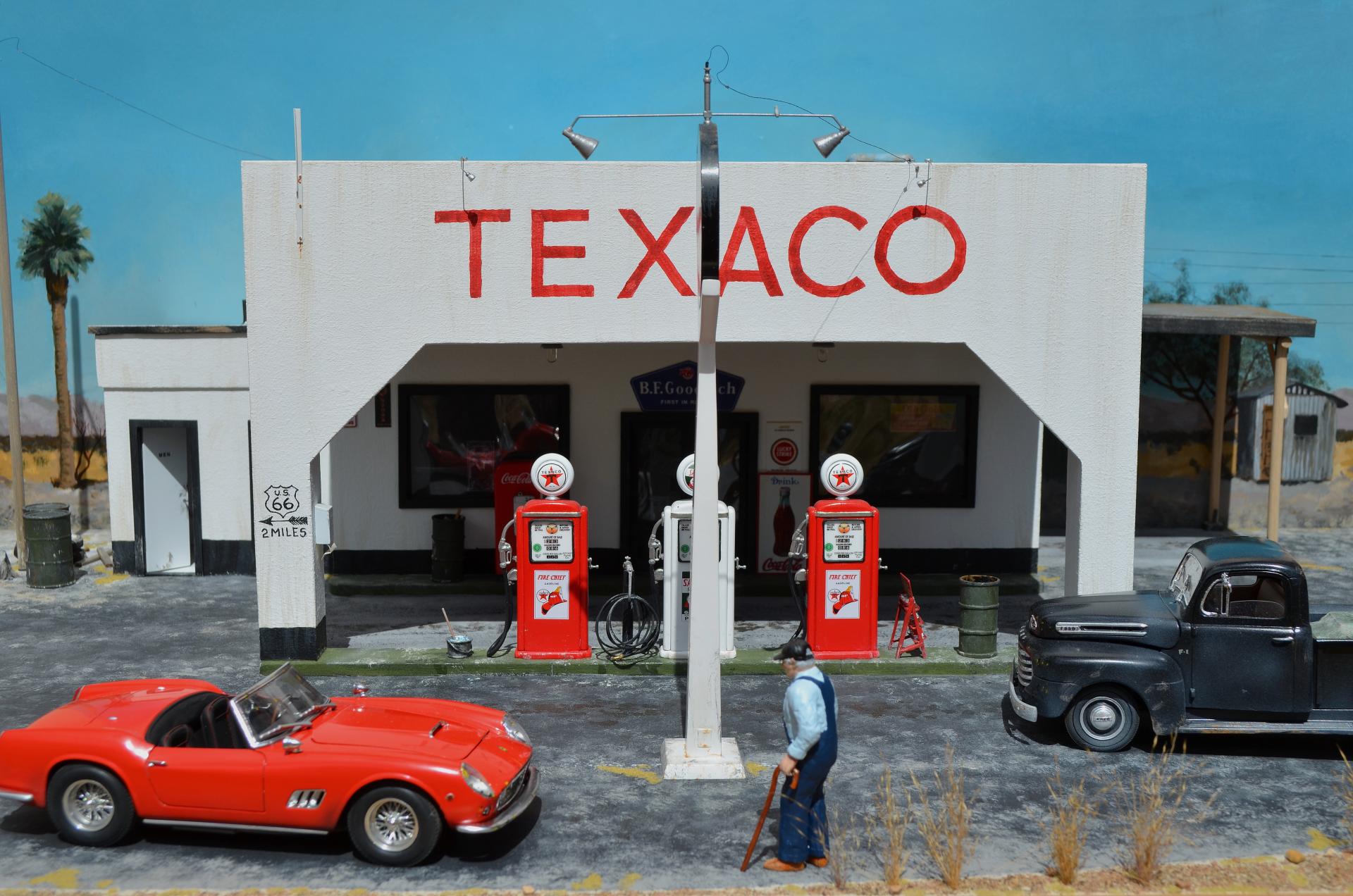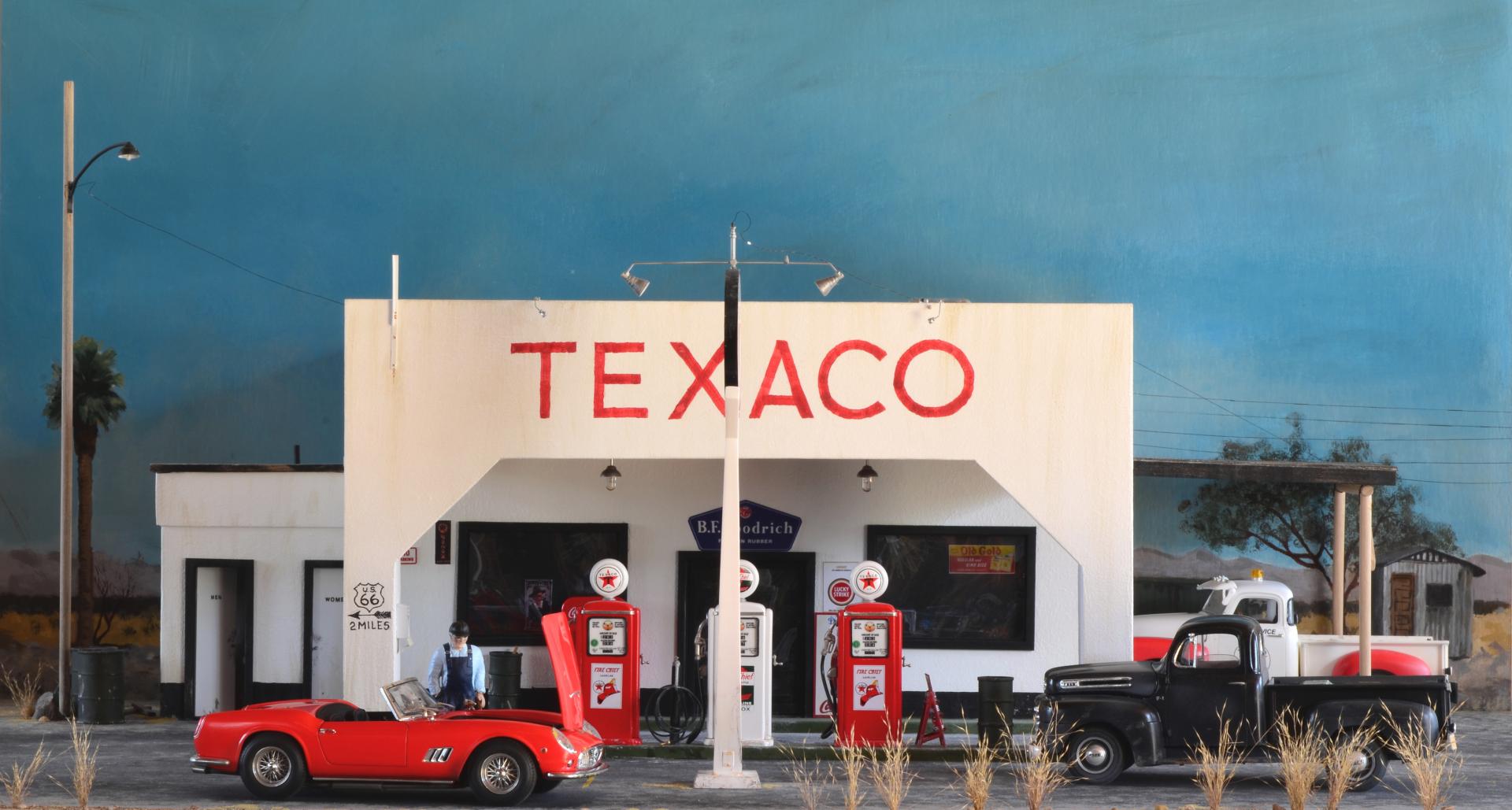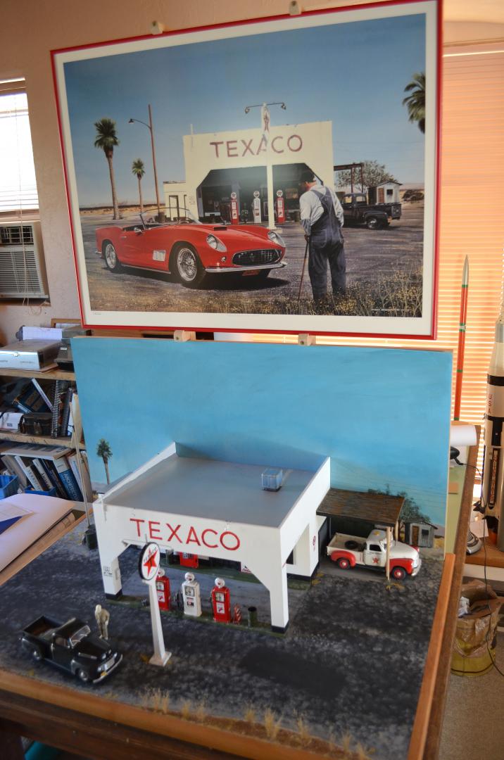 This was inspired by an artist Ken Eberts ad in Mobilia magazine July 1993, pg. 17 that I picked up at one of the White Mountain model shows. Soon as I saw it, I knew it would be a killer diorama subject. From the ad: "California Pit Stop" by Ken Eberts was awarded the highest honor at the 1992 Pebble Beach Concours d'Elegance AFAS Exhibition... Featuring a red 1959 Ferrari California Spyder at a Texaco Station of Rt. 66 in the California desert in 1959, a local character draws his own conclusions as the car's owner makes a "pit stop." ... The main character is the Italeri 250 GT California Spyder, which has some Miniatures of Maryland detail parts for the interior, and several scratch-built things. The old man is a Fujimi mechanics figure that is heavily modified with epoxy putty and wine bottle foil. The Ford pickup is Monogram's great kit, just added some cargo. I added the AMT Chevy pickup for obvious reasons. Most of the gas station parts came from Detail Resources, who went out of business, so lucky I ordered all that when I did (lesson learned, get it now, don't wait!). I scratch-built the oil can rack from cardboard. The building is made from thin construction plywood, and ripped alder for rafters, doors, trim, curb etc. A few posters are copied from the original painting, but signs were found online and Photo Shop used to enhance and scale to size. The background is oil painted to match the painting. I also made a mount for shows, to have his painting above. I figured out the artist took artistic license to force perspective. I need to replicate a gas pump for a base, and make a glass cover, because it's 2 ft. x 3 ft., and the cats would wreck it if in the house.