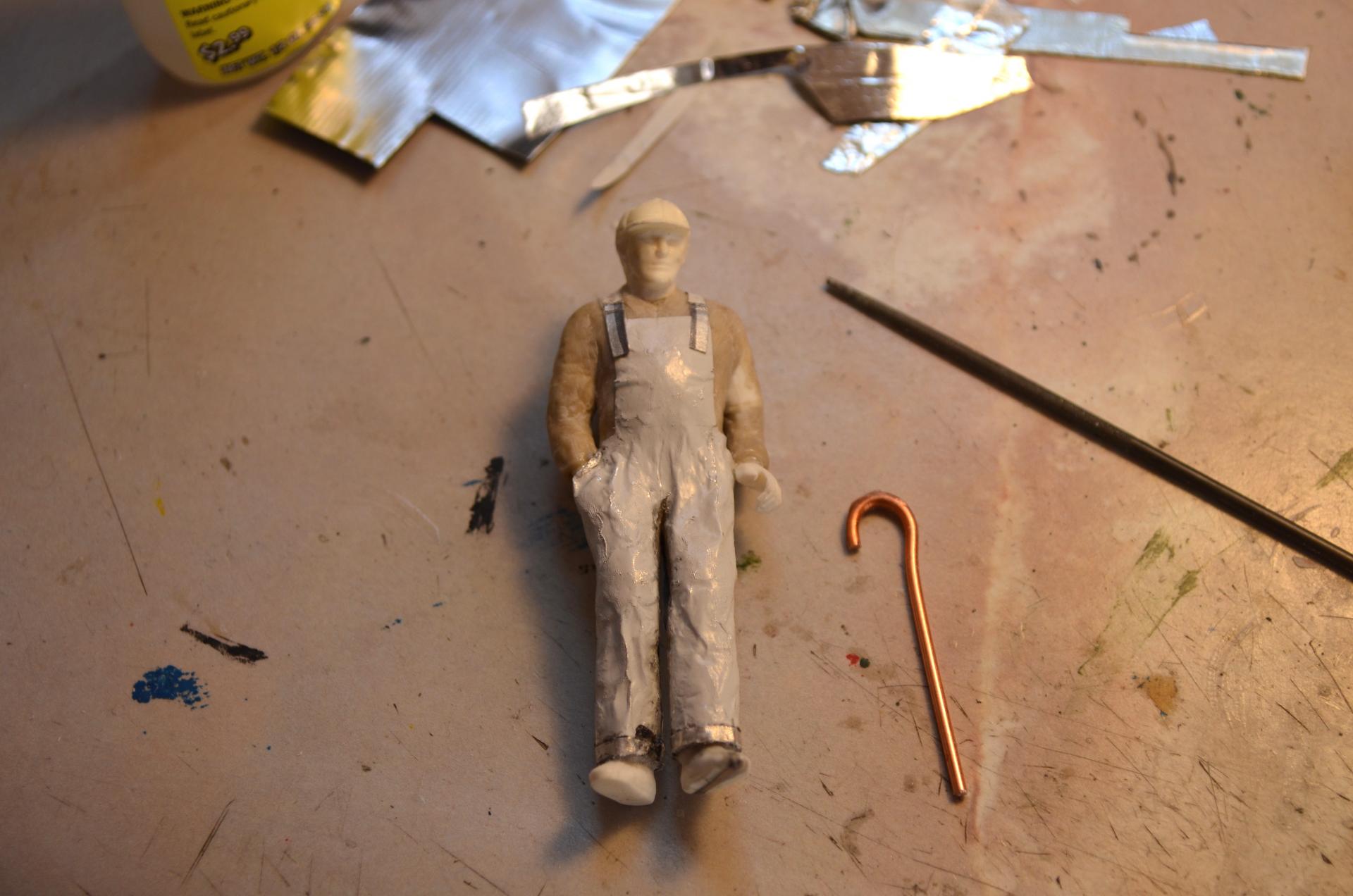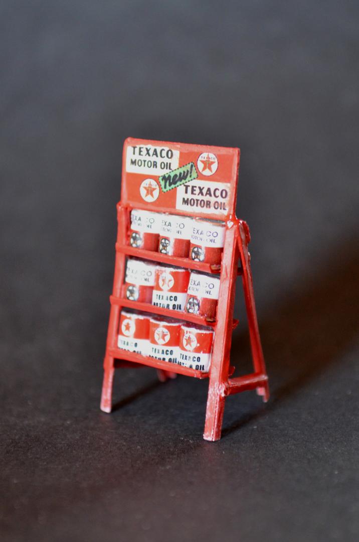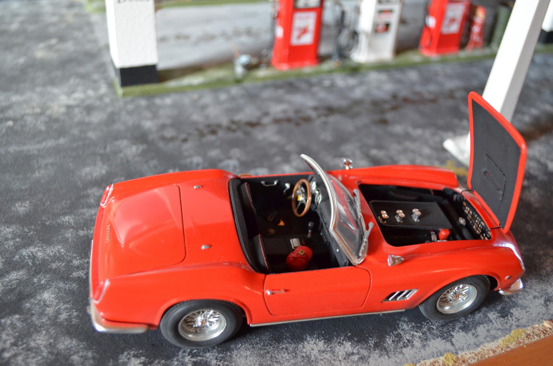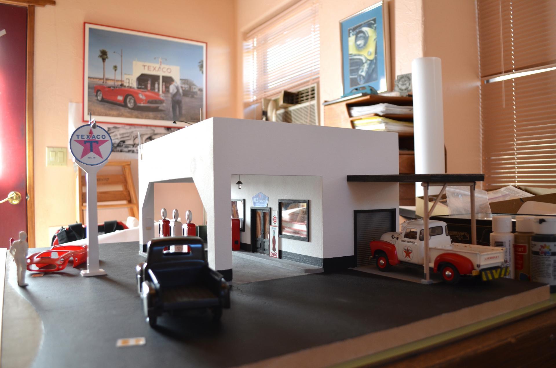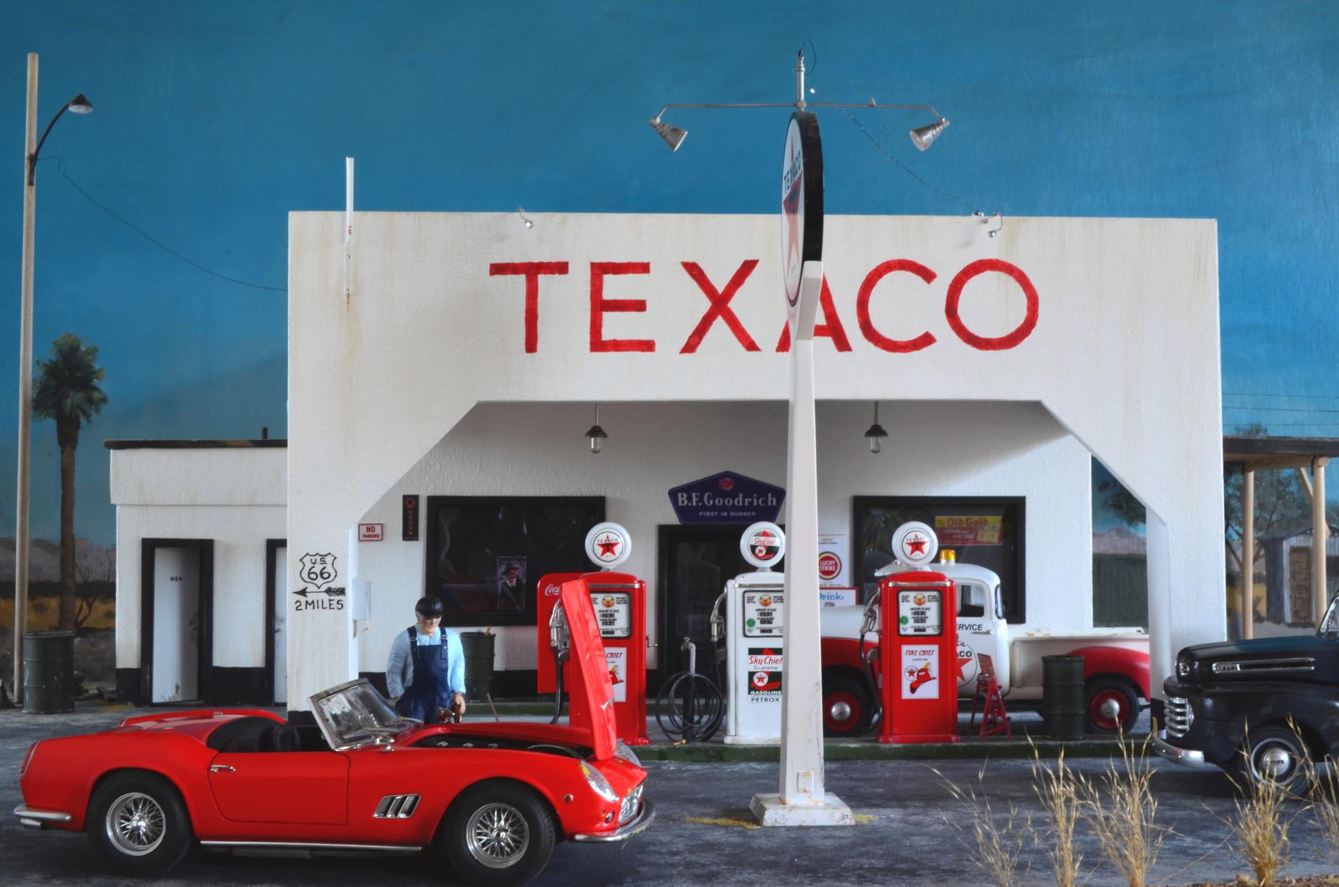 This was inspired by an artist Ken Eberts ad in Mobilia magazine July 1993, pg. 17 that I picked up at one of the White Mountain model shows. Soon as I saw it, I knew it would be a killer diorama subject. From the ad: "California Pit Stop" by Ken Eberts was awarded the highest honor at the 1992 Pebble Beach Concours d'Elegance AFAS Exhibition... Featuring a red 1959 Ferrari California Spyder at a Texaco Station of Rt. 66 in the California desert in 1959, a local character draws his own conclusions as the car's owner makes a "pit stop." ... The main character is the Italeri 250 GT California Spyder, which has some Miniatures of Maryland detail parts for the interior, and several scratch-built things. The old man is a Fujimi mechanics figure that is heavily modified with epoxy putty and wine bottle foil. The Ford pickup is Monogram's great kit, just added some cargo. I added the AMT Chevy pickup for obvious reasons. Most of the gas station parts came from Detail Resources, who went out of business, so lucky I ordered all that when I did (lesson learned, get it now, don't wait!). I scratch-built the oil can rack from cardboard. The building is made from thin construction plywood, and ripped alder for rafters, doors, trim, curb etc. A few posters are copied from the original painting, but signs were found online and Photo Shop used to enhance and scale to size. The background is oil painted to match the painting. I also made a mount for shows, to have his painting above. I figured out the artist took artistic license to force perspective. I need to replicate a gas pump for a base, and make a glass cover, because it's 2 ft. x 3 ft., and the cats would wreck it if in the house.