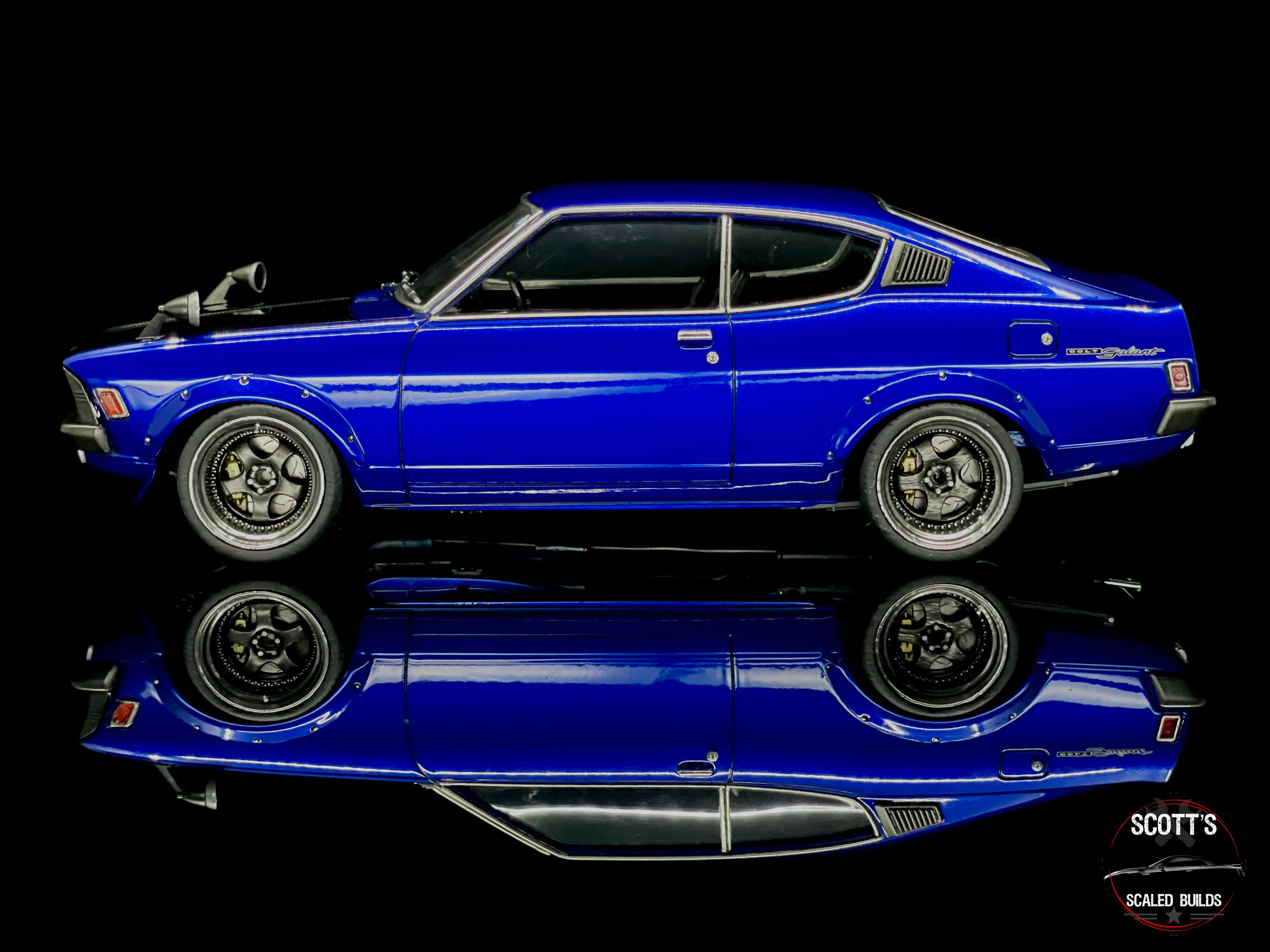 lghtngyello03 Posted October 2, 2022 Posted October 2, 2022 Hey guys, I haven’t posted any WIP of this build since it’s on my Instagram. The kit is a Hasegawa 1973 Mitsubishi Galant GTO. This was such an enjoyable kit to build! The paint is Splash Paints OEM Mitsubishi Electric Blue Pearl topped with Splash’s 2k clear coat. This color is soooo nice on this old school JDM Mitsubishi. The hood was covered in Scale Motorsport Carbon Fiber to add a little modern touch to this classic. I also decided to ditch the chrome bumpers and other parts and painted them in Splash Paints Gunmetal Metalizer. It fits very well with the Blue body color. All window trim was done using BMF, and turned out amazing. The wheels are Works Meister S1’s from dirty_customs_43 on cults3d, and printed by myself on my Photon Mono X. They are finished in Splash Paints Gunmetal Metalizer for the face, and Splash Paints Hyper Silver for the barrels. RB Motion valve stems were also used for extra detail. Some Zoom-On brakes were also added for a brake upgrade. The grille needed a little update as well, so I cut out the kit solid piece, and using some photo etch mesh…I modded it to look like the later model grille. The front was also missing something. So, I took some 0.3mm styrene and made a chin spoiler that’s very period appropriate for this car. The interior is pretty much box stock except for some added seatbelts, and a Zoom-On Momo Steering wheel. Carpet was also simulated using some black embossing powder. Thanks for checking it out. Please leave any comments or questions. On to the next build! 10