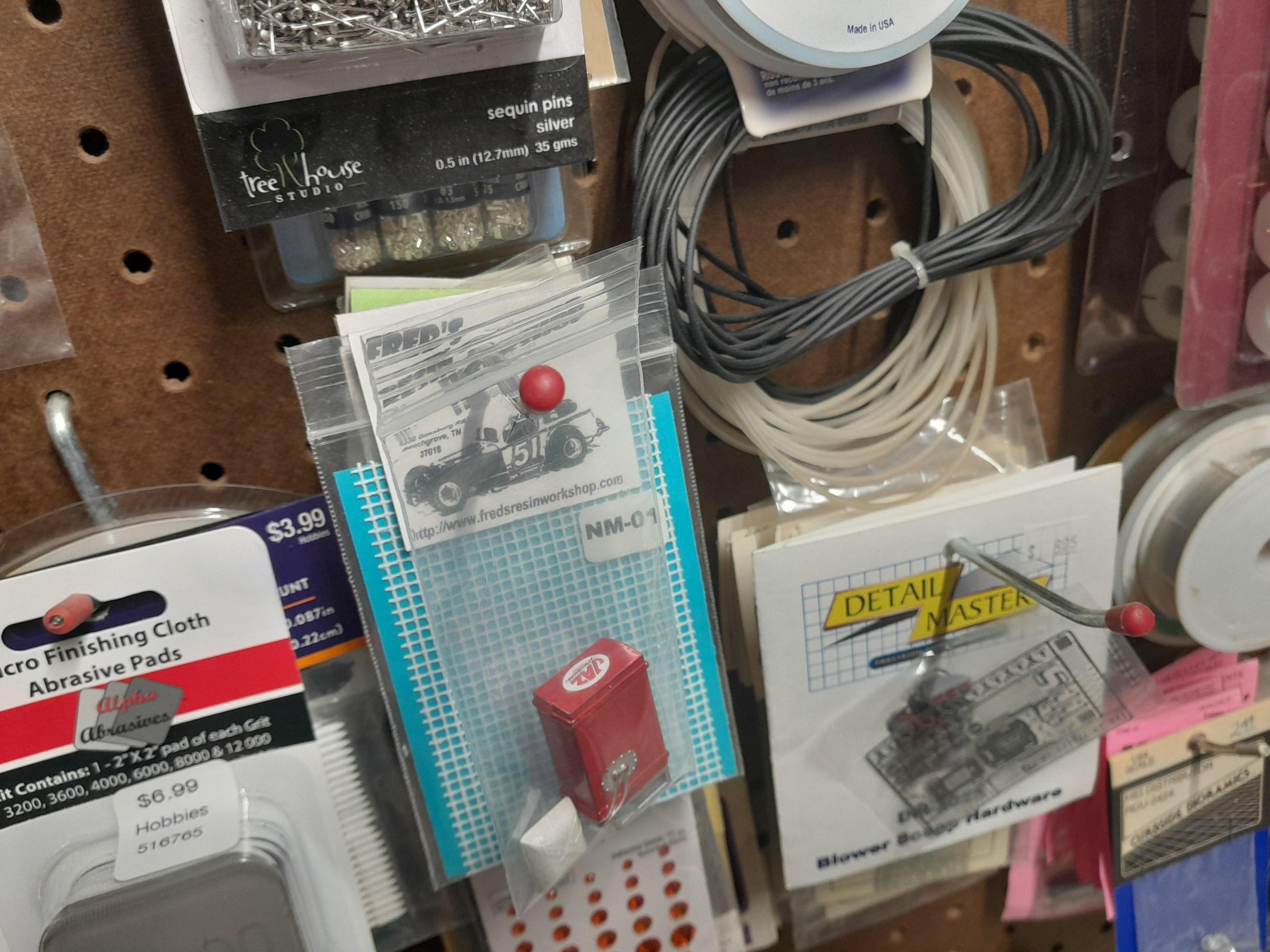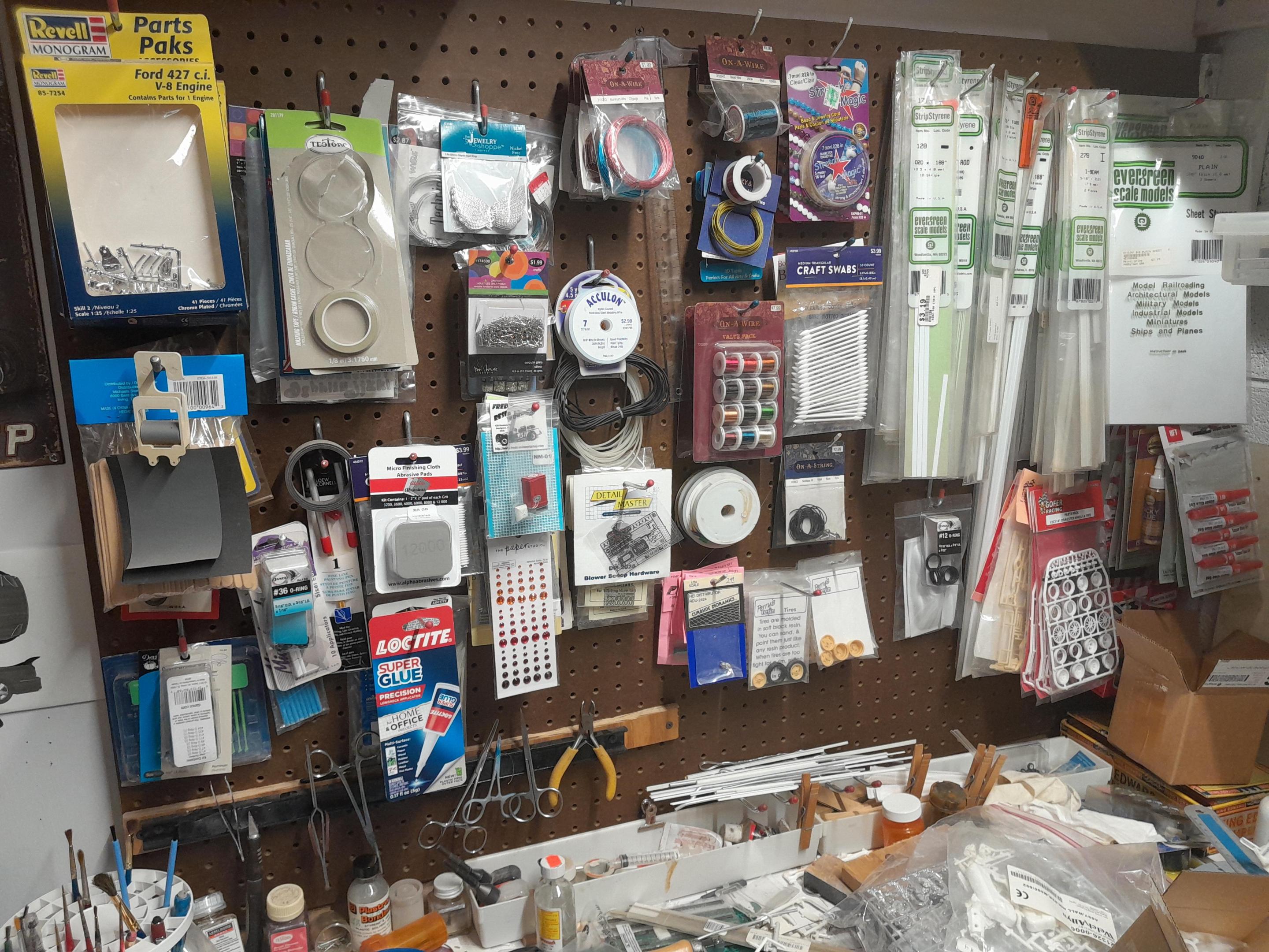 I have a pegboard wall above my workbench. When I built it I attached some 1'X1' wood strips to the wall so I would have clearance behind the pegboard for the hangers. Harbor Freight has a package with several different selections of hangers. I have my evergreen still in the packages hanging on the board along with different styles and colors of wire, resin parts, and many other items. My board is about a 4"X6" foot section.