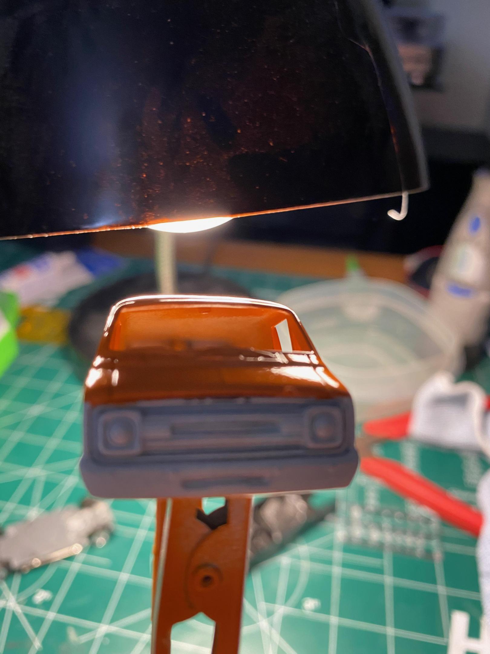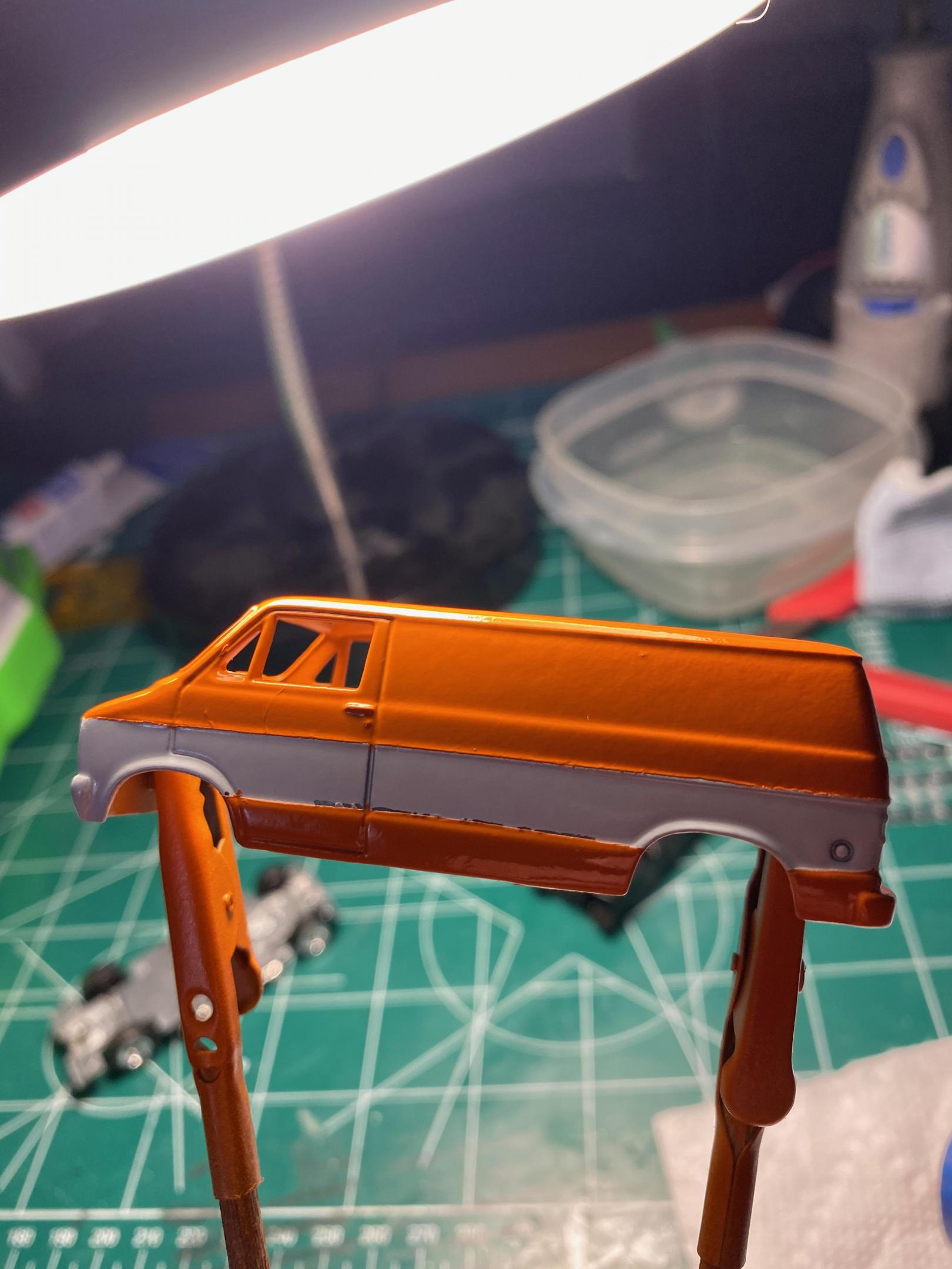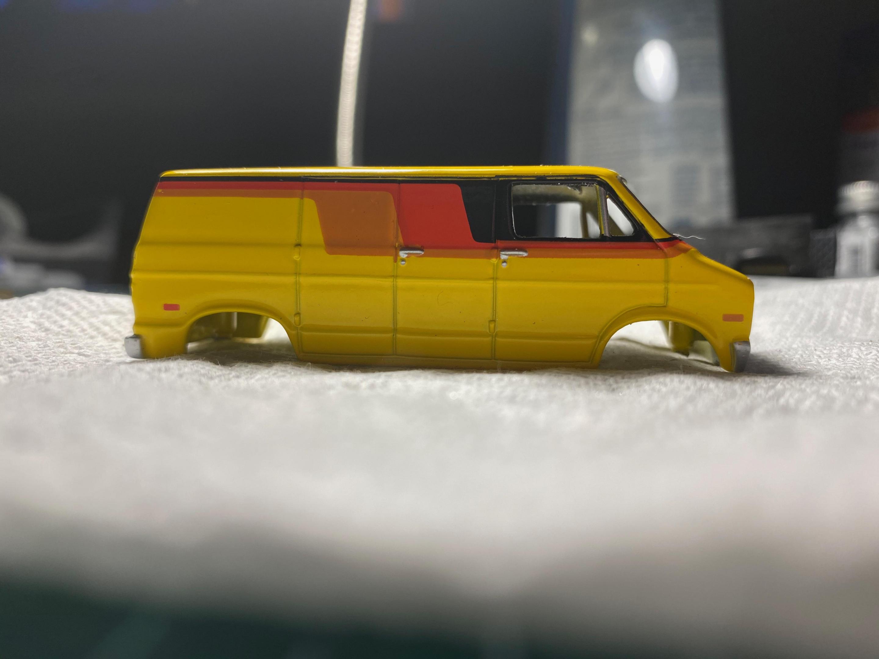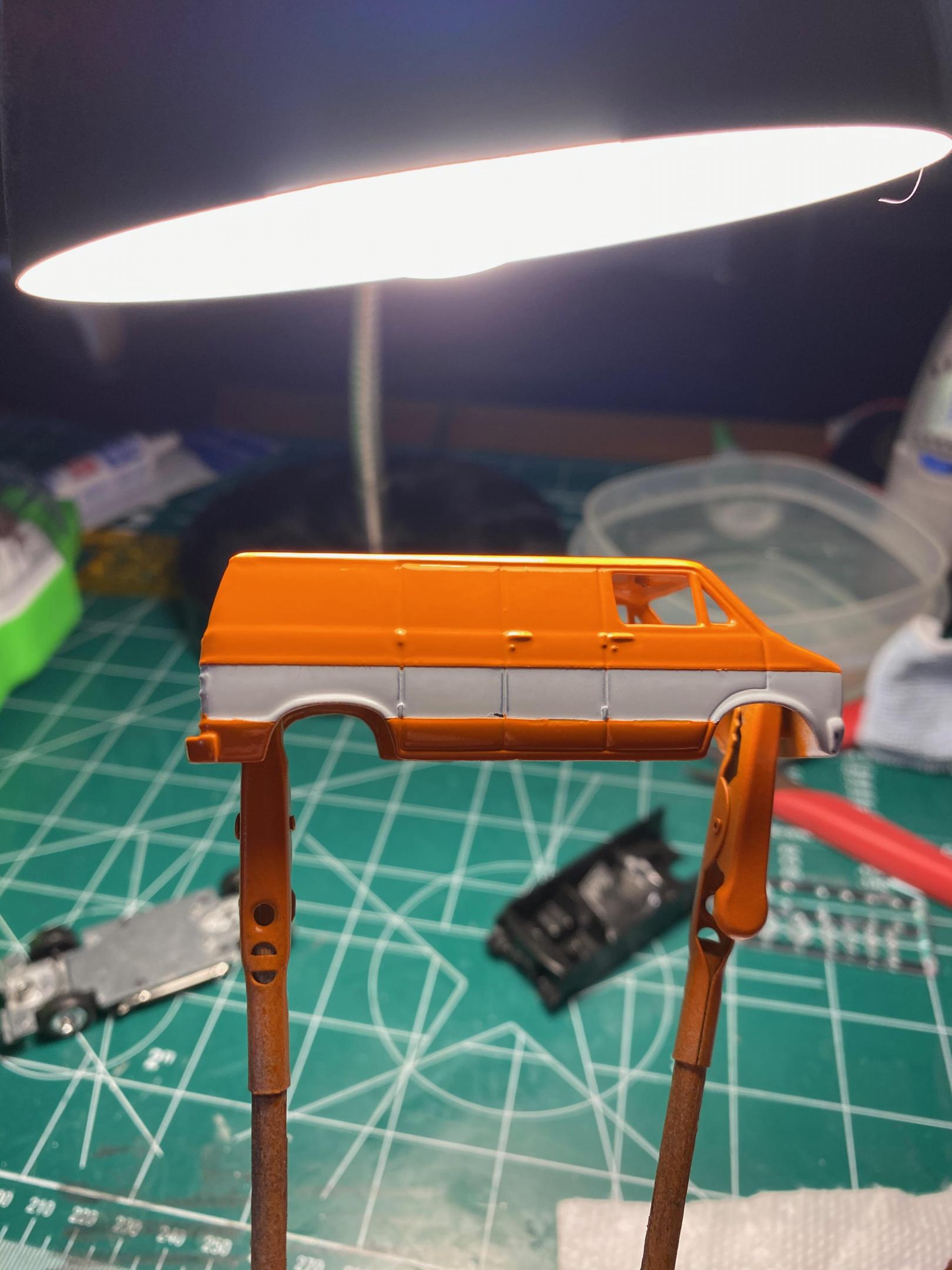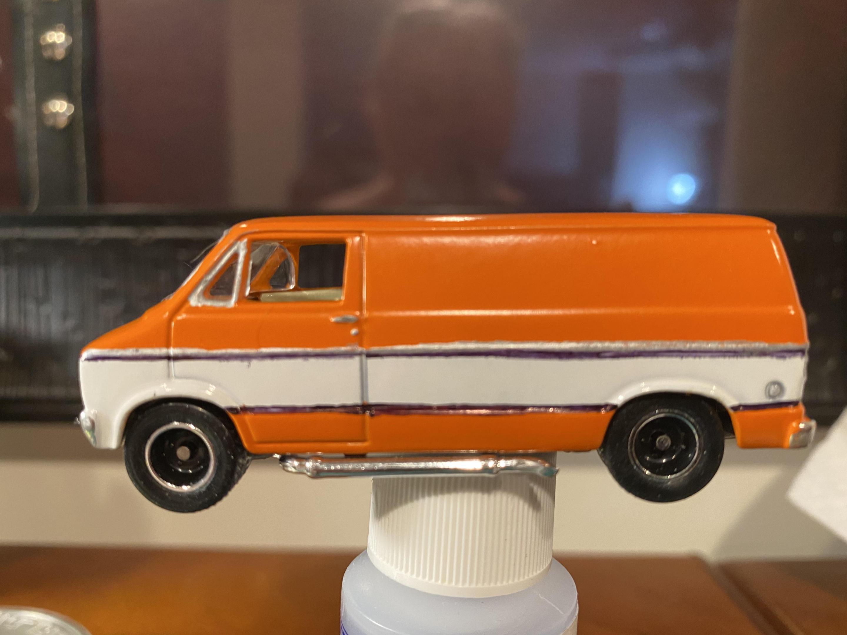Shot the white yesterday and forgot to take any pics. Taped off the main white stripe (small one is a decal) and shot the orange this morning. Came out amazingly well. No bleed-through at the doors and only minor edge issues. Those will be covered by black "trim" after everything has a chance to dry for a couple days.