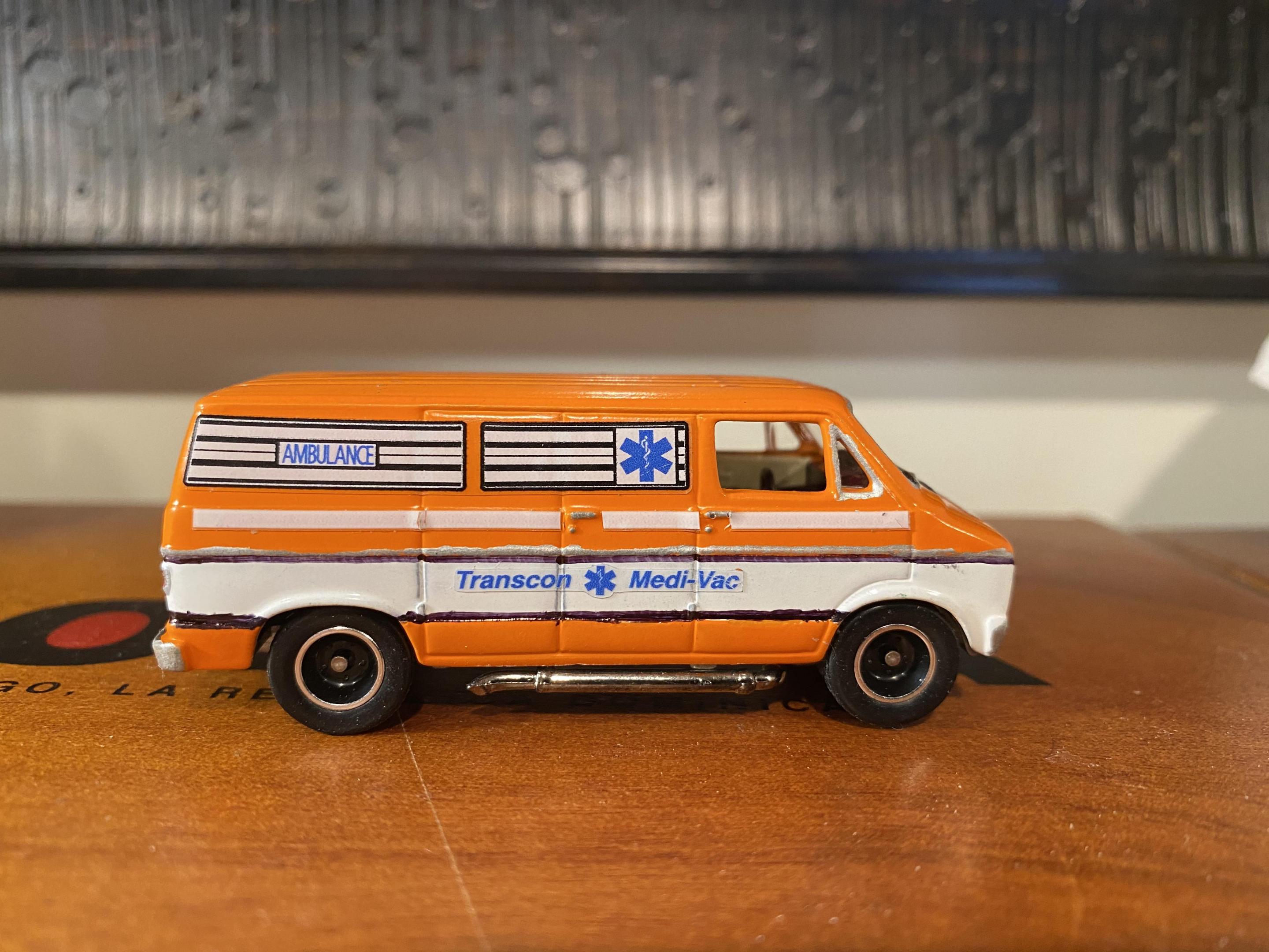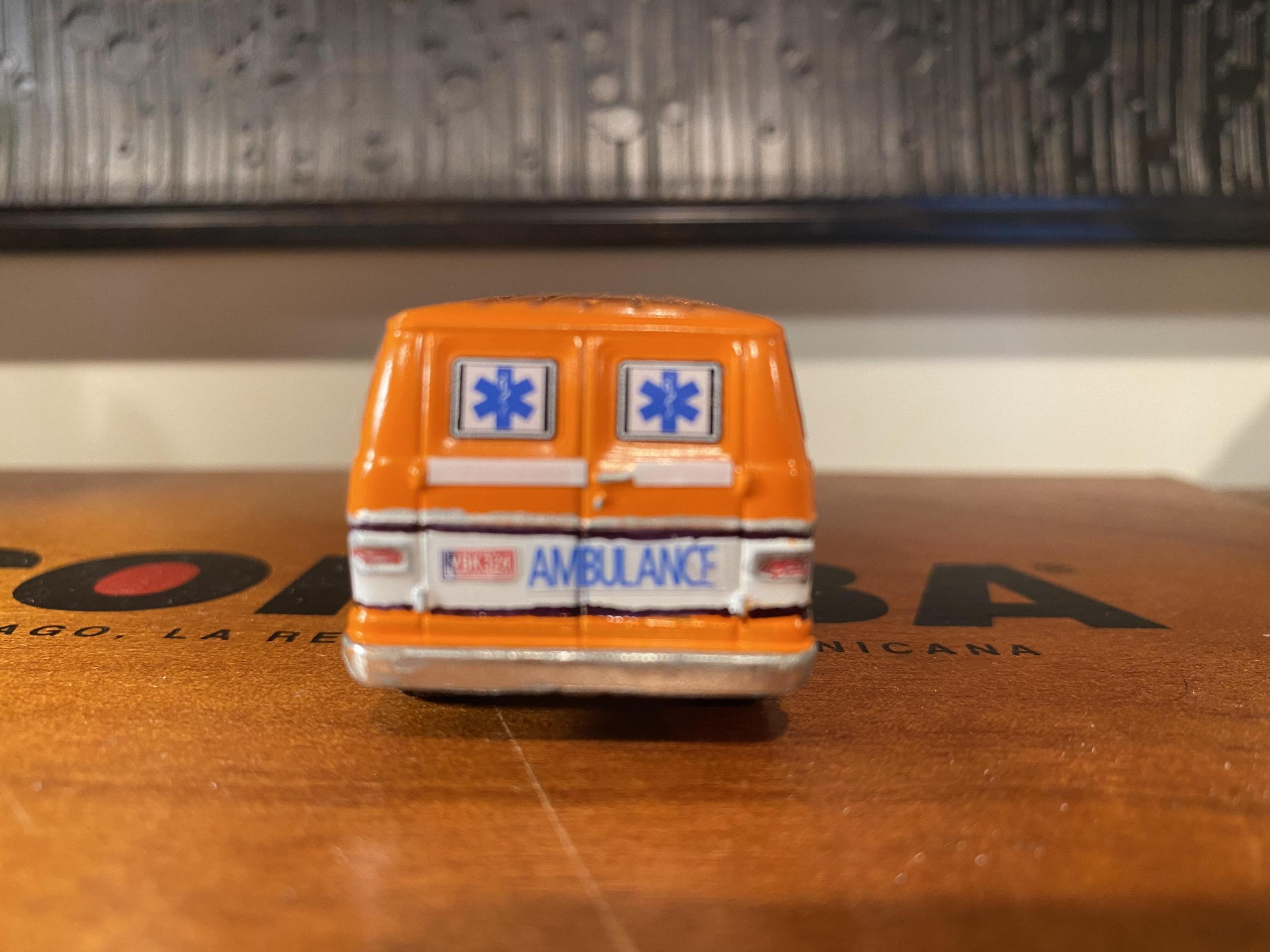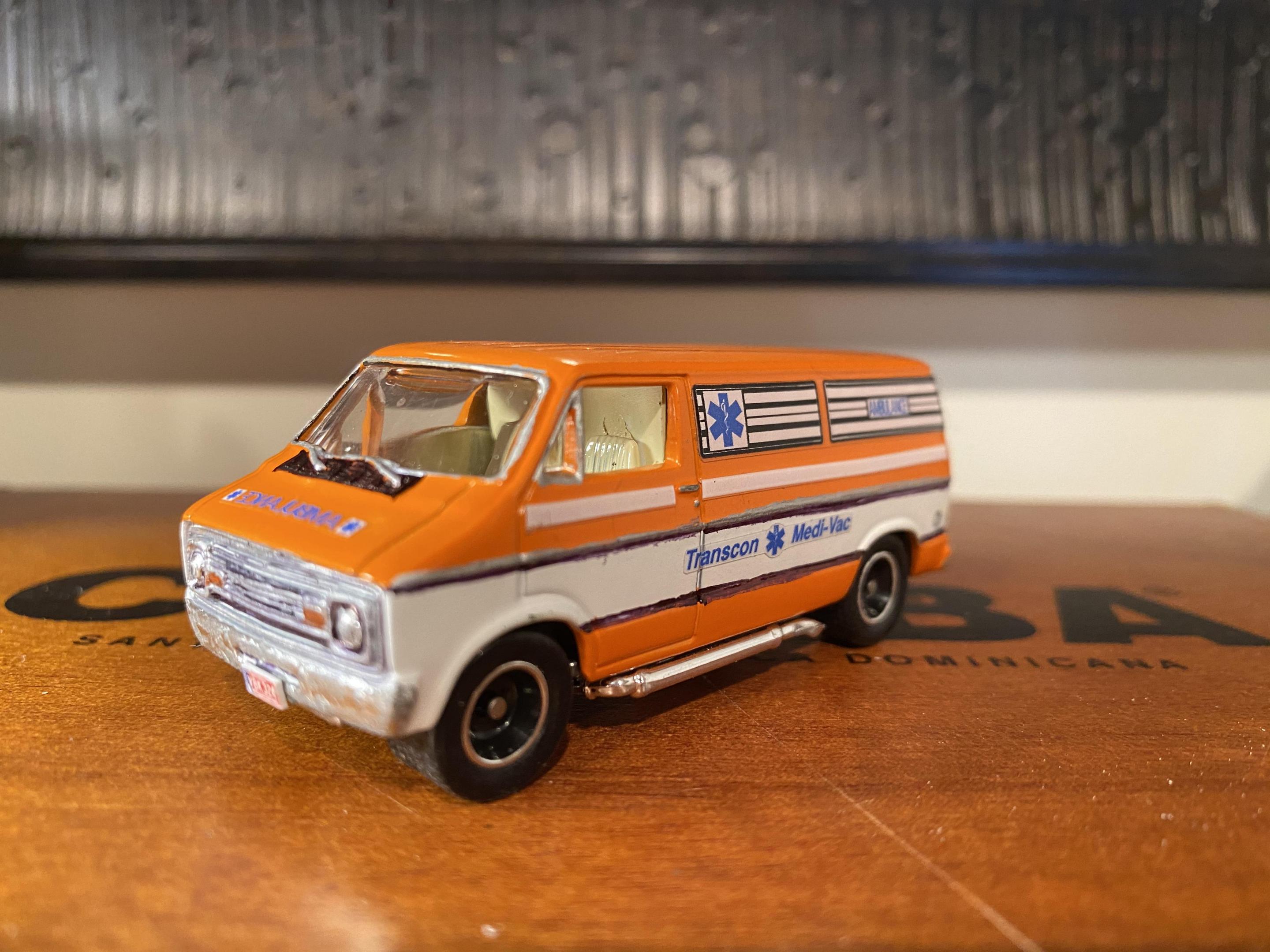 Now I know why I don't work on 1/64th. ?. Fiddly little things. However, I'll call it a win getting the rub strips on and decals (stickers) as well without killing anyone or throwing anything. Borrowed a set of Real Riders off of a "Rescue Ranger" that fir perfect. Left the chrome trim ring on there just for some contrast. Light bars should be here Friday and installed. As much as I wanted to trim the small stripe over the door handles, there just wasn't enough material. After going through tons of reference material on the real ambulance, I was surprised that there is a small piece of the thin stripe missing between the passenger door and slider. I did take just a little extra off behind the handle for the heck of it. I also spotted that the license plate are different from the movie. The van that was raced in real life had the Michigan Bicentennial flags plates, where the Burt Reynolds had just a dark blue tag. I've seen that movie so many times that the Mandela Effect apparently took hold. Looks great in my case and will look better when the lights get here!