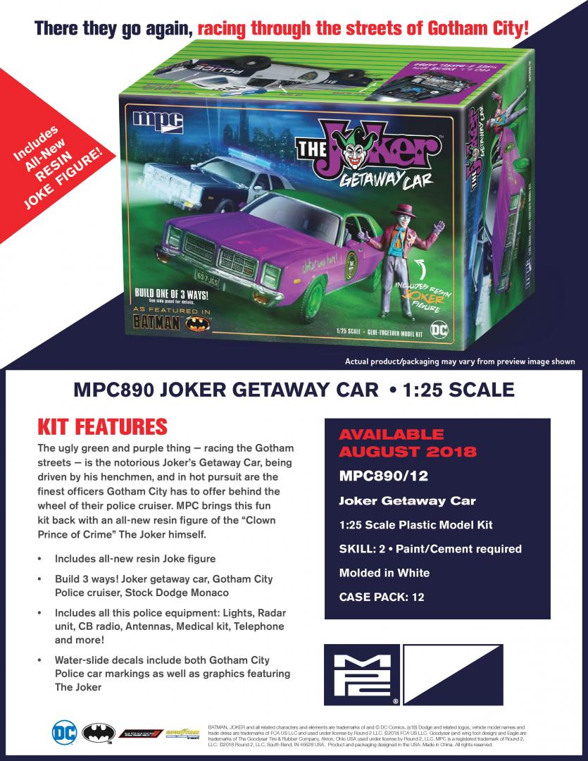 Pretty much the same kit as the Sheriff Roscoe's Police Car (MPC 707) reissued a few year ago, this time with new box art and a resin Joker figure. "Stock Dodge Monaco" might be a bit of a stretch with the super-deep steel wheels and matching tires, though...