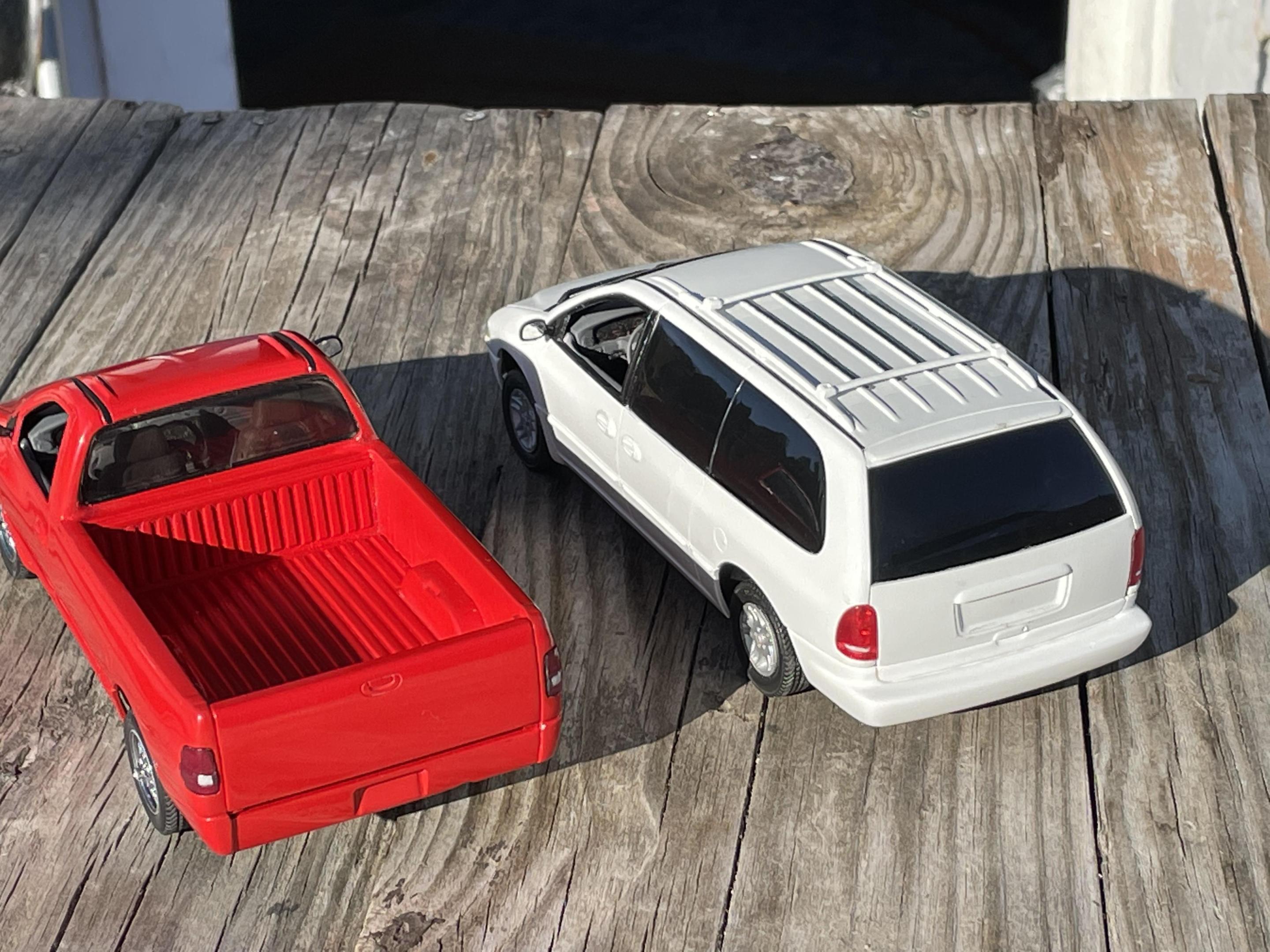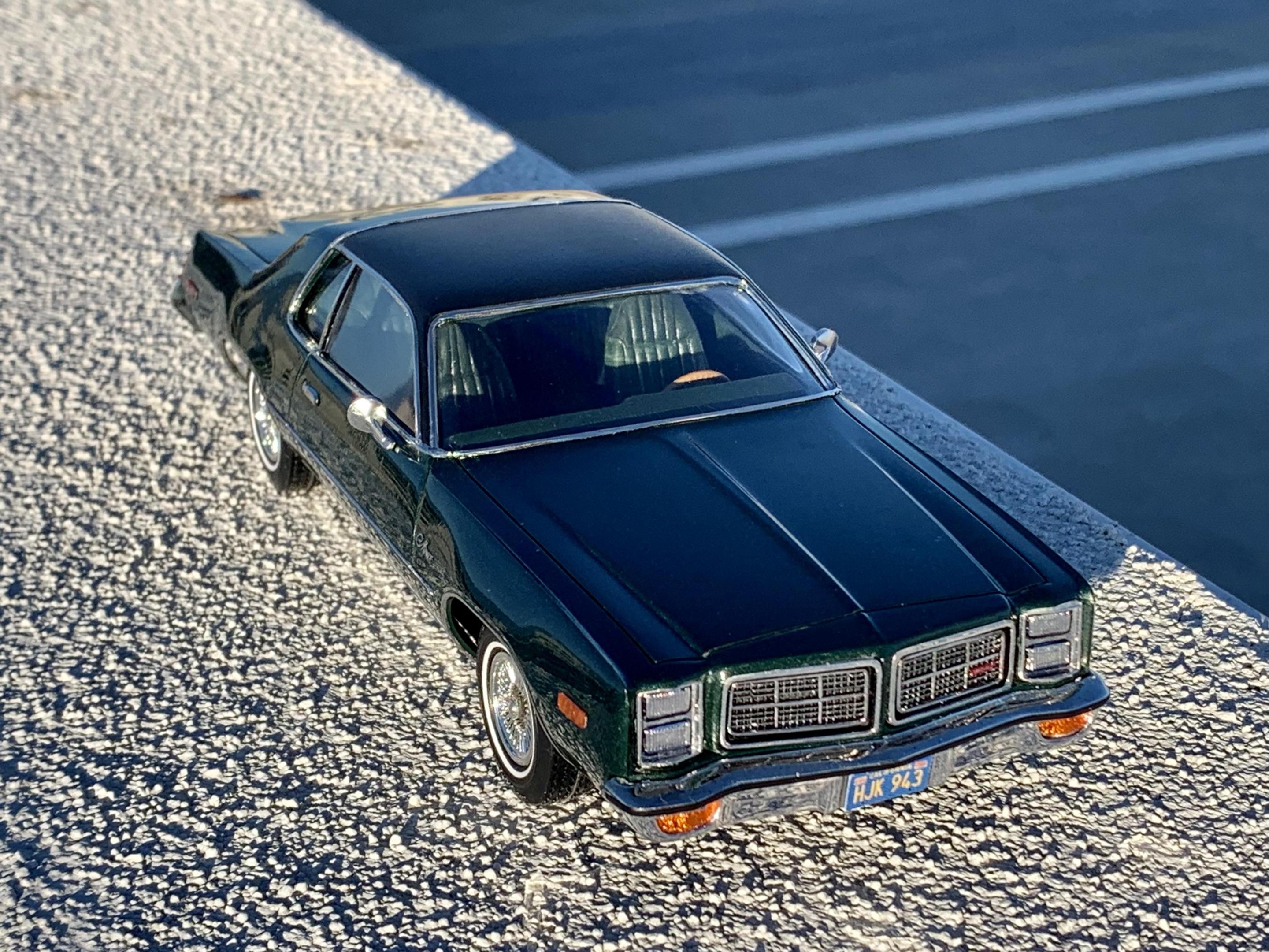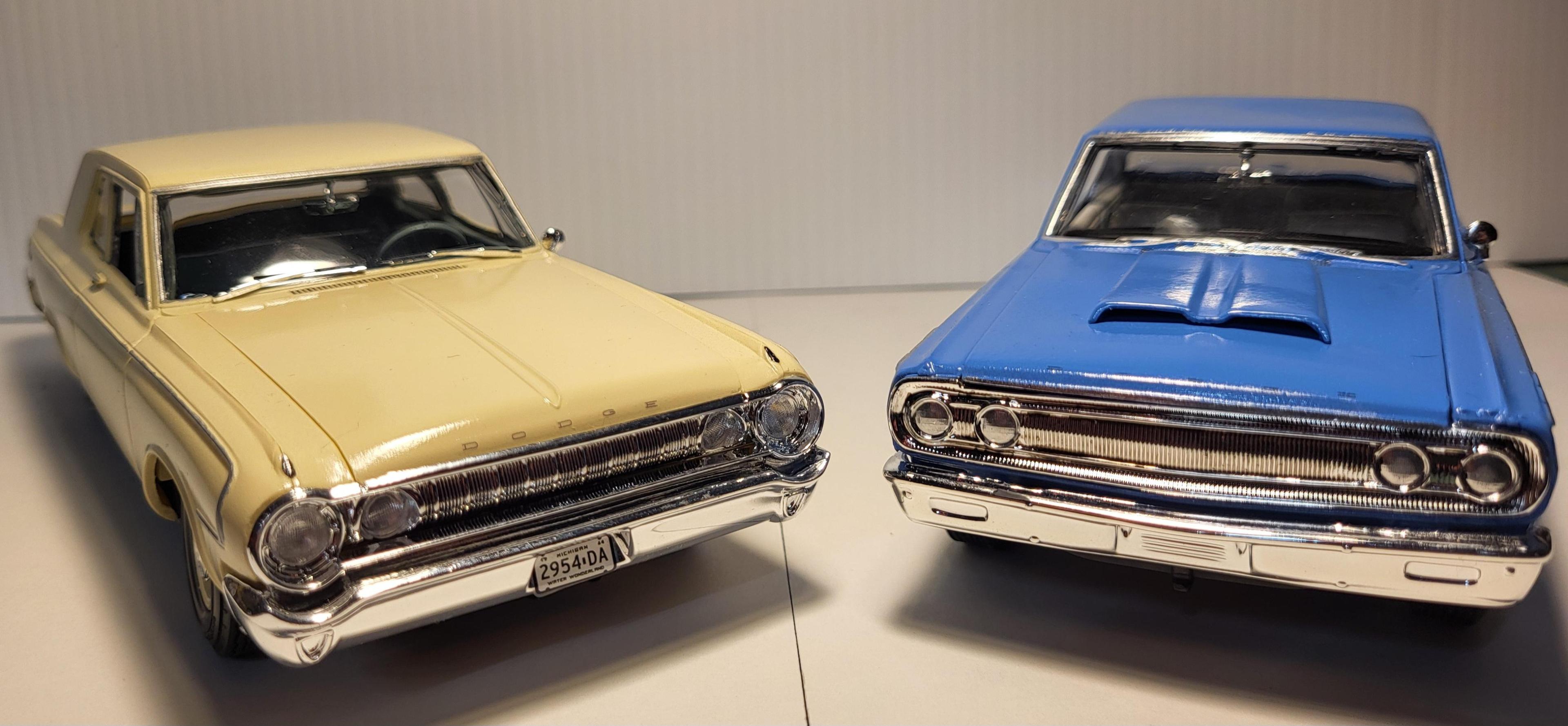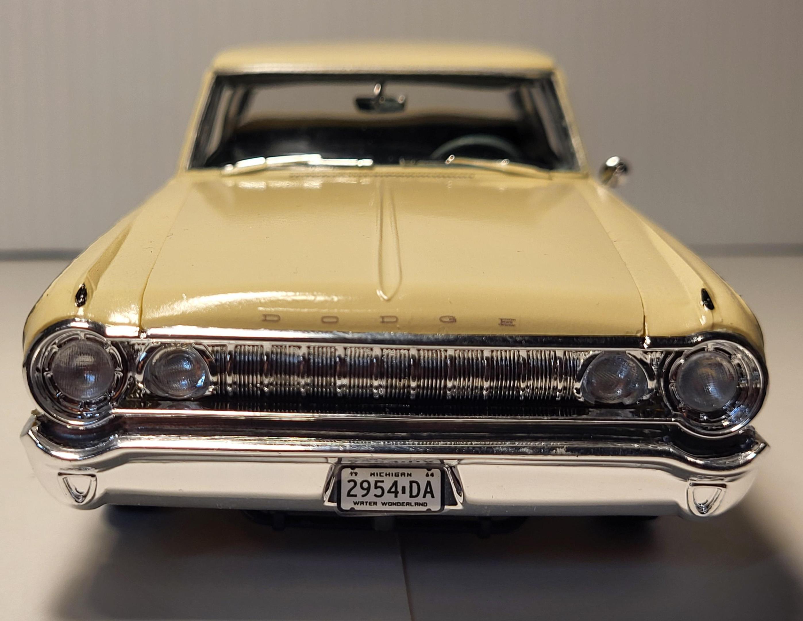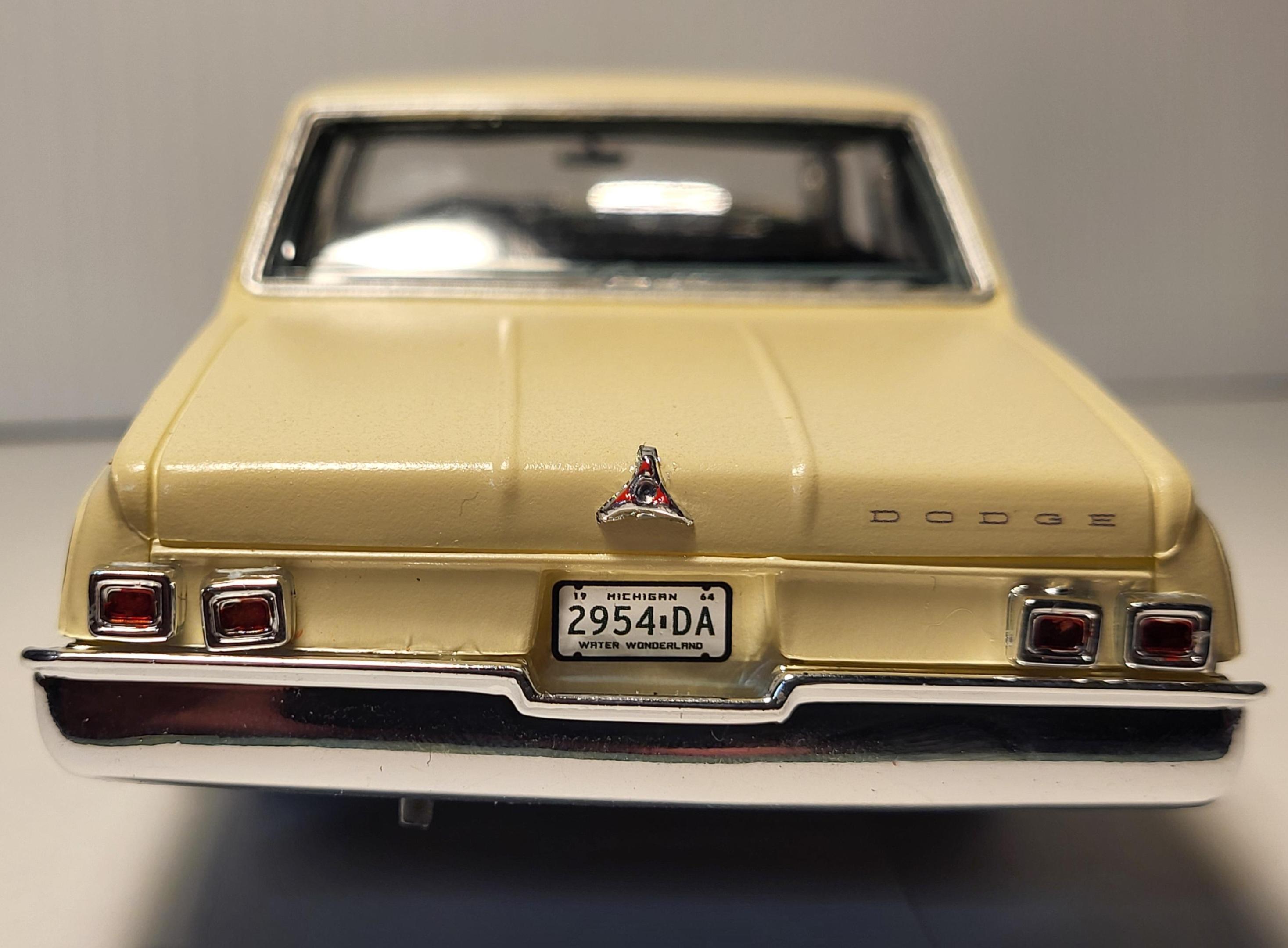 I recently finished up my Lindberg 1964 Dodge 330. This is the 2006 Lindberg reissue, and not the most recent AMT reissue. For the age of the kit, it went together quite well. Although I did have issues with my nemesis (radiator hoses), and the rear bumper gave me fits. Go figure. The vision for this build was that of a regular, every day, commuter car or “grocery getter”. Nothing fancy, just a good, all-around car. The build is box-stock, but I did use the dash decals, Dodge logos, & Michigan plates from the most recent (2023) AMT kit. Color is Dupli-color Santa Fe Tan with a Tamiya Light Blue XF-23 interior. The Leaning Tower of Not Much Power: Coincidentally, I finished this Dodge exactly two years to the day of when I finished the AMT 1965 Dodge Coronet 500 (also a Lindberg kit):
