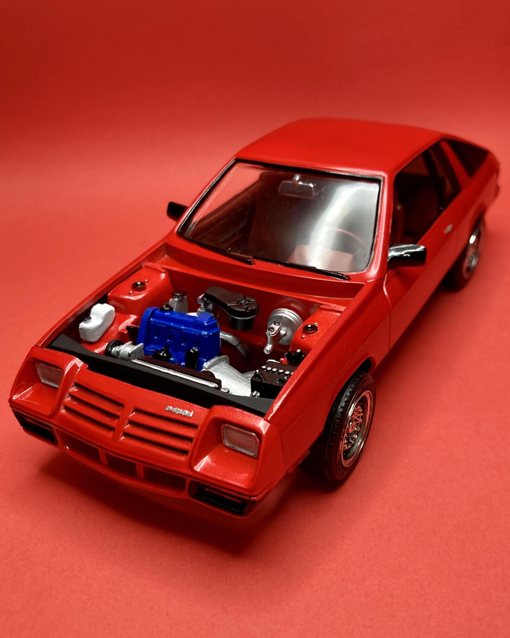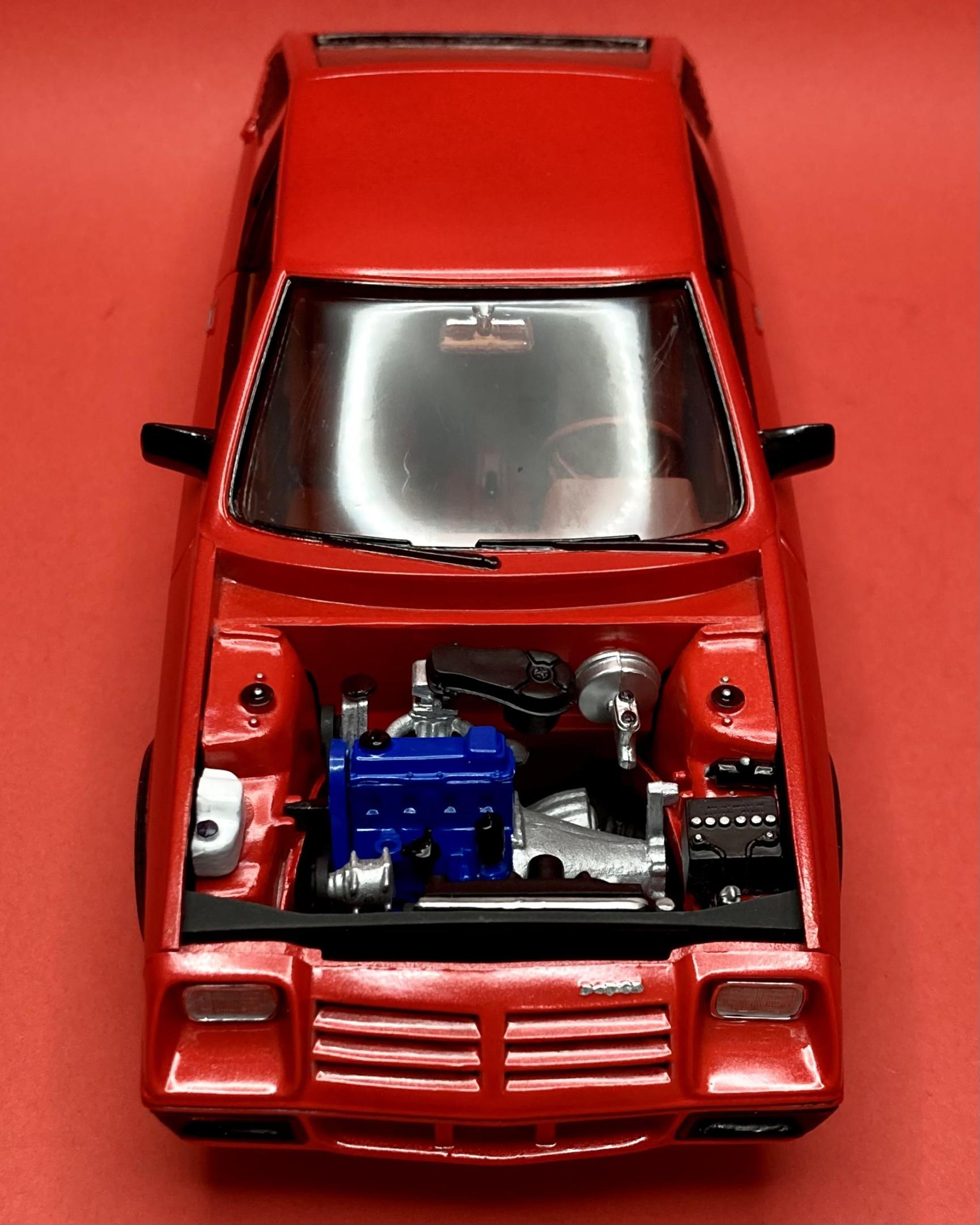 Here is my latest build, MPC’s 1980 Dodge Omni 024, from the “Silver Bullet” box art release. I built it box stock, with the lower front grille scribed open. This is a neat little kit that goes together very nicely. My only issue was the final fitment of the hood. I think if you cut down the radiator support and radiator the hood will sit better, but I didn’t want to risk breaking anything so I left it alone. Body is painted Tamiya Mica Red over pink primer, and the interior is Tamiya Dull Red. Dull red looks more brown in person than the dark red it shows in pictures but I’m happy with the look. Thanks for looking!