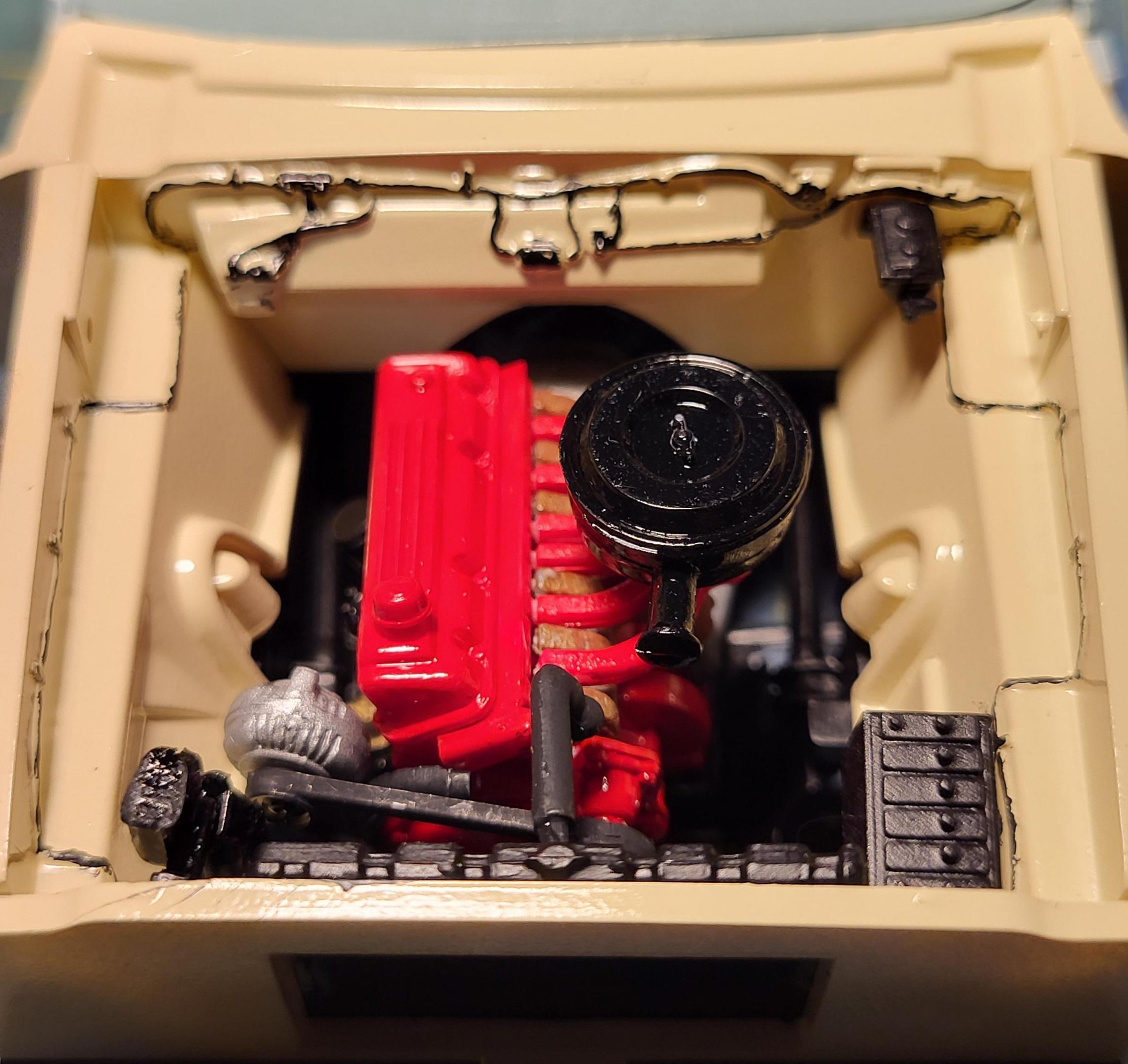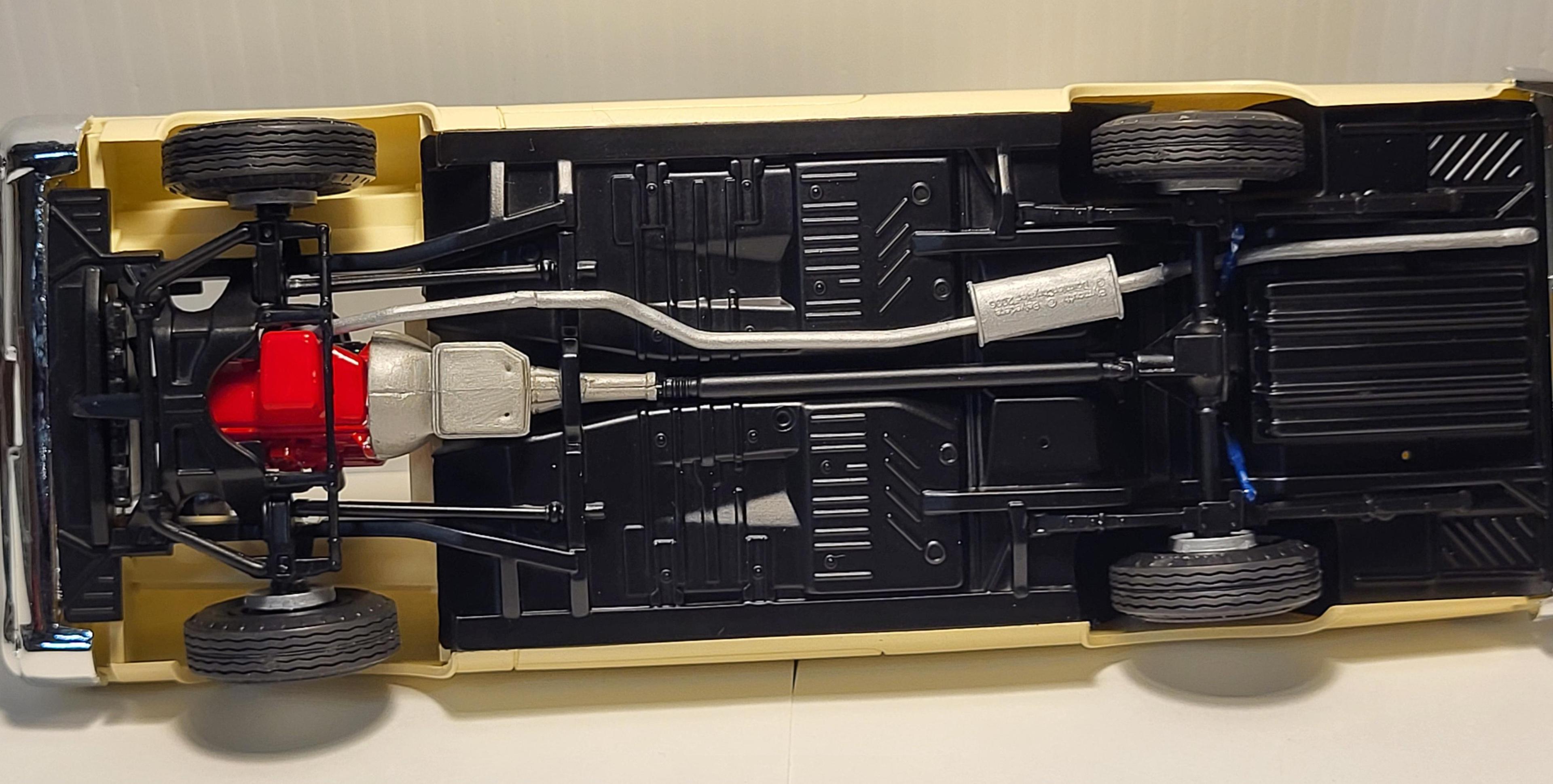 Started working on this one last week. I got as far as trying to put the front wheels on when I thought to myself, "these plastic pins are a pain. Plus, that engine doesn't look at all good." I went to my model supply cabinet and broke out an AMT 68/69 RR/GTX kit for the frame. I raided a Revell 68 Charger for the engine and am using a B-N-L resin torque flight tranny for the build. How does that AMT frame fit you ask? Very well thank you. I just had to do some minor sanding on the radiator support and firewall to get them to fit properly. I selected the Keystone mags from the Revell 68 Charger kit and the redline tires from the new 68 GTO kit. I am also using the rear axle from the Charger kit since it looks better than what AMT gives us in the 68/69 kits. I still have to play with the location of the rear axle so the wheelbase is right, but here is how it looks right now. Basic engine is done, just needs all the accessories glued on it. Here is how it looks inside the engine compartment. Chrome valve covers are from the Revell 68 Dodge Dart kit. Thanks for looking.