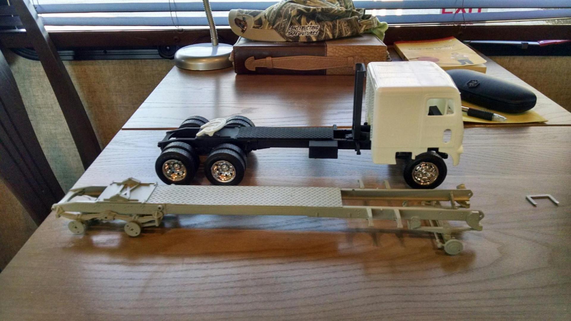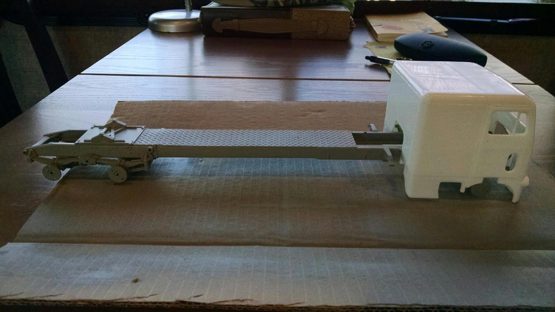Getting back into it after many years. Started when I was 10 and bought several kits around $12 each to make 1 rig. Always 1/25 scale because that was all we had. Got out of it in my late teens and now back at 50. Pricey now compared to then..... My intro back into it is a pair of Freightliner COE's stretched pulling 53' reefer trailers. I am well underway with the first one with the frame for the second beside it to show the contrast. I still have sanding to do and fix a few glitches. They will have the appearance of 2 distinct rigs with personal driver preferences like Owner Operator rigs. I have seen some amazing builders on here and YouTube that have me a bit embarrassed to post.....but I love this stuff. More pics to come as it progresses.
