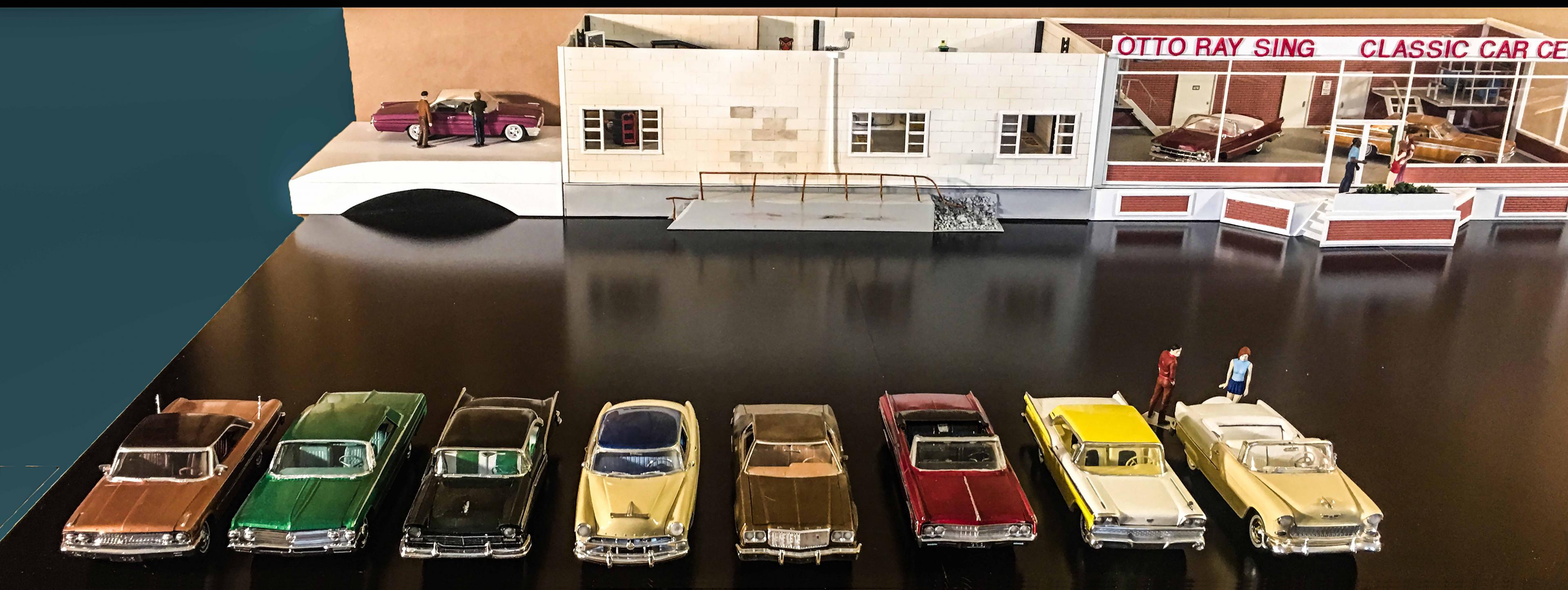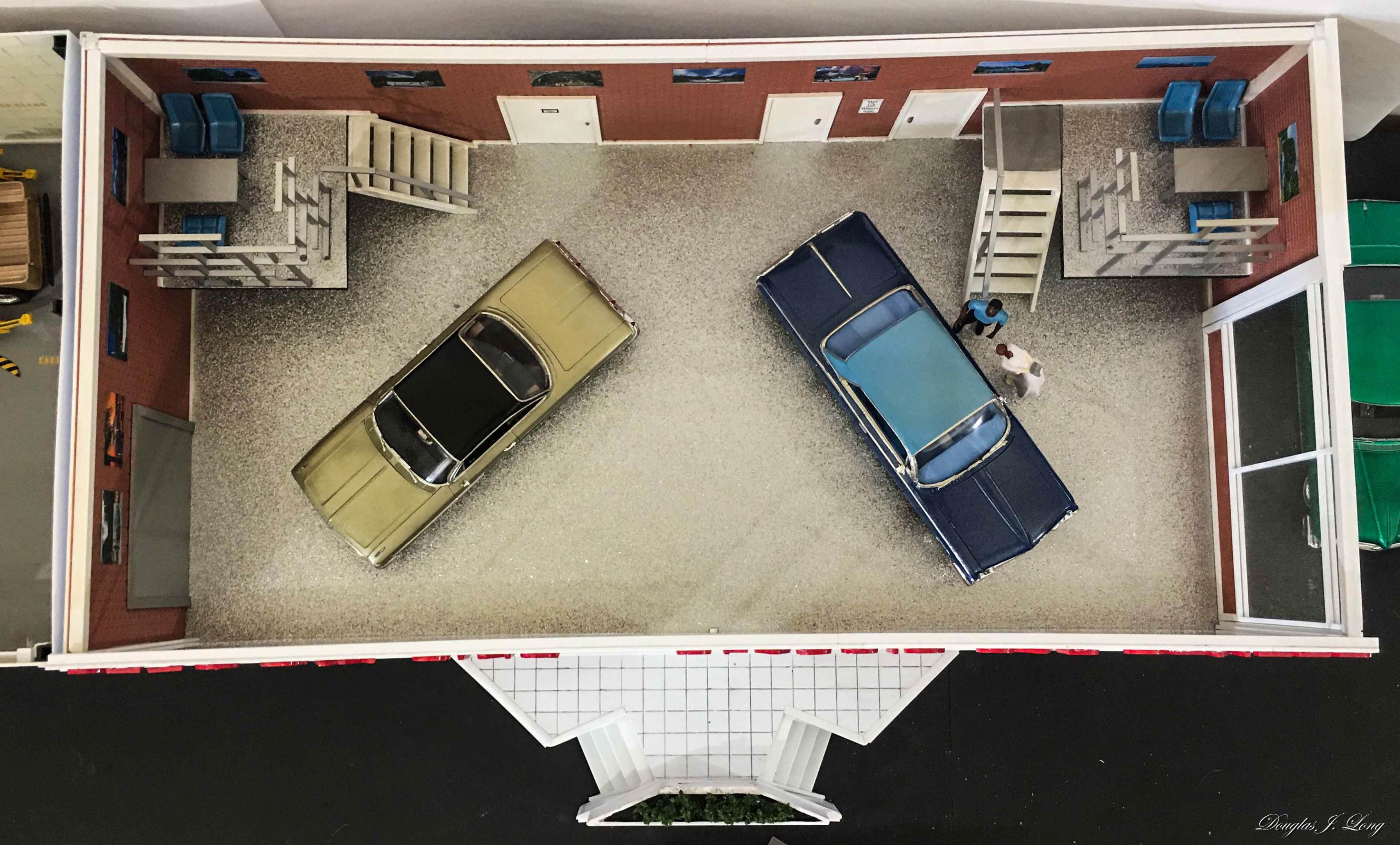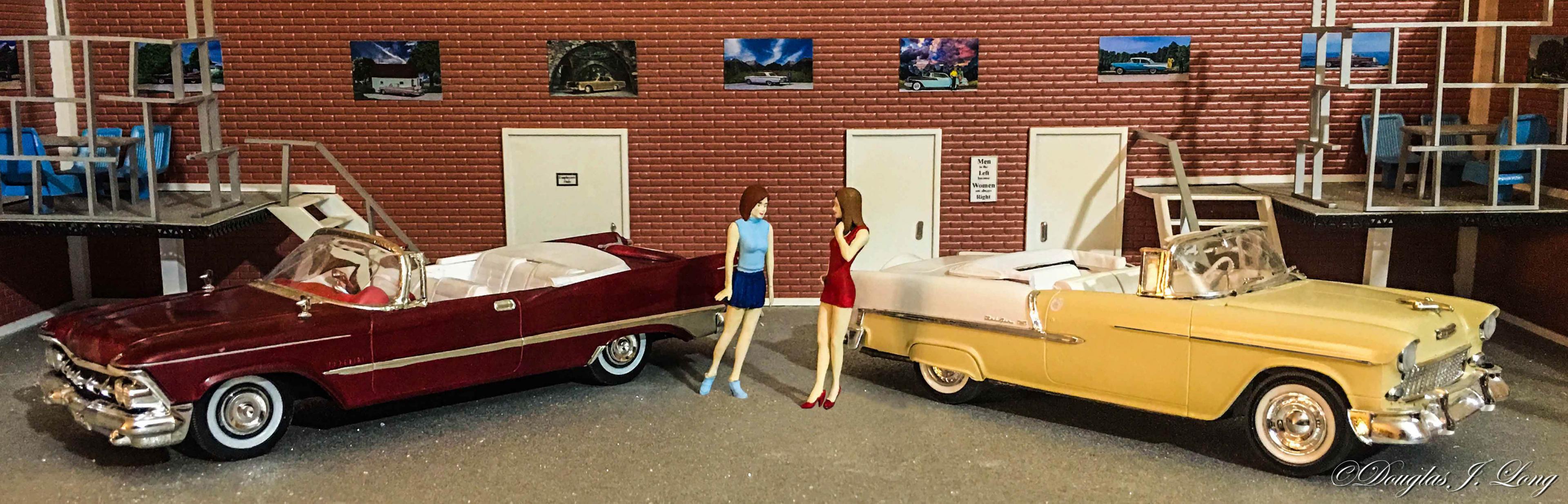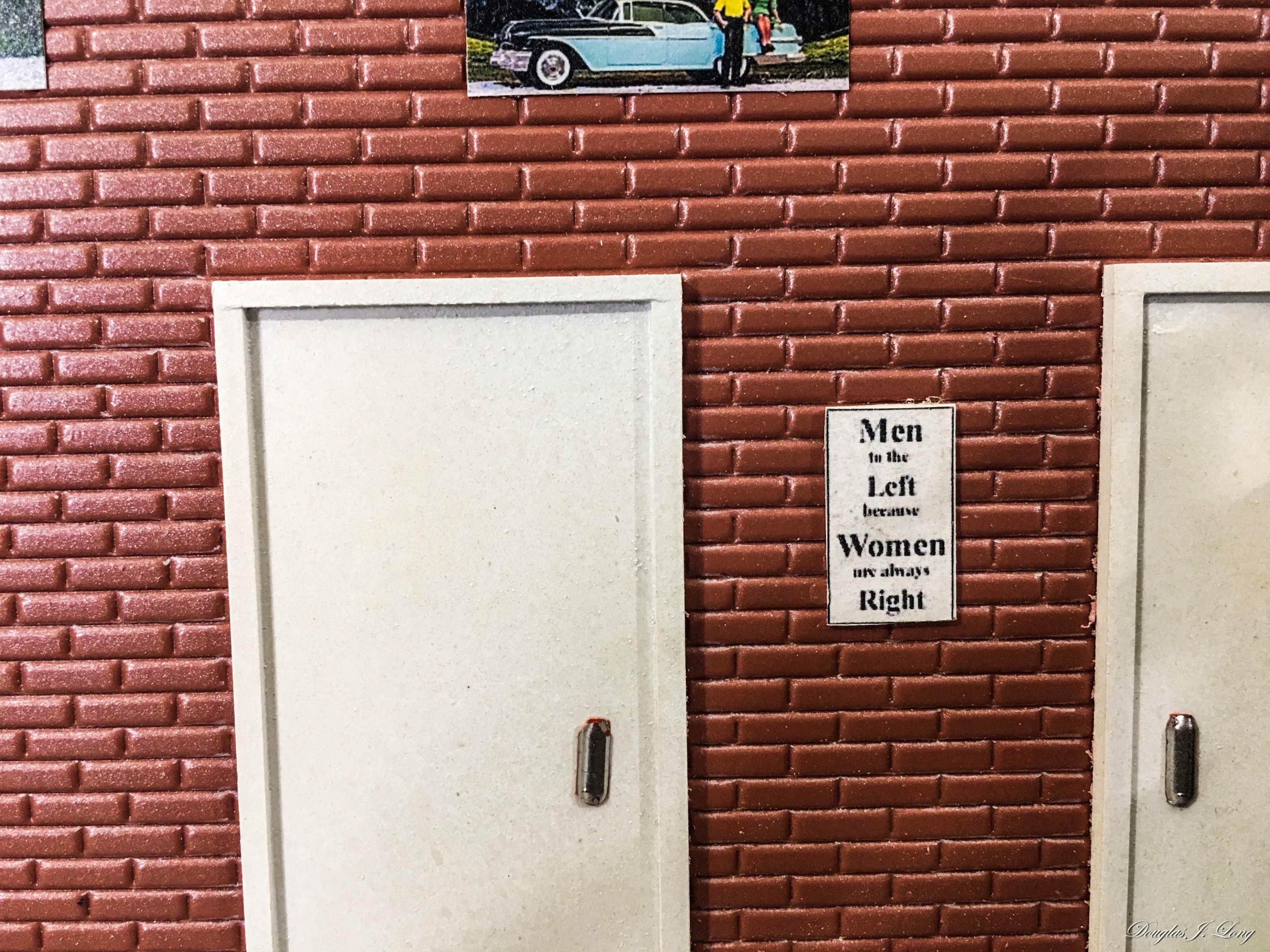 Welcome to the current Otto Ray Sing Classic Car Center. After rather humble beginnings, and now under new ownership, the business has expanded and become even more efficient. The garage area is much larger than the previous versions, and results in more efficient repairs, as well as increased customer satisfaction. The show room is large enough to display three cars. It follows the mid-century modern theme and allows customers to view their dream cars at all times.. The dealership is inviting and always stocked with beautiful cars to please any taste. Actually, there is one detriment. In front of the garage is a cement walkway, that has so far, resisted all attempts to remove it. These two workers will attest that it is much easier to stand around and look at it, than it is to perform the exercise in futility of trying to remove it. Management had a sense of humor when they put up the restroom signs. The entryway to the showroom was also well thought out to draw customers eyes to the vehicles found within. A classic car is always in view while approaching the building. This is what I call a 'photographic diorama', as the purpose is for it to be able to have scenery, vehicles, & figures changed to suit the needs of the vehicle being photographed. I will be adding a history to this as well as introducing figures, etc, if there is interest.