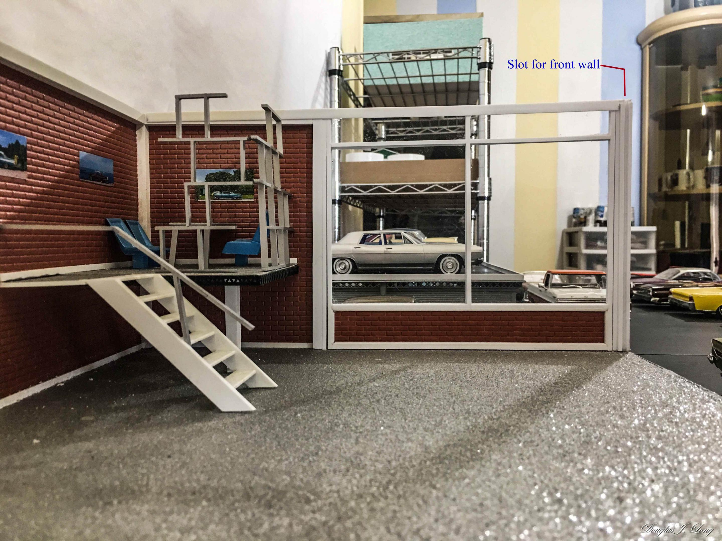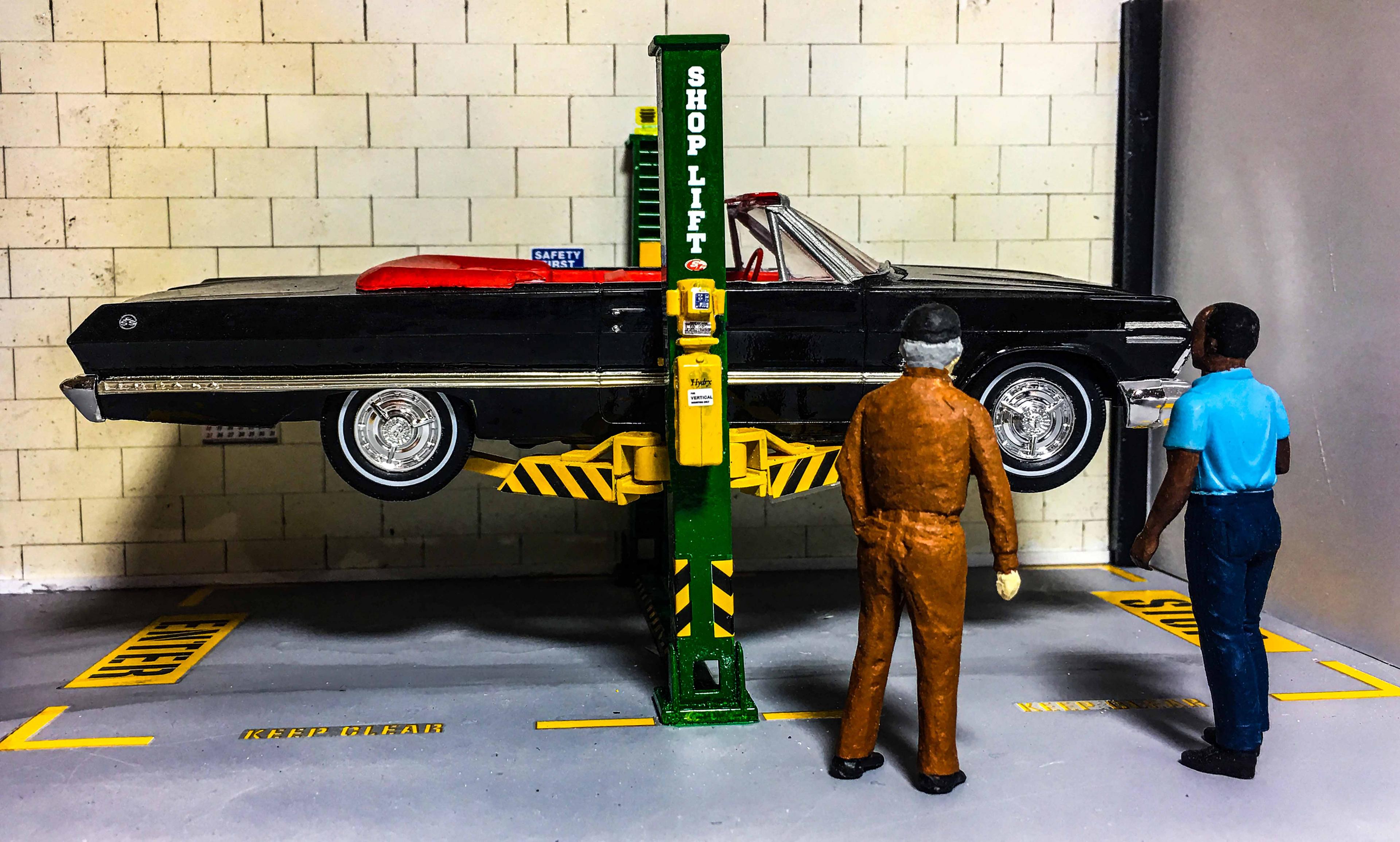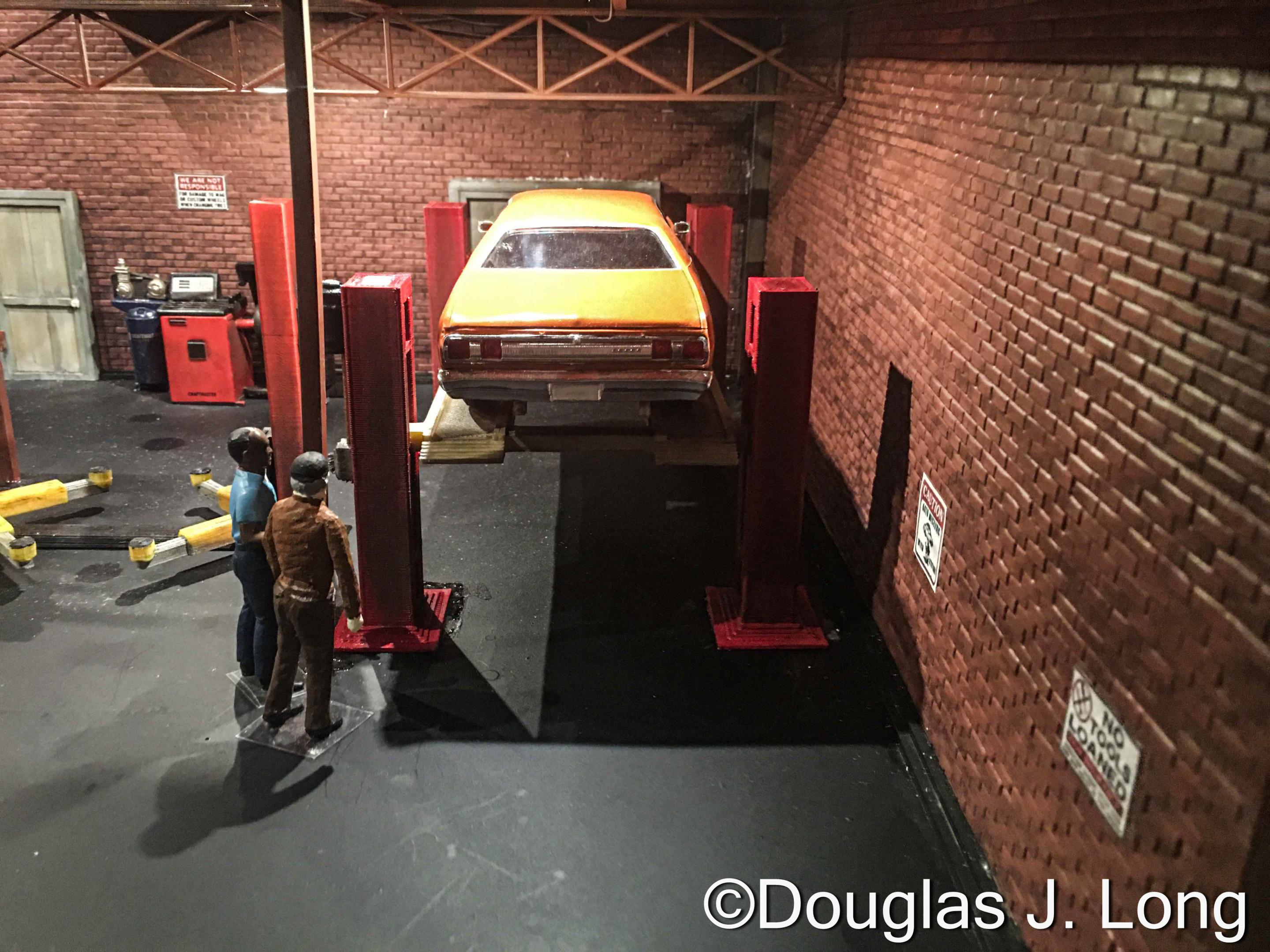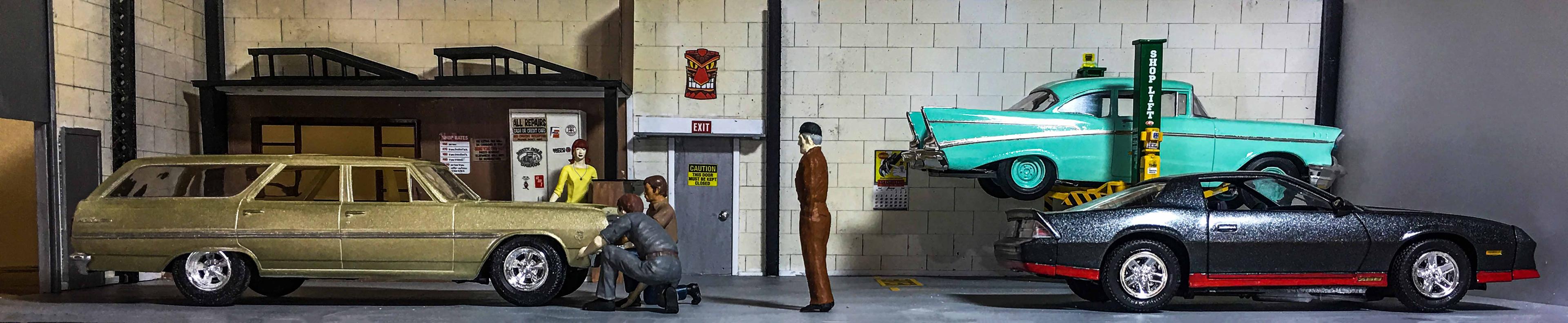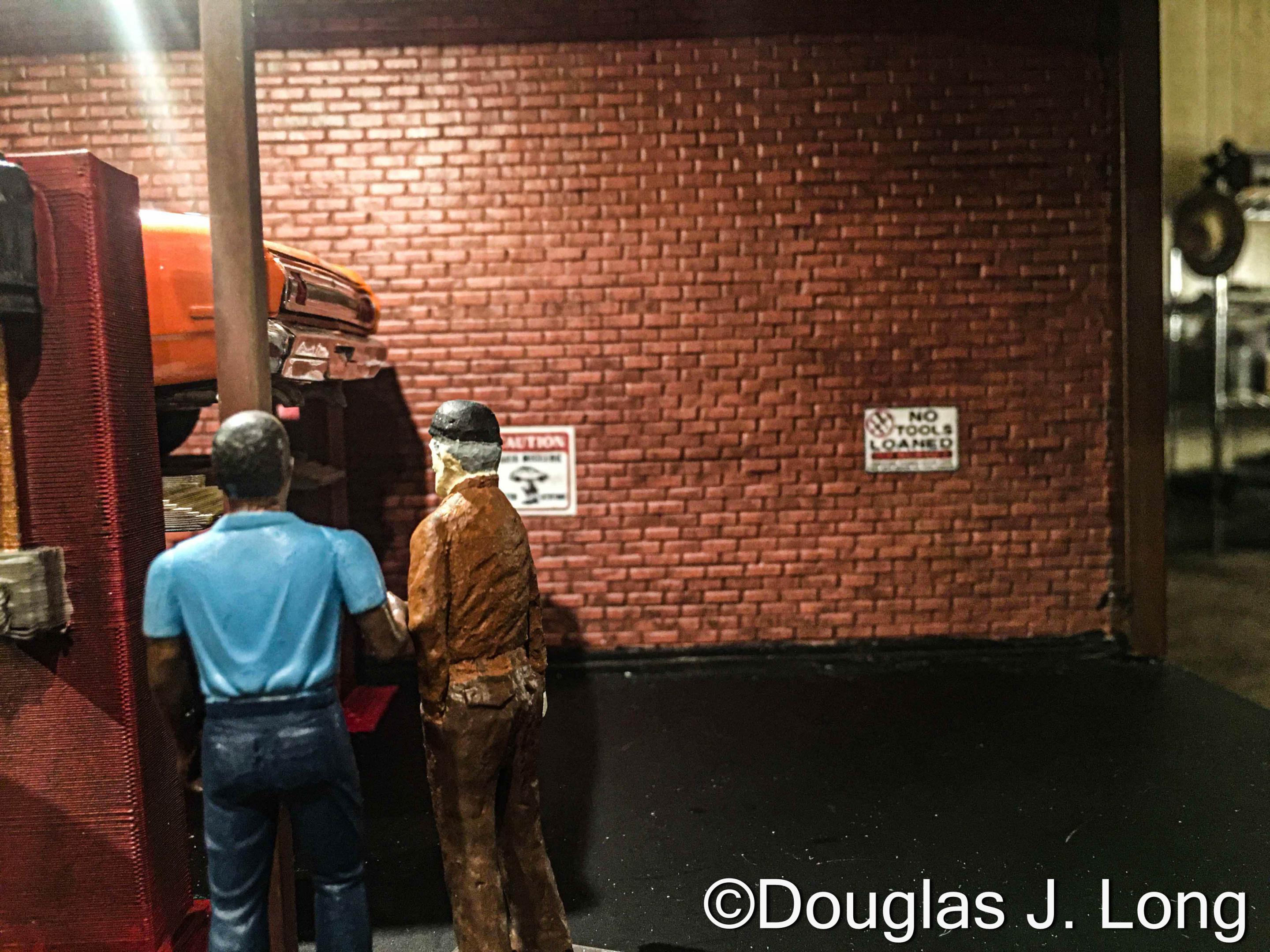 Welcome to the current Otto Ray Sing Classic Car Center. After rather humble beginnings, and now under new ownership, the business has expanded and become even more efficient. The garage area is much larger than the previous versions, and results in more efficient repairs, as well as increased customer satisfaction. The show room is large enough to display three cars. It follows the mid-century modern theme and allows customers to view their dream cars at all times.. The dealership is inviting and always stocked with beautiful cars to please any taste. Actually, there is one detriment. In front of the garage is a cement walkway, that has so far, resisted all attempts to remove it. These two workers will attest that it is much easier to stand around and look at it, than it is to perform the exercise in futility of trying to remove it. Management had a sense of humor when they put up the restroom signs. The entryway to the showroom was also well thought out to draw customers eyes to the vehicles found within. A classic car is always in view while approaching the building. This is what I call a 'photographic diorama', as the purpose is for it to be able to have scenery, vehicles, & figures changed to suit the needs of the vehicle being photographed. I will be adding a history to this as well as introducing figures, etc, if there is interest.