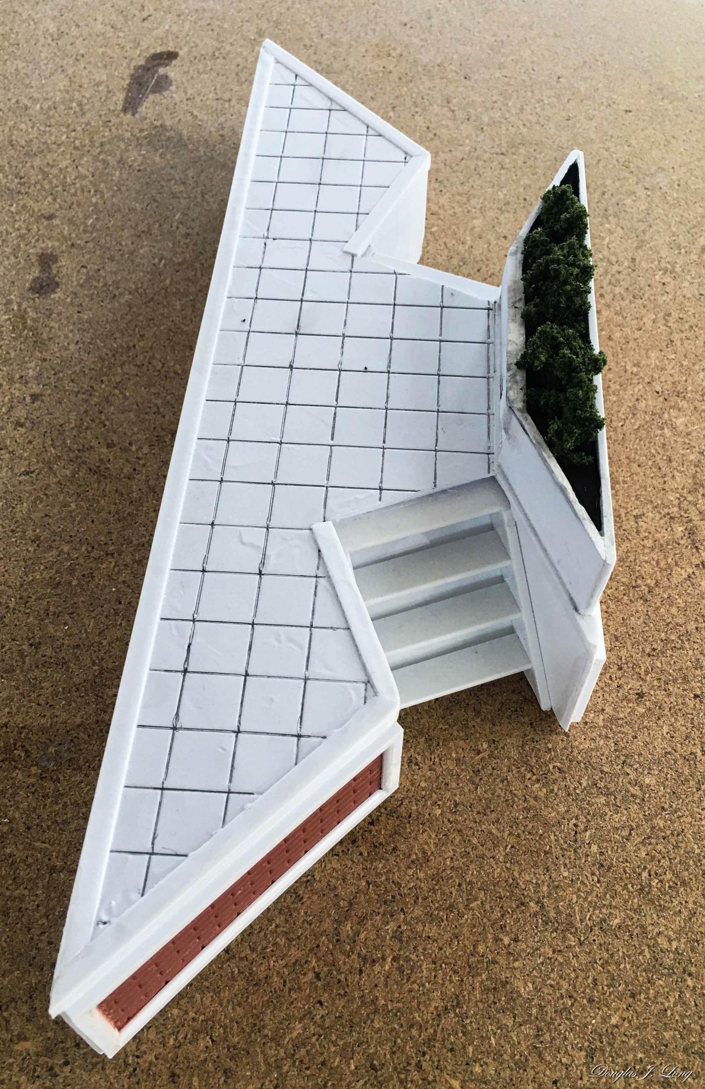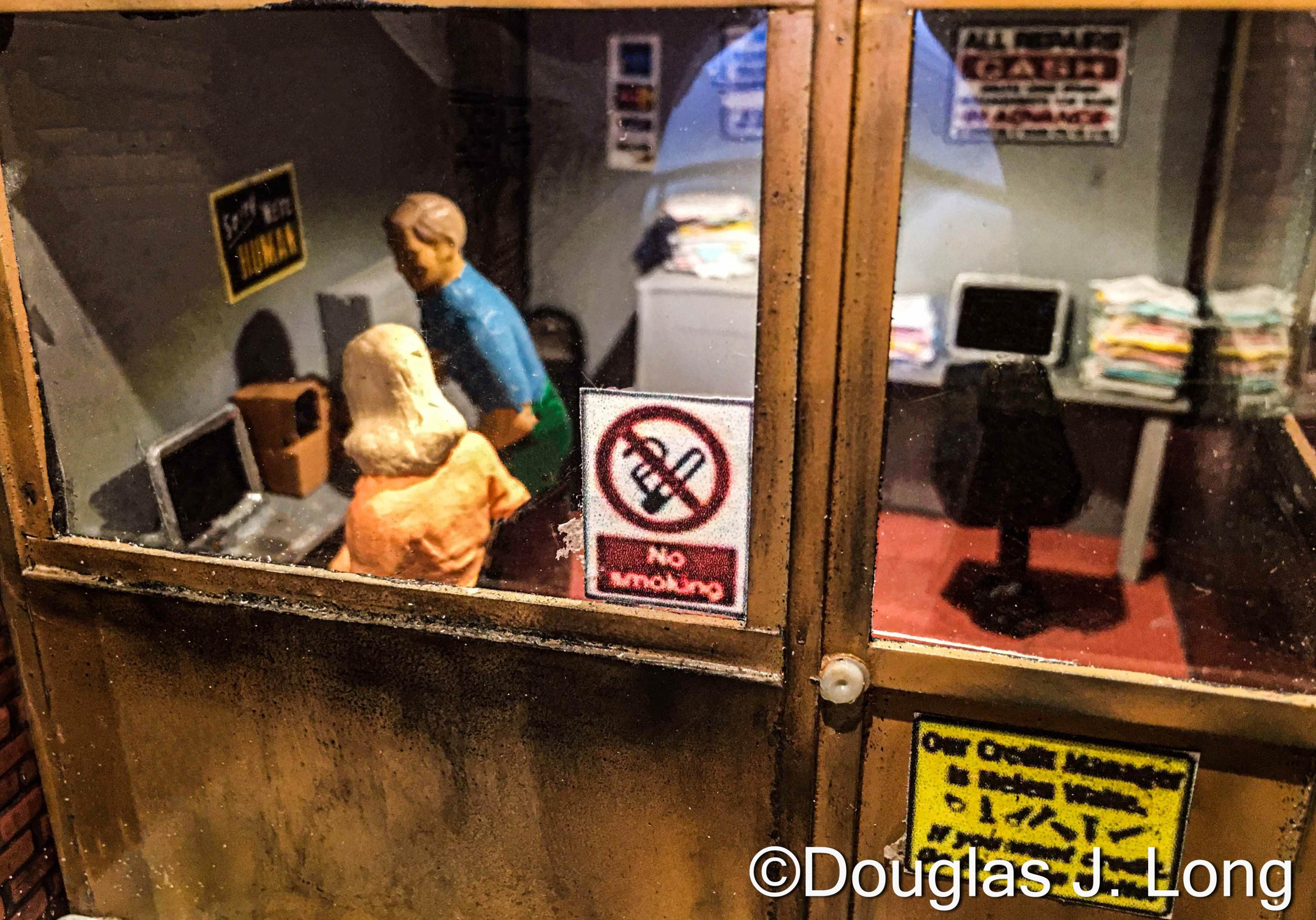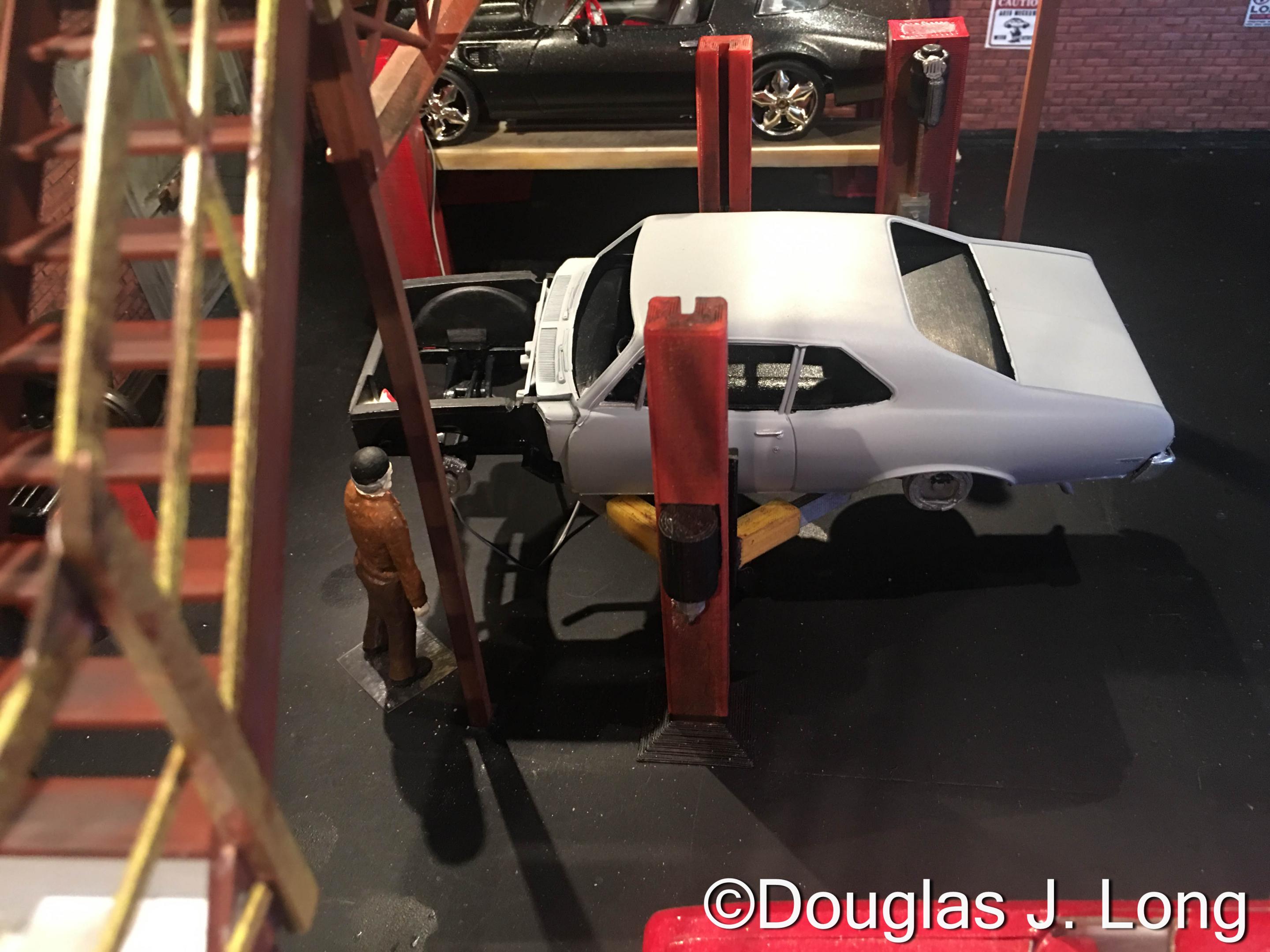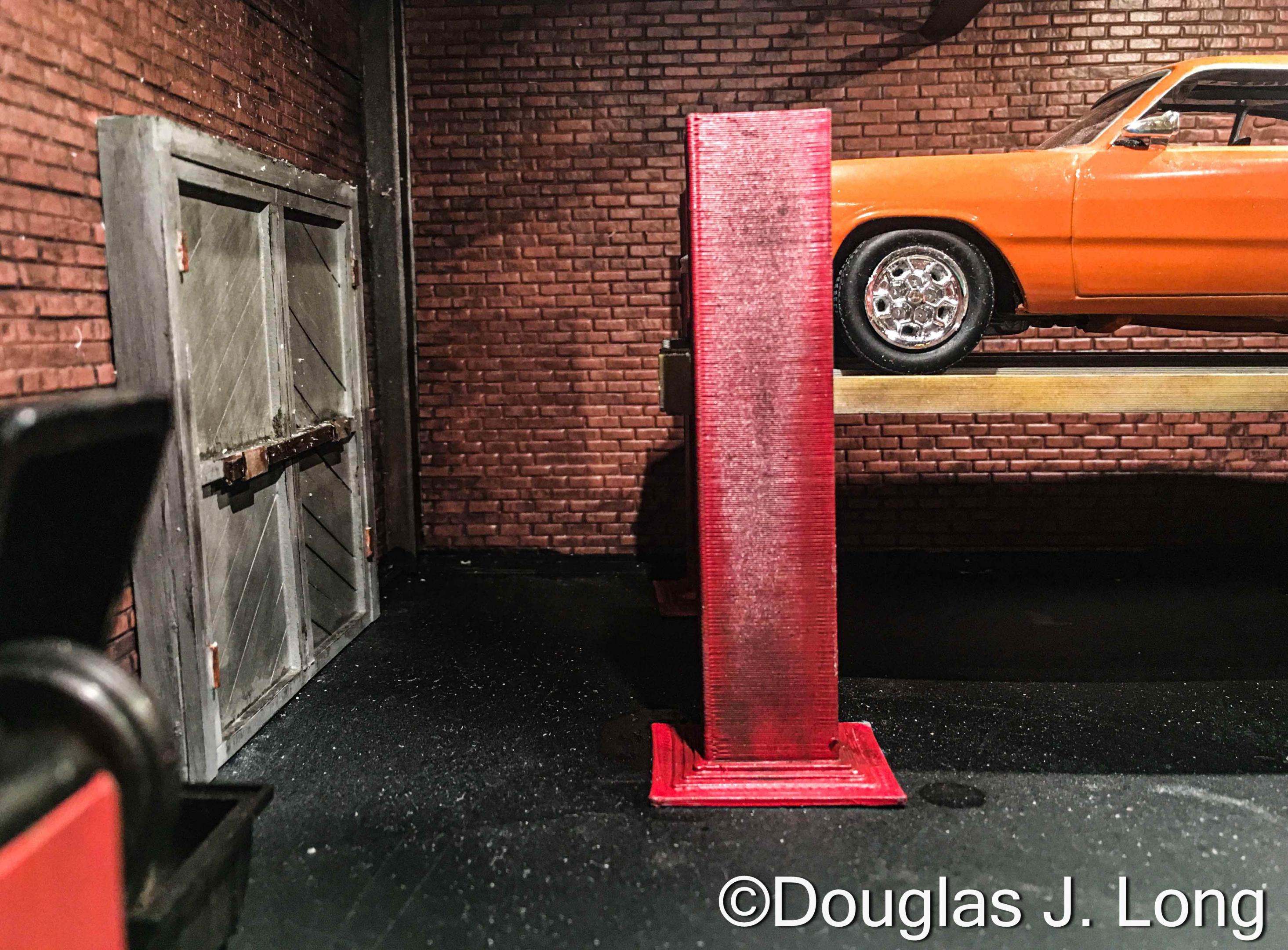 Welcome to the current Otto Ray Sing Classic Car Center. After rather humble beginnings, and now under new ownership, the business has expanded and become even more efficient. The garage area is much larger than the previous versions, and results in more efficient repairs, as well as increased customer satisfaction. The show room is large enough to display three cars. It follows the mid-century modern theme and allows customers to view their dream cars at all times.. The dealership is inviting and always stocked with beautiful cars to please any taste. Actually, there is one detriment. In front of the garage is a cement walkway, that has so far, resisted all attempts to remove it. These two workers will attest that it is much easier to stand around and look at it, than it is to perform the exercise in futility of trying to remove it. Management had a sense of humor when they put up the restroom signs. The entryway to the showroom was also well thought out to draw customers eyes to the vehicles found within. A classic car is always in view while approaching the building. This is what I call a 'photographic diorama', as the purpose is for it to be able to have scenery, vehicles, & figures changed to suit the needs of the vehicle being photographed. I will be adding a history to this as well as introducing figures, etc, if there is interest.