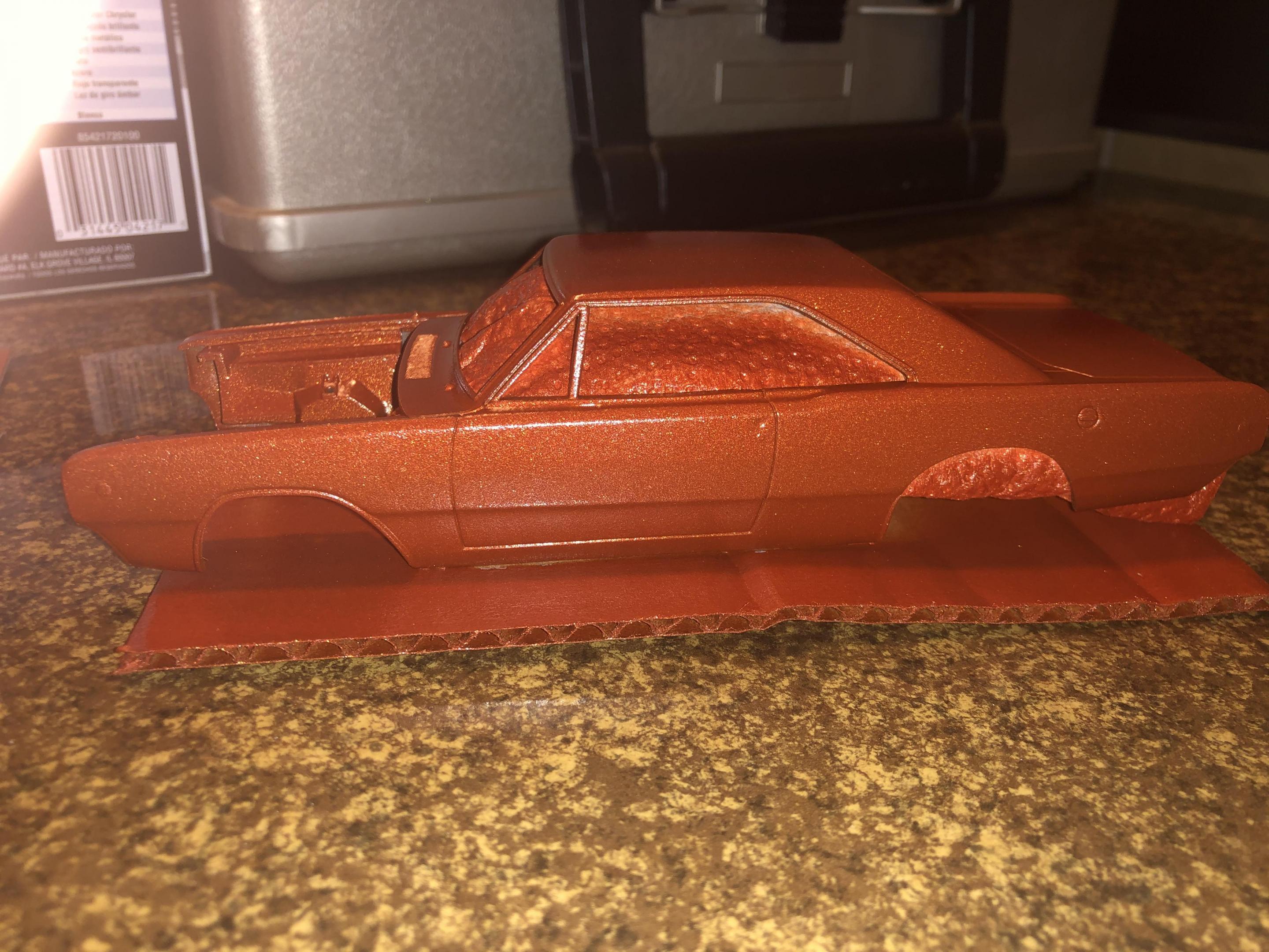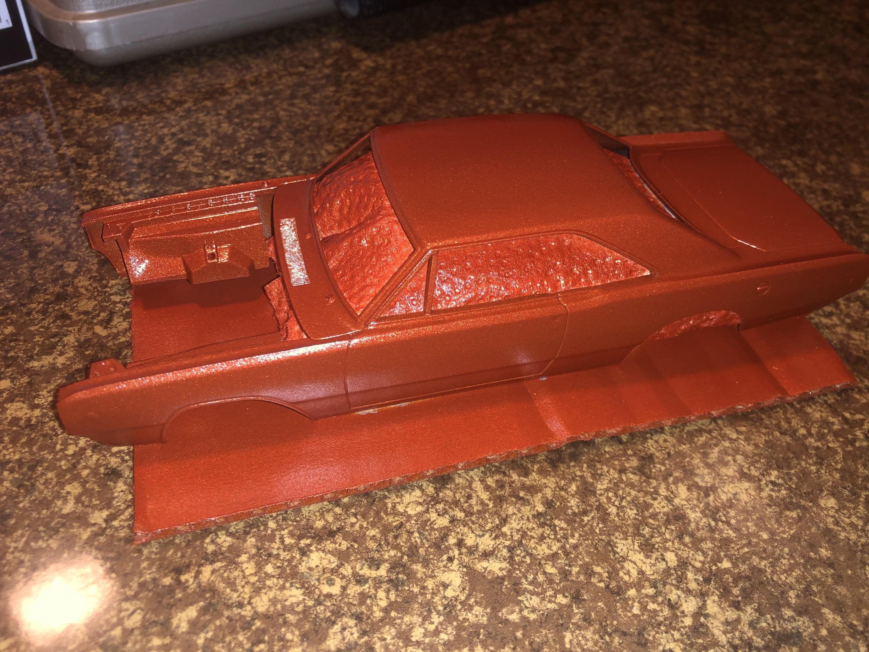 Quick little update here. I stripped the body and other body color panels over the last few days. I just sprayed on some Testors Competition Orange. I’ve attached a few progress pictures showing the interior, underside of the chassis, updated spray job and the motor.