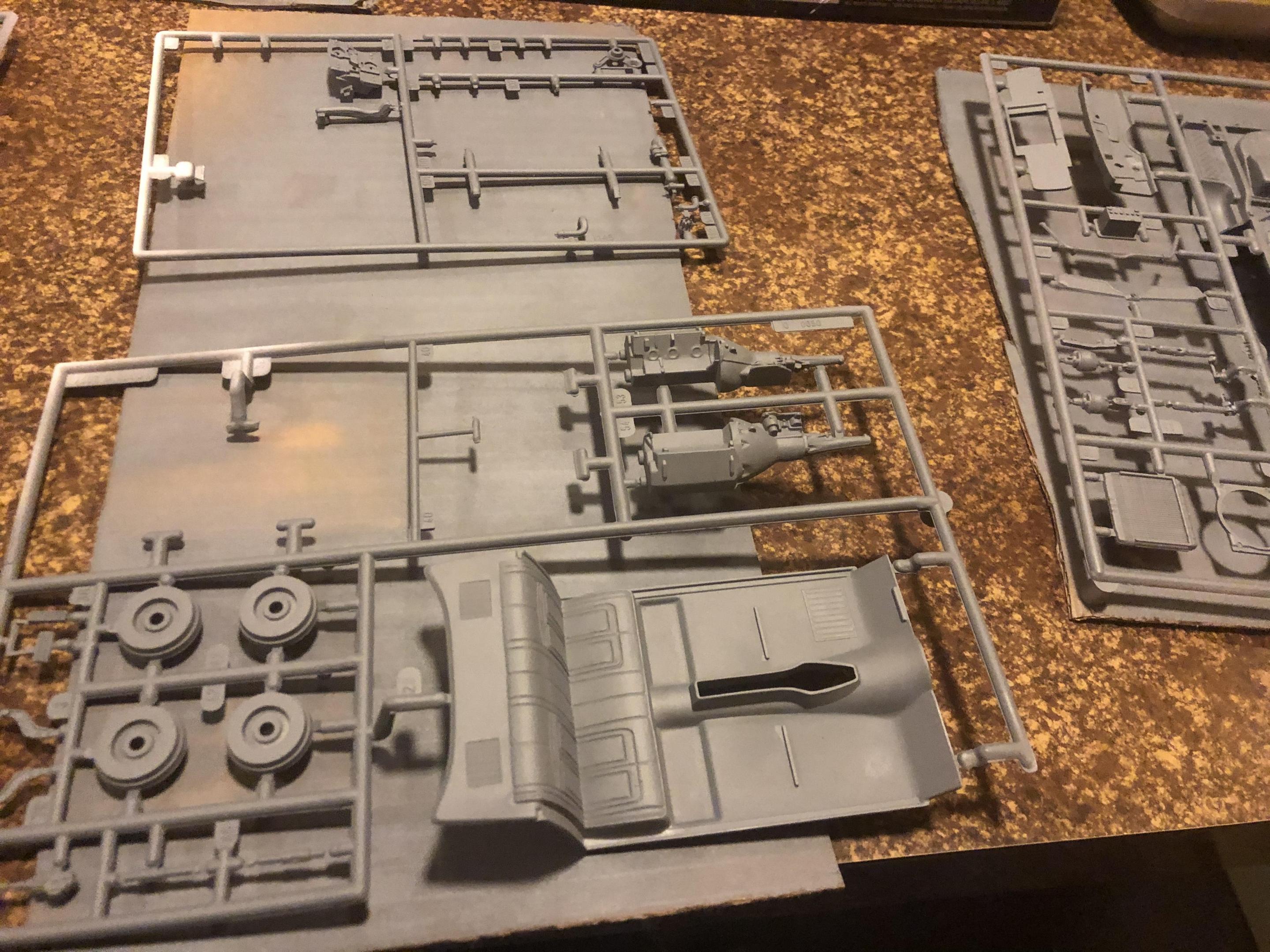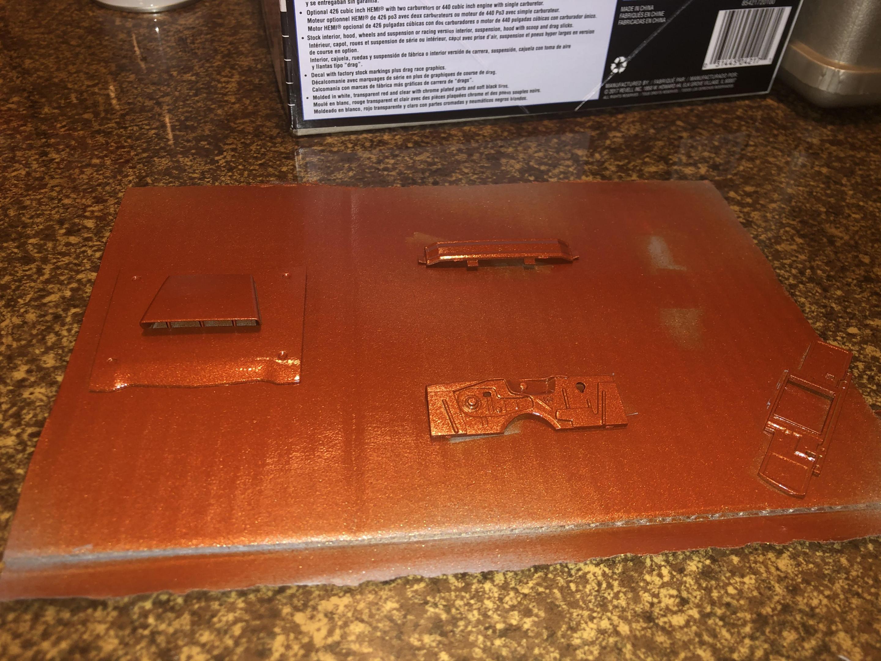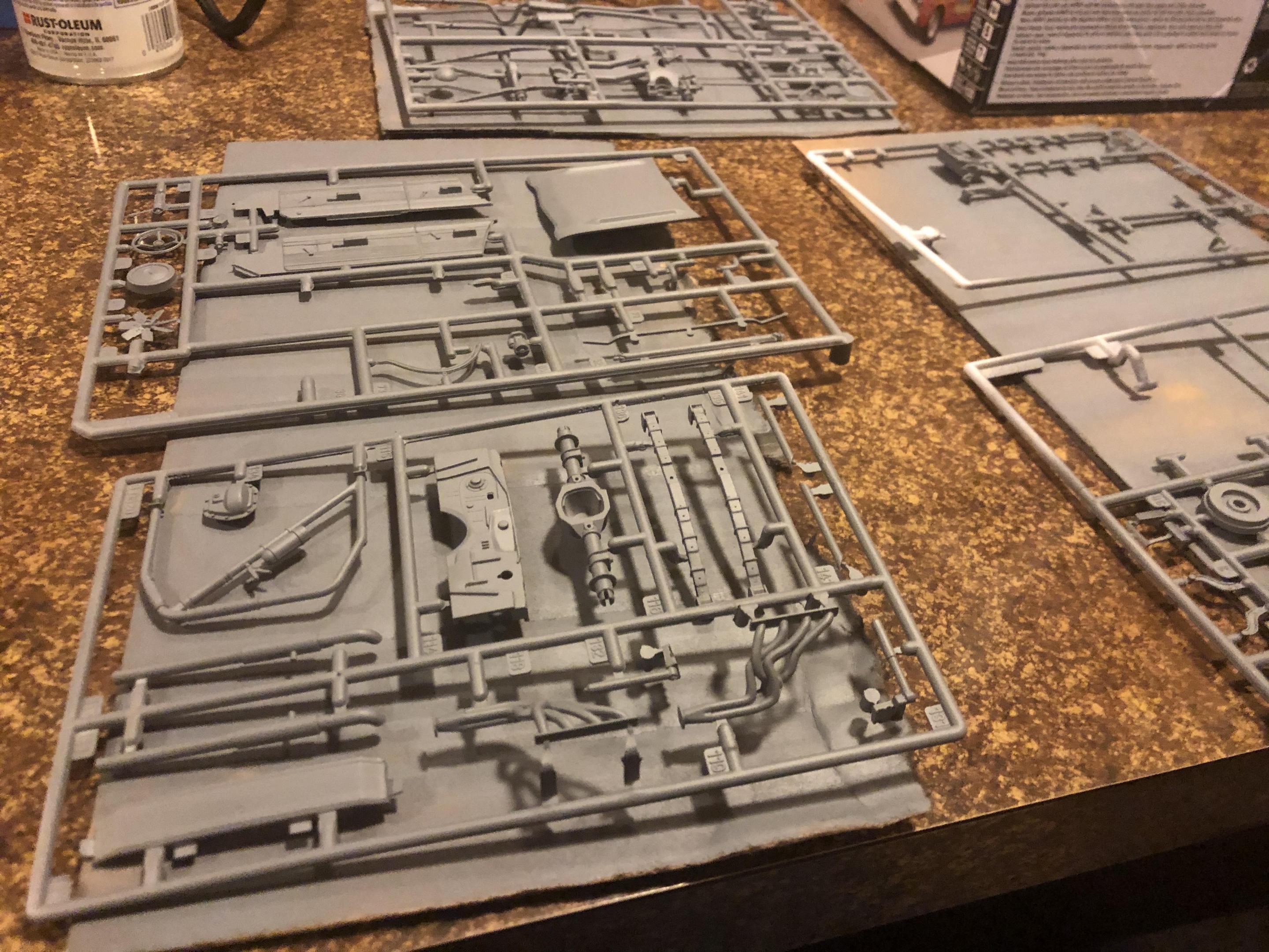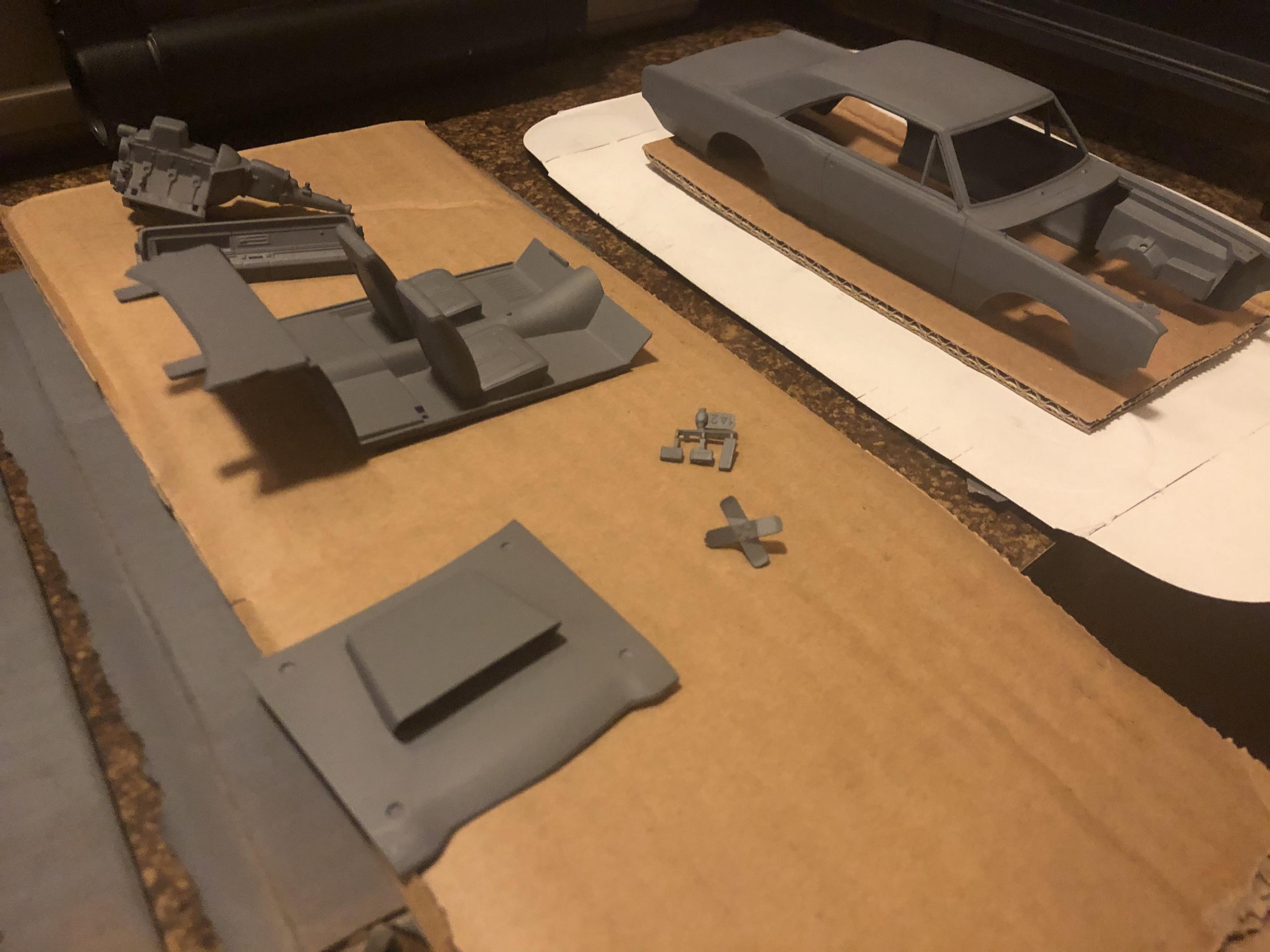 Here are a few progress pictures of the parts in primer and the body color. Still waiting on the black semi-gloss parts to dry so I can flip ‘em and grab the other side (definitely gotta throw together a little spraying rack). The lighting isn’t the best but I’ll work on that before posting any additional pics.