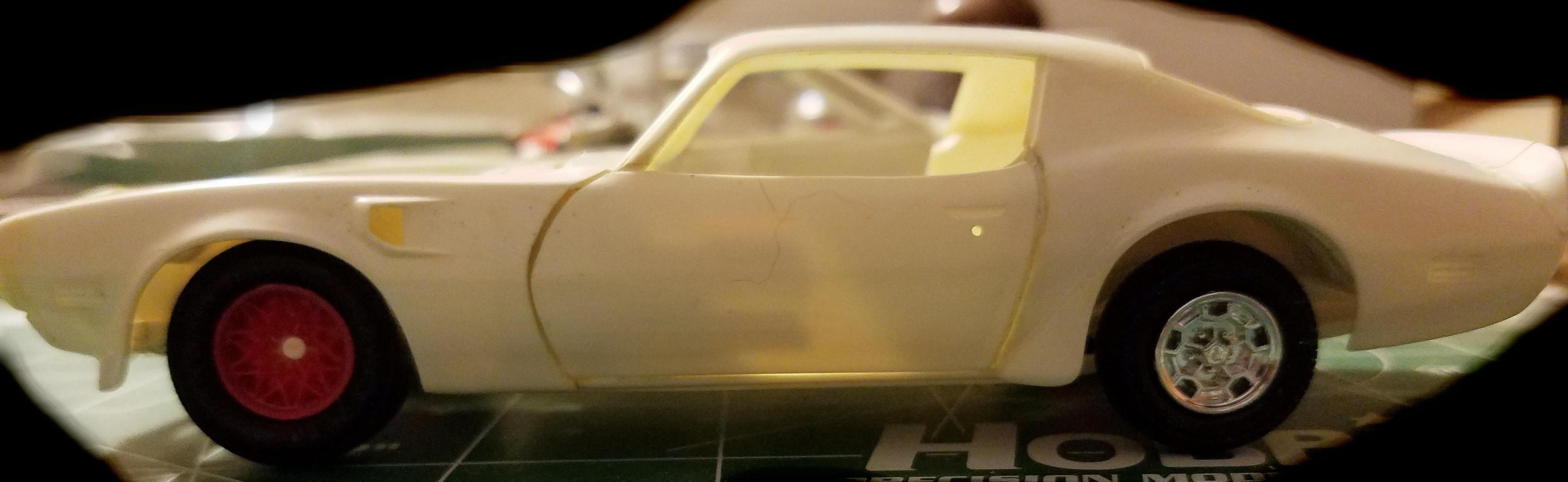 Atlantis Models has bought another lot of tooling/molds.....blunc replied to Dave Van's topic in Car Kit News & Reviews I own all versions of these Monogram 1/32 kits, I've opened all versions, they all have the exact same size tires, even the Ford EXP kit. The wheels are all the same diameter that fit into the tires which are all the same size. That being said, a few of the bodies will look just fine with the smaller tires/wheels (Nova, Ford EXP), the rest of them (IMHO) will not look like they are filling the wheel opening of the car. (see below) This is a photo of the 71 TA, the chrome honeycomb wheel rear wheel/tire is from the kit placed/assembled in the kit location, the front is a snowflake wheel/tire from a 79 TA snap kit. My "opinion" is that the kit wheel/tire is too small for the wheel opening, so I will be dressing up the snowflake wheels for this build.