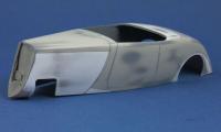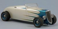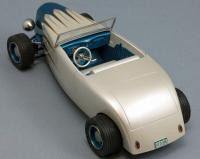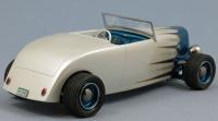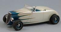 Done at last! This took far longer than I ever thought it would even though it wound up being a curbside. I badly miscalculated what it would take to channel the body and that's why the engine (and most of the chassis) got left out. It's built from the AMT coupe kit with the roof cut off, lots of filling in and vacuformed side panels for the bonnet. The windshield is scratchbuilt. The paint is HOK snow white with duplicolor aqua scallops. I wish I had made the ghost scallops a little darker but they are supposed to be "ghosts".