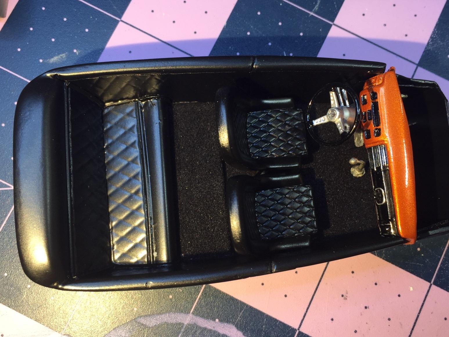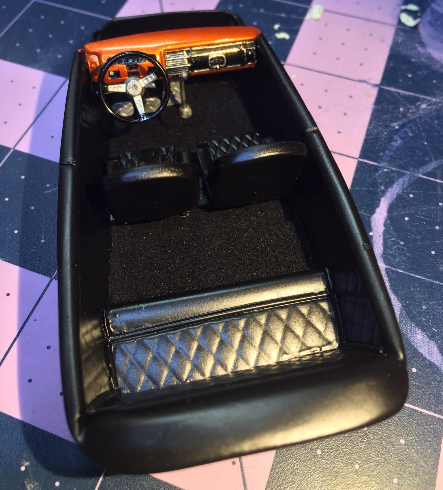 Seats turned out okay. I used black embossing powder for the indoor/outdoor carpeting, poured over Tamiya flat black. It's not cheap but it behaves much better than flock and it may, in fact, be a bit cheaper. There's not a whole lot of colors that are useful to us but you just treat it like flock and mix colors. Anyway, the interior tub is done so there's nothing stopping me from wrapping it up. Except the game. yeah, I know....you want me to drill out the steering wheel, right? Mmmmmm nah. I have a better idea.....if I could just remember....🙃.....🤣...................🤔 Thank you for your time! 🙃