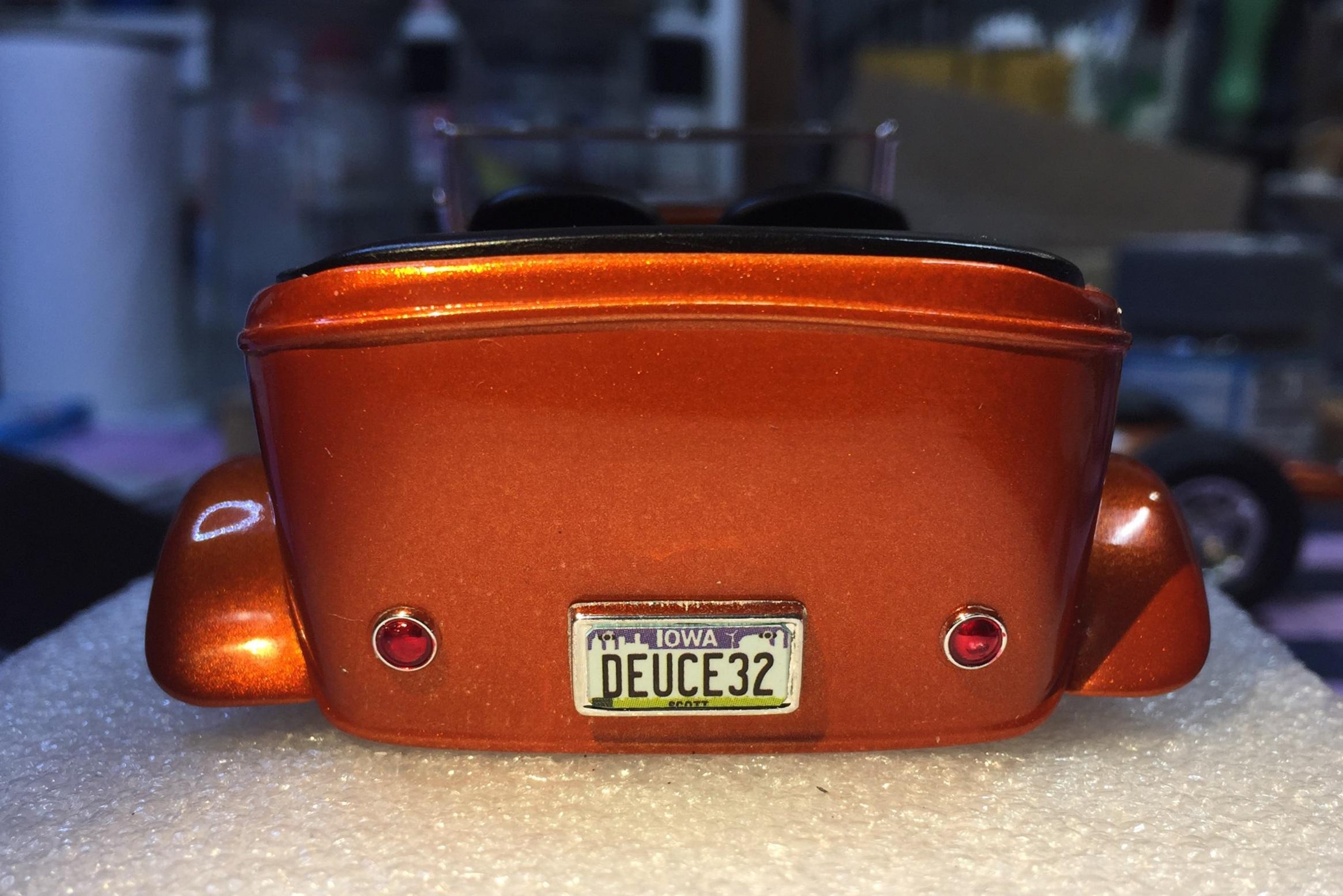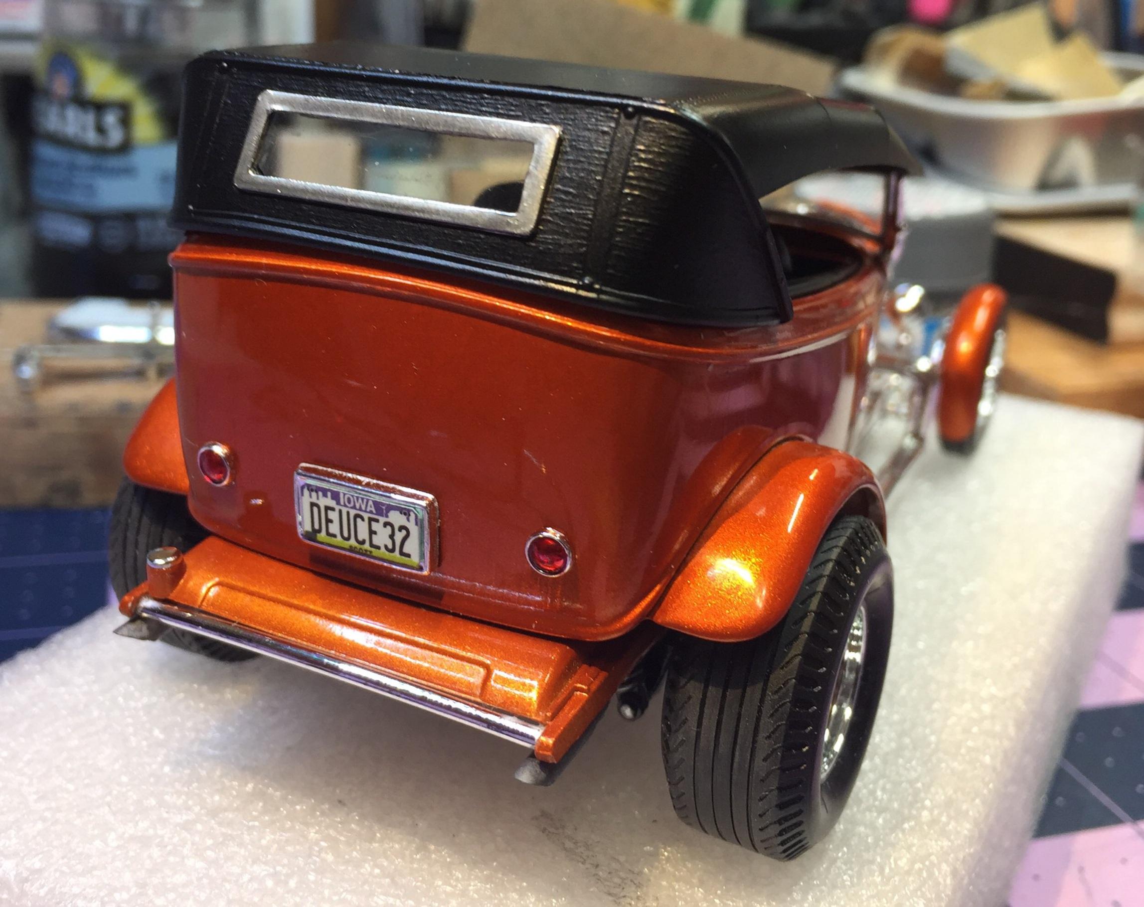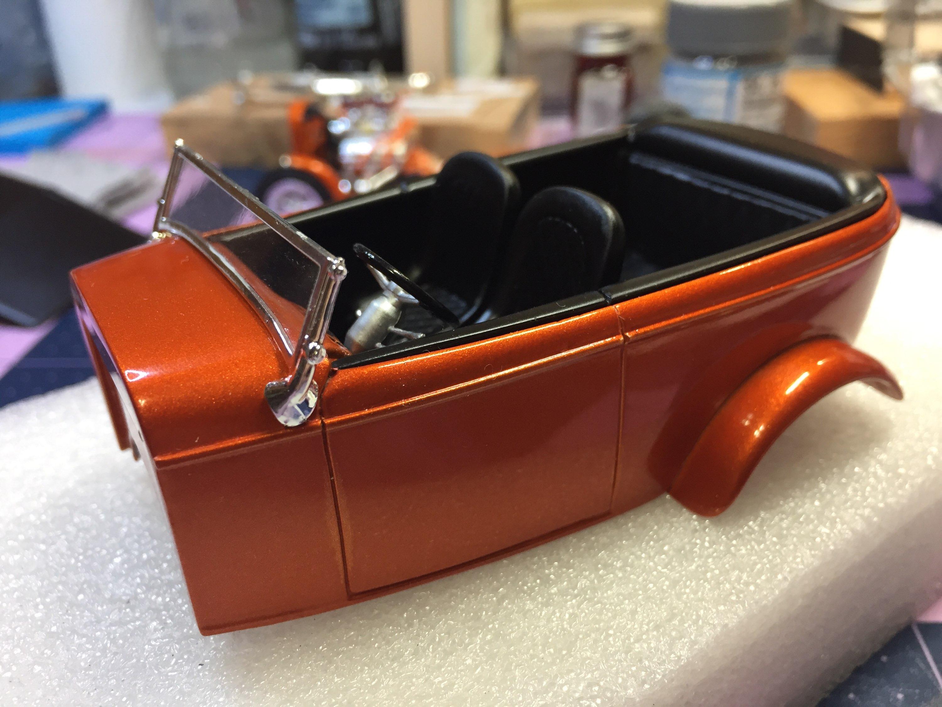 I decided on the leftover windshield from the Duval kit. I don't like the oversize mounts but we can pretend it's a custom part and it's supposed to be that way. The tub kit part was not substantial enough, in my mind, to last in the upright position very long. 😕 tail lights are there now as well as the plate frame from the Monogram deuce kit. My eyes tell me it's fairly well centered. You may get a different result with yours. The front left door line must have had a very slight rise along the line...From now on, I am going to sand panel lines a bit below flush so this doesn't happen. I may try to buff it up but with the clear gone, it likely won't help much. The interior tub is now epoxyed in. We're down to stuff like the coil and radiator support rods. Thanks for checking in. WDYT a out the foiled backlight frame? It seems way out of scale but it's a custom item so.....I need to detail this roof more.... In retrospect, dumping the front like I did was probably not a good idea. The driver and passengers will have a difficult time staying seated. 😟 If I were to do this build again, I would do the same in front but get the back down and just move the fenders up and channel it full frame depth for a nice ankle burner look. The rake is kinda cool but it's not practical for street use. It is what it is 🥴.