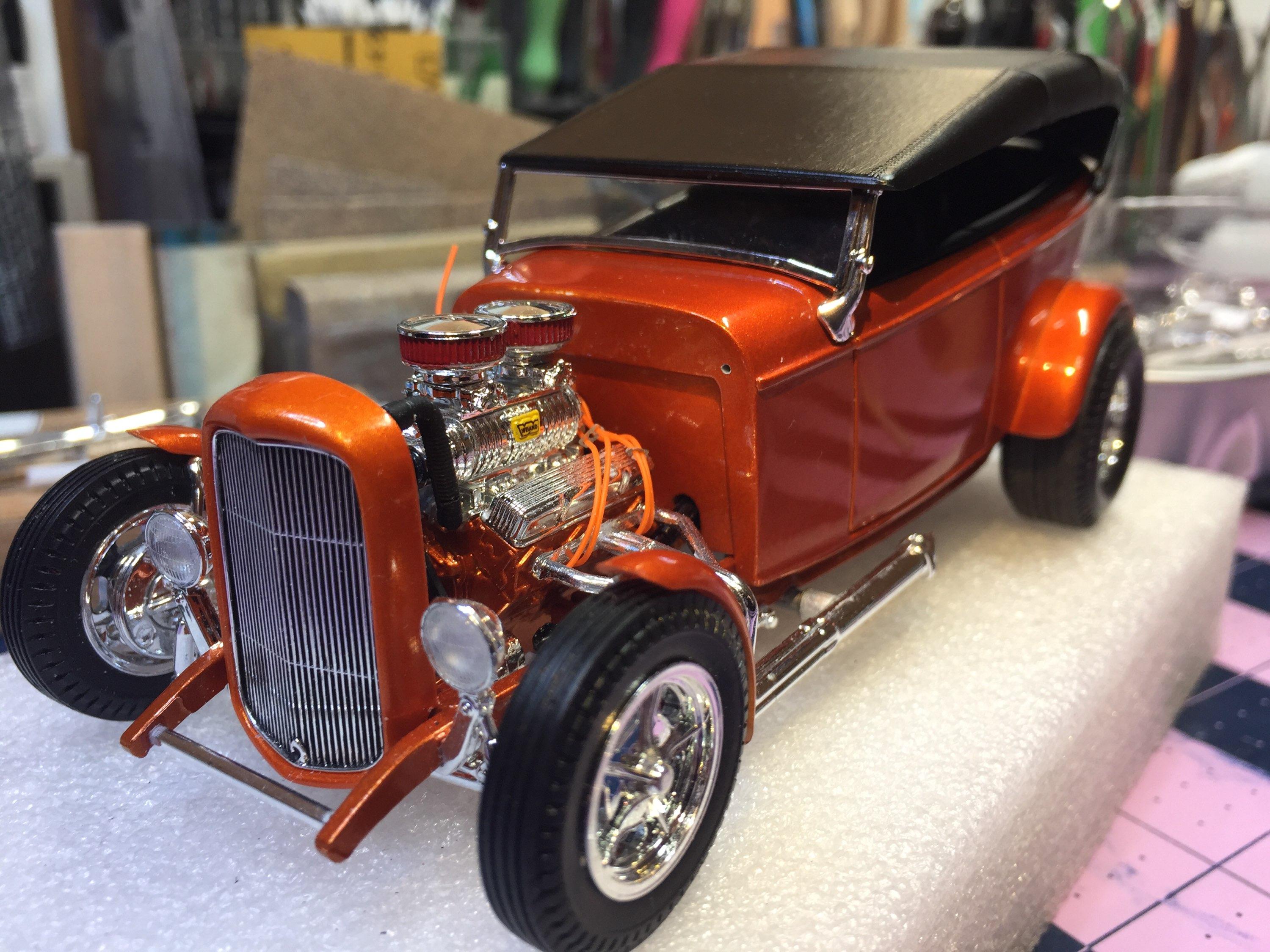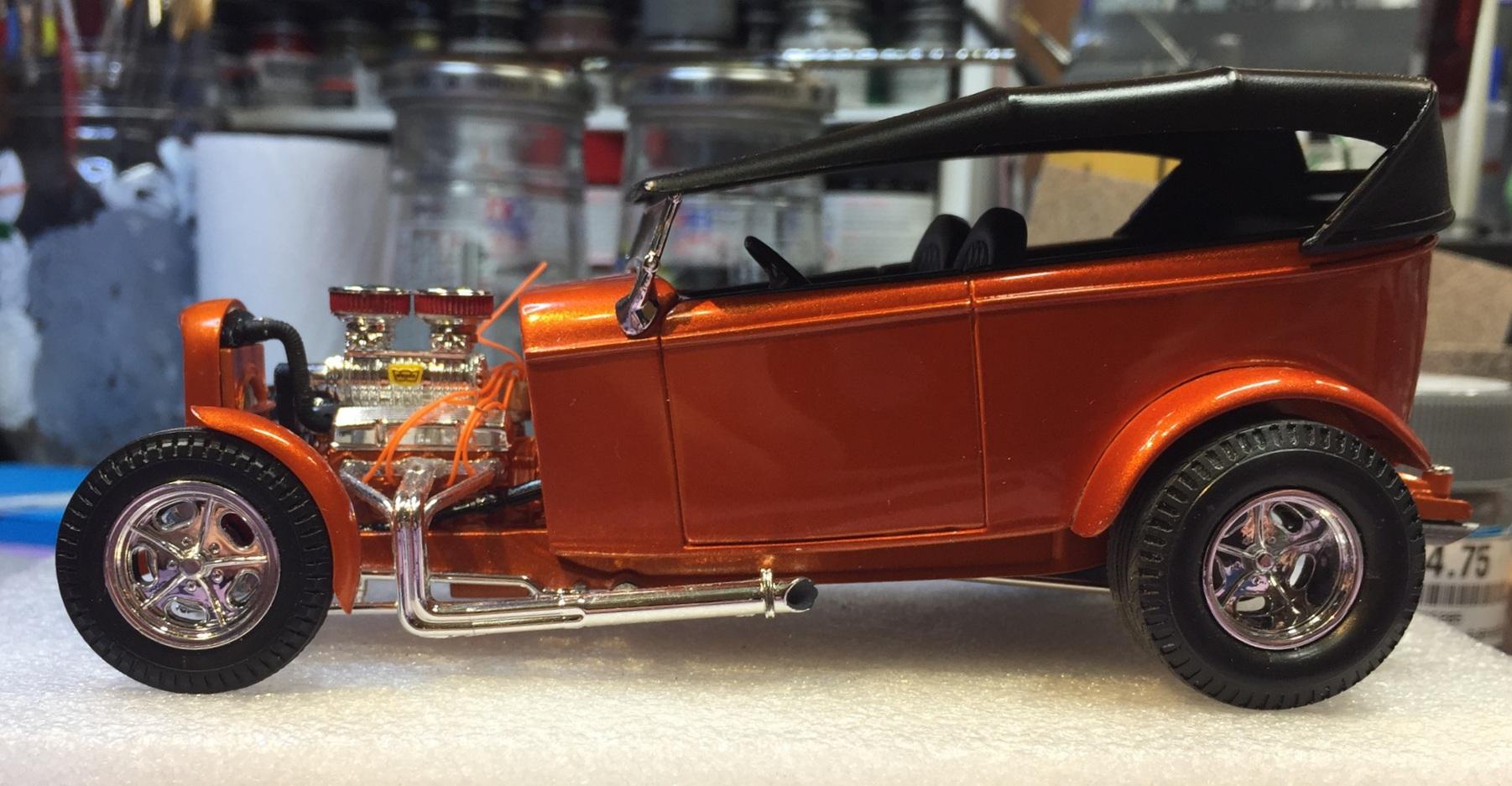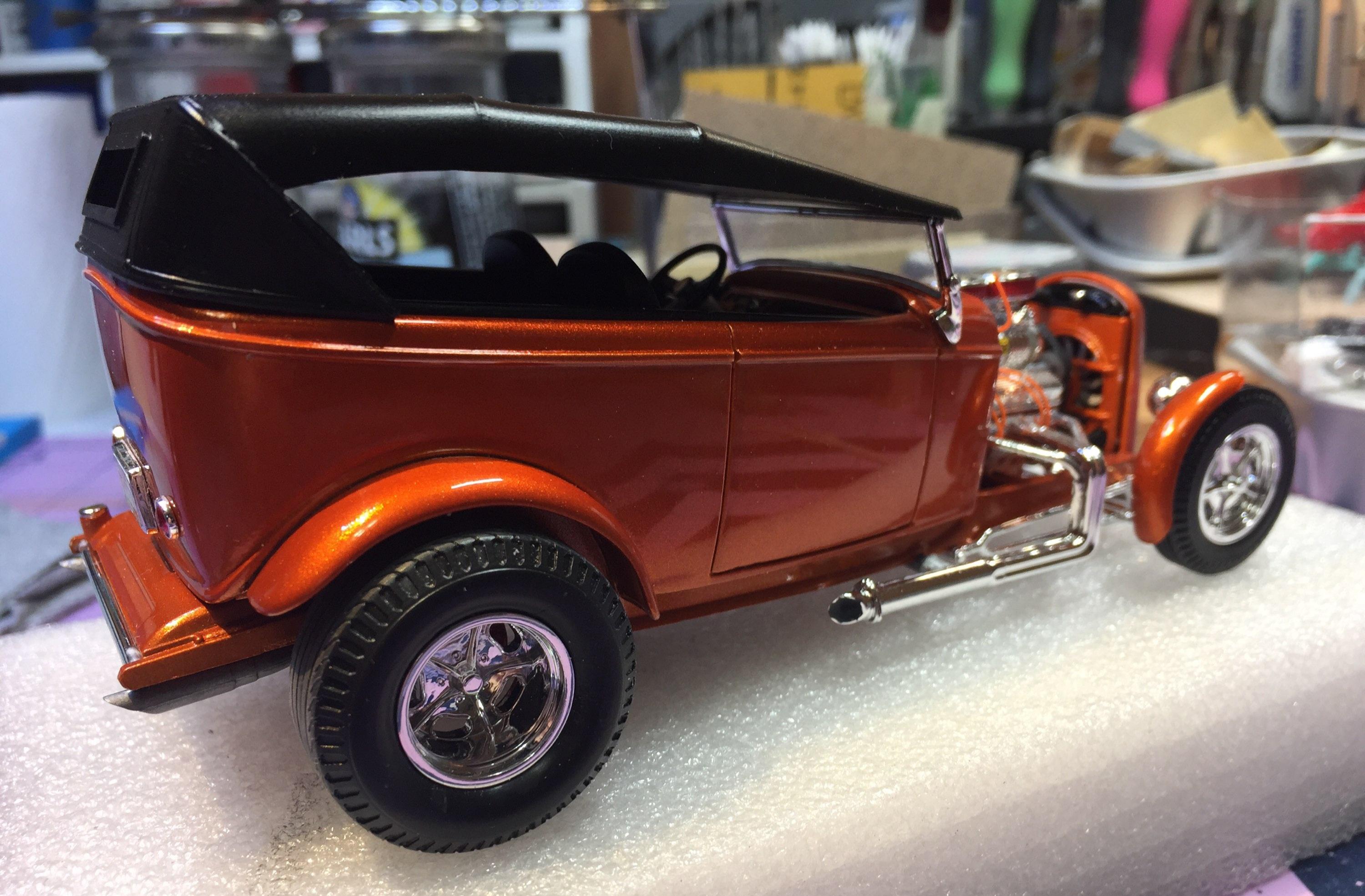 I decided on the leftover windshield from the Duval kit. I don't like the oversize mounts but we can pretend it's a custom part and it's supposed to be that way. The tub kit part was not substantial enough, in my mind, to last in the upright position very long. 😕 tail lights are there now as well as the plate frame from the Monogram deuce kit. My eyes tell me it's fairly well centered. You may get a different result with yours. The front left door line must have had a very slight rise along the line...From now on, I am going to sand panel lines a bit below flush so this doesn't happen. I may try to buff it up but with the clear gone, it likely won't help much. The interior tub is now epoxyed in. We're down to stuff like the coil and radiator support rods. Thanks for checking in. WDYT a out the foiled backlight frame? It seems way out of scale but it's a custom item so.....I need to detail this roof more.... In retrospect, dumping the front like I did was probably not a good idea. The driver and passengers will have a difficult time staying seated. 😟 If I were to do this build again, I would do the same in front but get the back down and just move the fenders up and channel it full frame depth for a nice ankle burner look. The rake is kinda cool but it's not practical for street use. It is what it is 🥴.