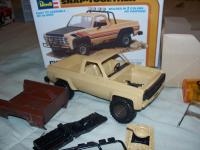 this ones off to a start already removed the "curbside" fake motor/ tranny from the body and chassis I may try to remove the box and use a regular kitted bed, but the fender flares are molded onto the bed so I may just let the one piece body ride as is just drop in a 409 chevy plant and detail er up good and let it ride!