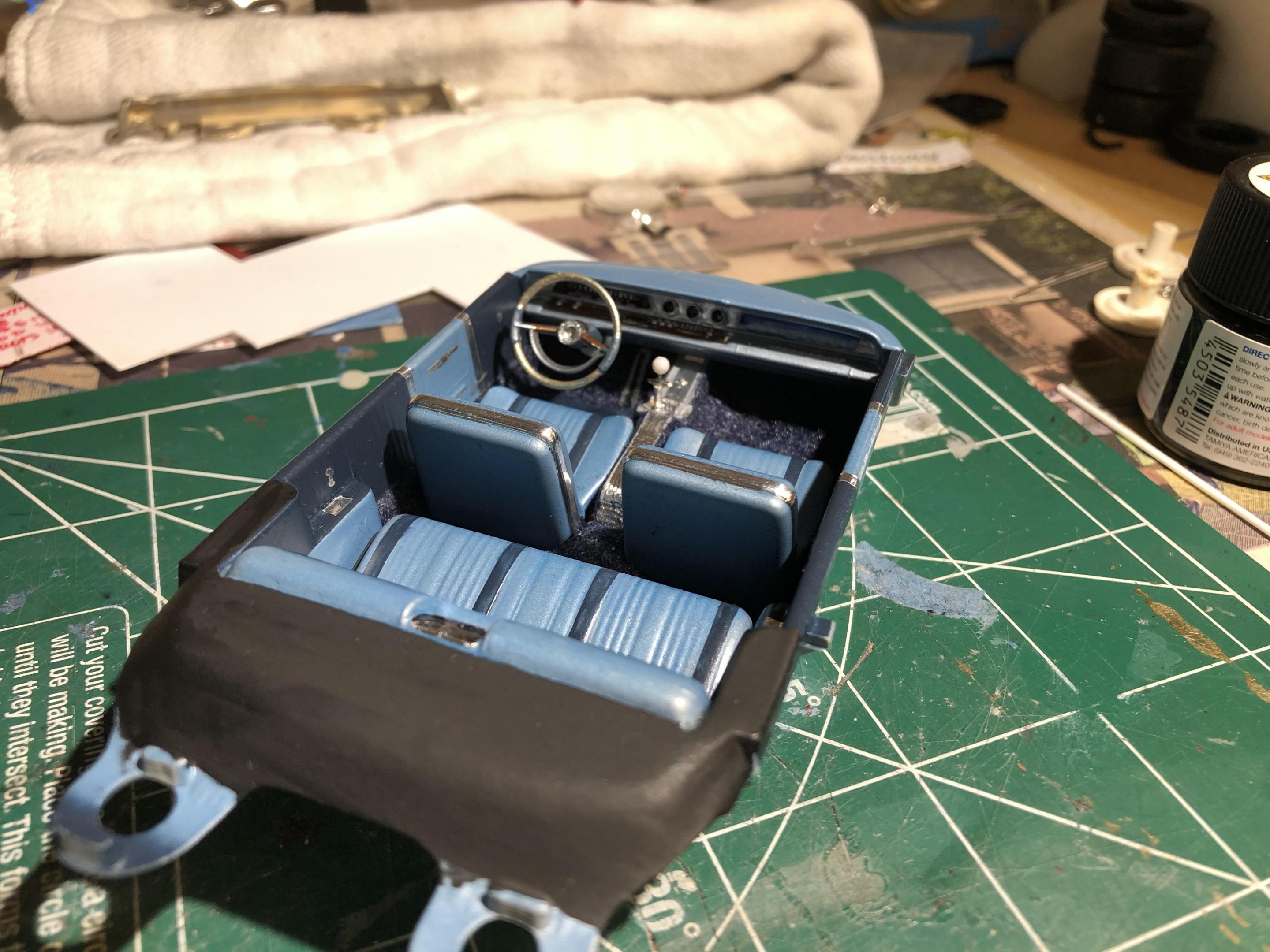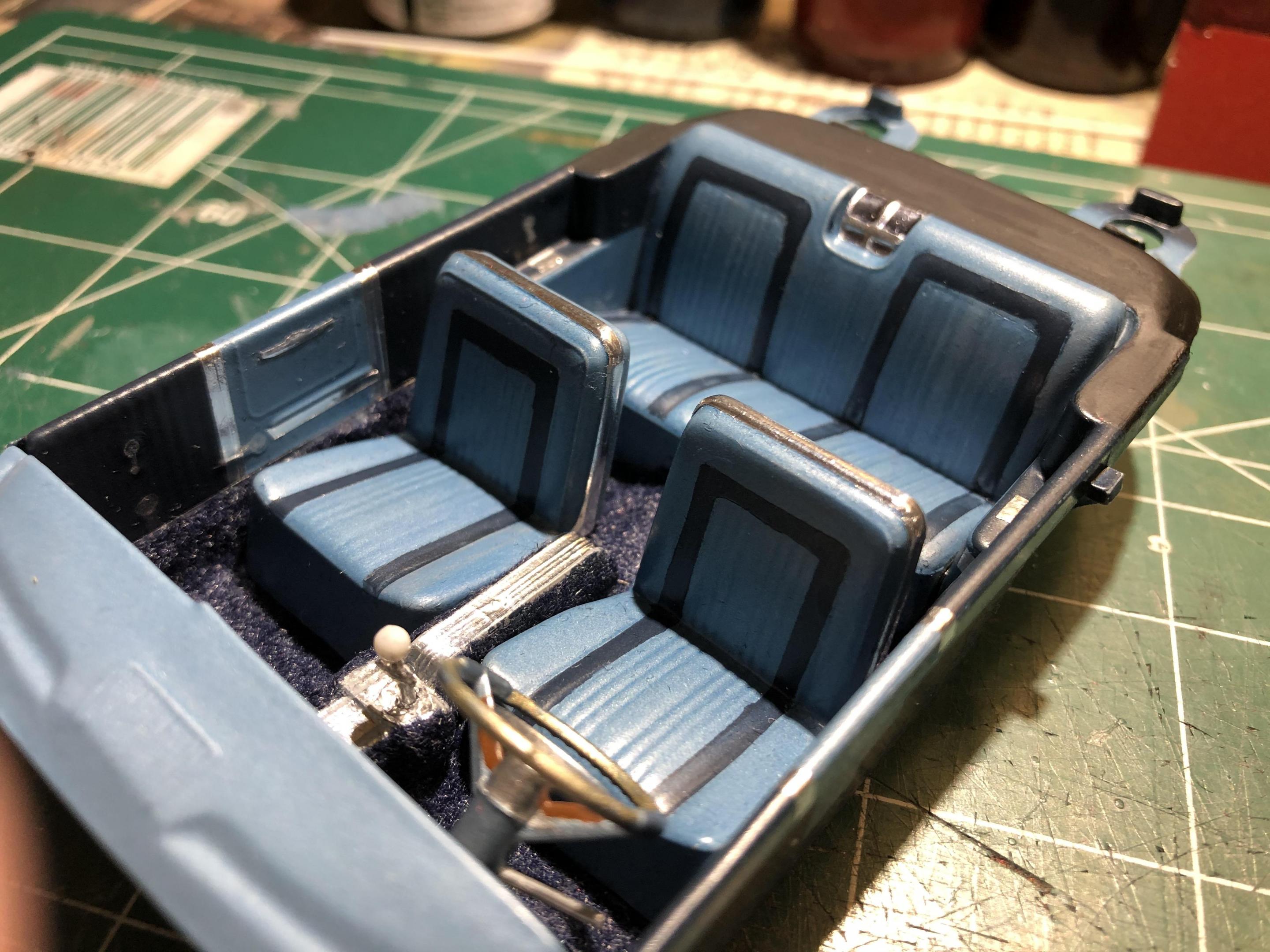 Merry Christmas everyone...finally finished the interior for one of two AMT annual '63 Bonnevilles I'm building. This car is Yorktown Blue, the other will be Grenadier Red. I'm also working on an uptop for the blue car. I have been struggling with simulating the lucite portions of the steering wheels on the AMT annual Pontiacs that I've done. This time after lots of staring at a picture of the 1:1 steering wheel in a blue interior car, I tried Tamiya Titanium Gold with a little bit of the light blue interior color thrown in for tint. Hopefully I'll get this car done soon.