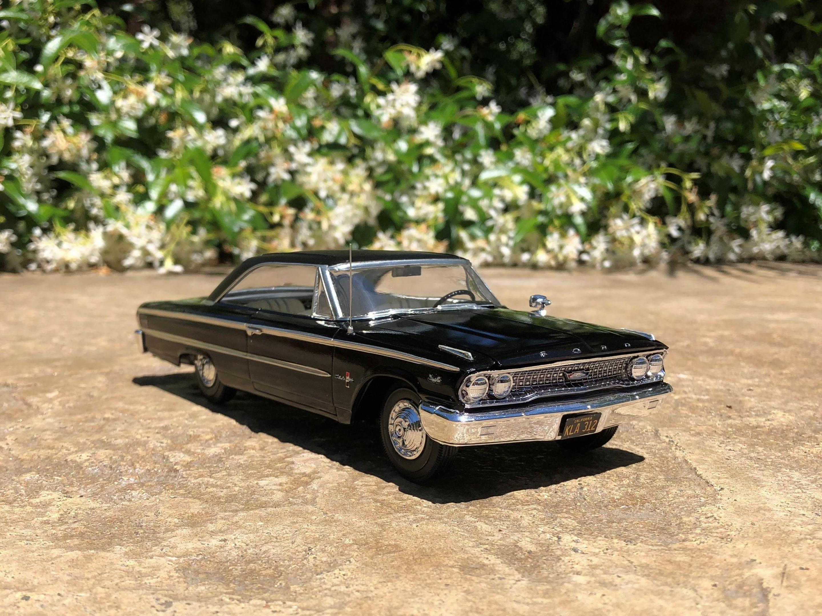 '63 1/2 Ford Galaxie 500 XL in Raven Black with the Trim No. 83 interior. This was mostly from the AMT Millenium kit except for the bumpers, which came from a Prestige version since the plating on the Millenium bumpers rubbed off simply by handling them a few times. Hope AMT re-introduces the G A L A X I E trunk lid letters on their upcoming reissue.
