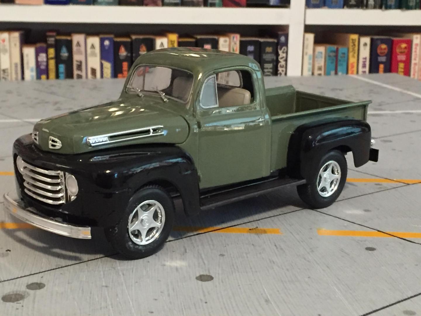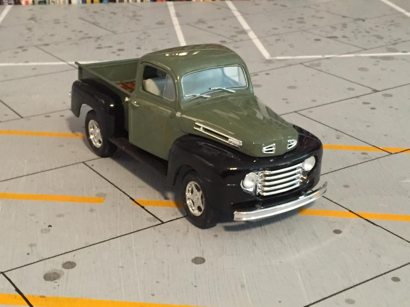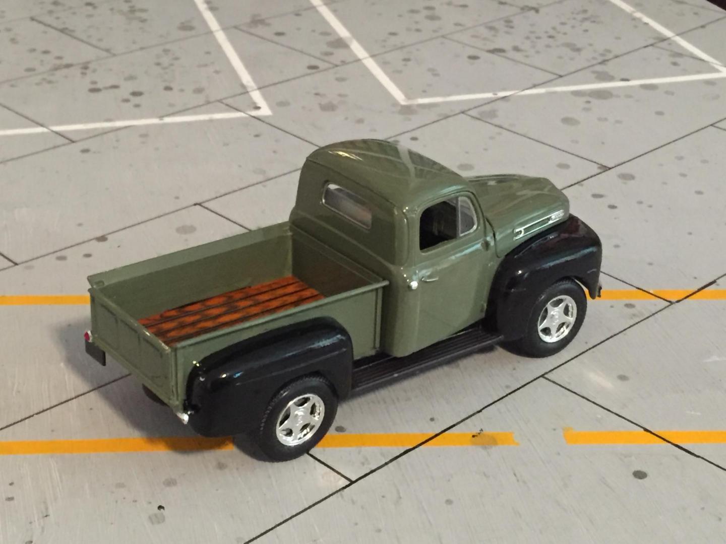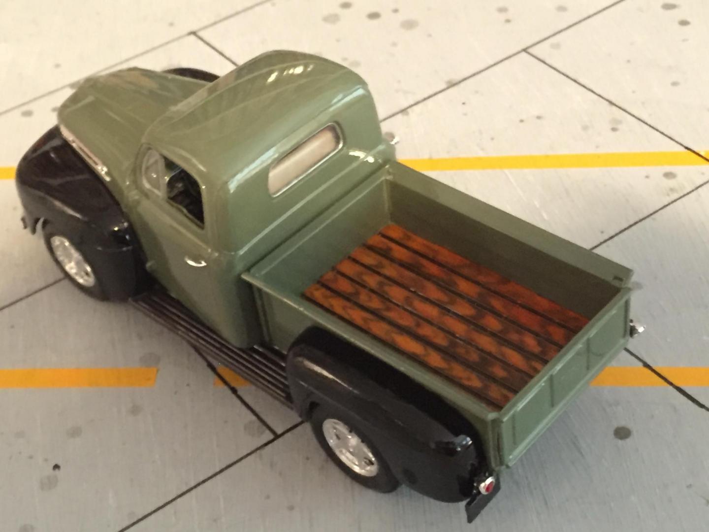 Where I grew up, the Sinclair station across the street had a '50 Chevy Stepside painted in these colors. The model is built OOB with the exception of the wheels and tires that I bought on eBay. The bed was brushed Testors Flat Black and then most of the paint was rubbed off with a soft cloth dipped in charcoal lighter fluid(naptha). The bed's wood color is two coats of Tamiya Turn Signal Amber applied by brush and a coat of Future overall. The body is brush-painted with Testors Gloss Black and Xtracolor RLM62 Grun(a pre-WW2 German Luftwaffe aircraft color). Adios, Larry the Airplane Guy.