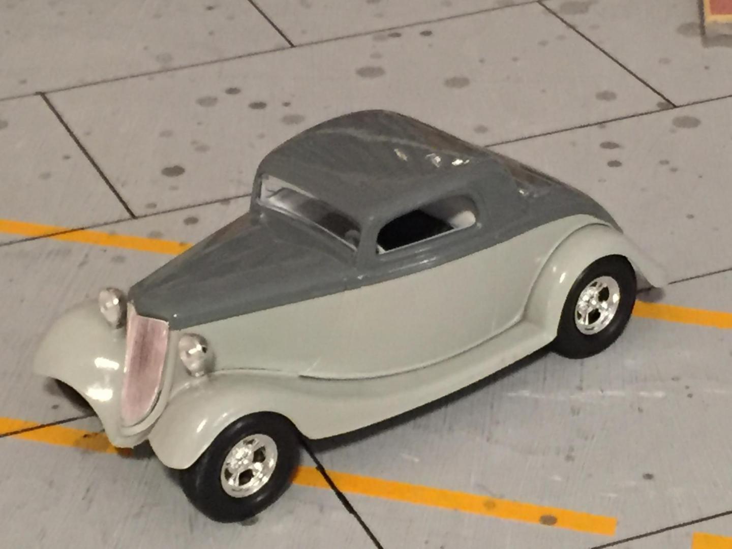 http:// This is my third and latest 1/25th build. It is the AMT '36 Ford coupe that was built from an e-Bay glue-bomb. It is the 25th anniversary(1981) release of the 1966 kit. I brush-painted it Humbrol(U.K.) Gloss Lime Green. Interior is Primer White and acrylic yellow craft paint. The engine is the stock flat-head. It is OOB except the rear tires came from the "40 Ford Tudor sedan and the window glass is cut from a sheet of clear packaging material, as the kit glass was unusable. I am a 1/72 airplane builder and I don't own an airbrush. I had to prime the whole model with Plastikote White rattle-can primer after stripping off the original crappy paint. Adios, Larry. Here is the '36 with its stable-mates, the AMT '40 Tudor and the AMT '32 Vicky. All are brush-painted and built 98% OOB.