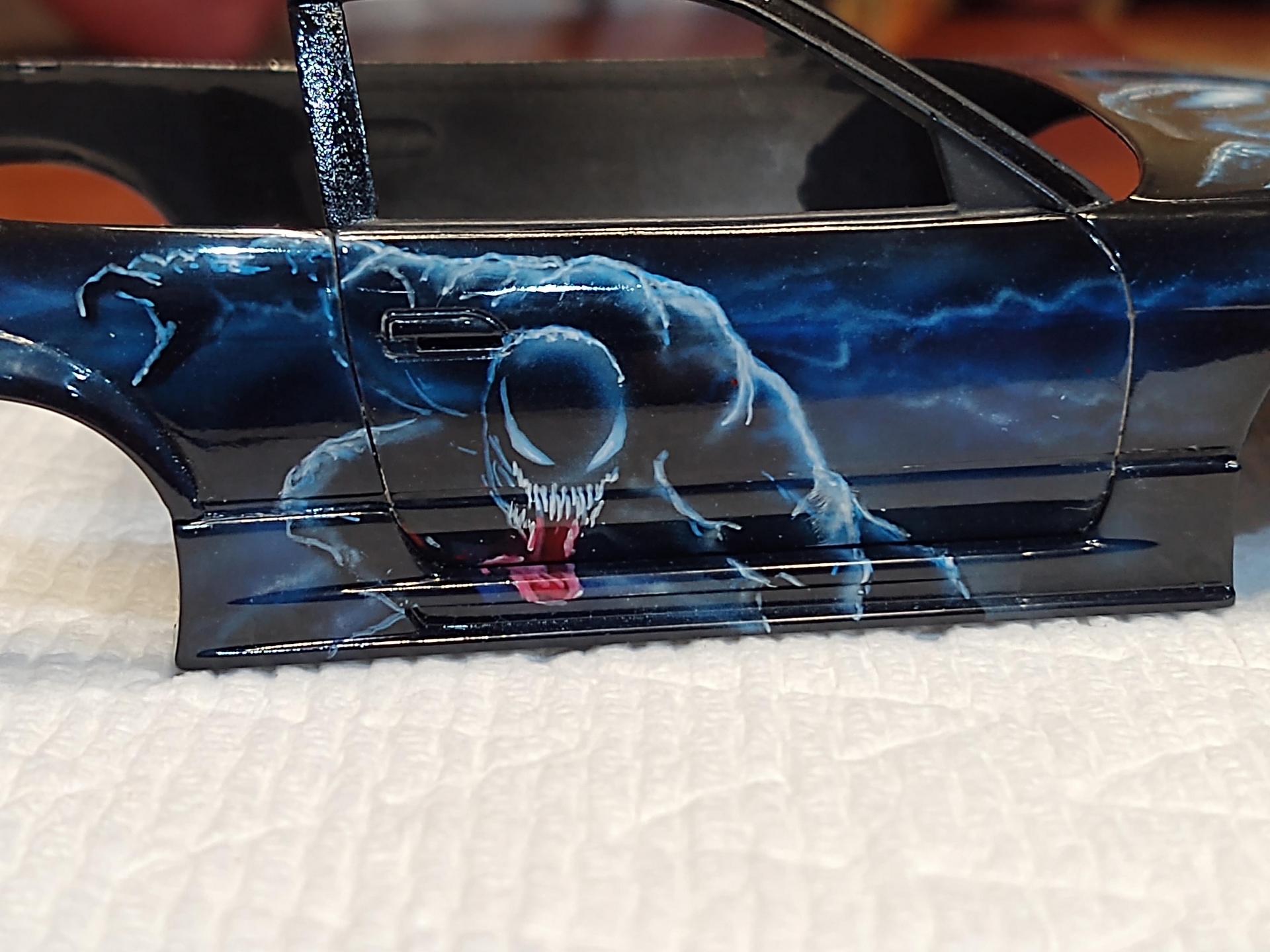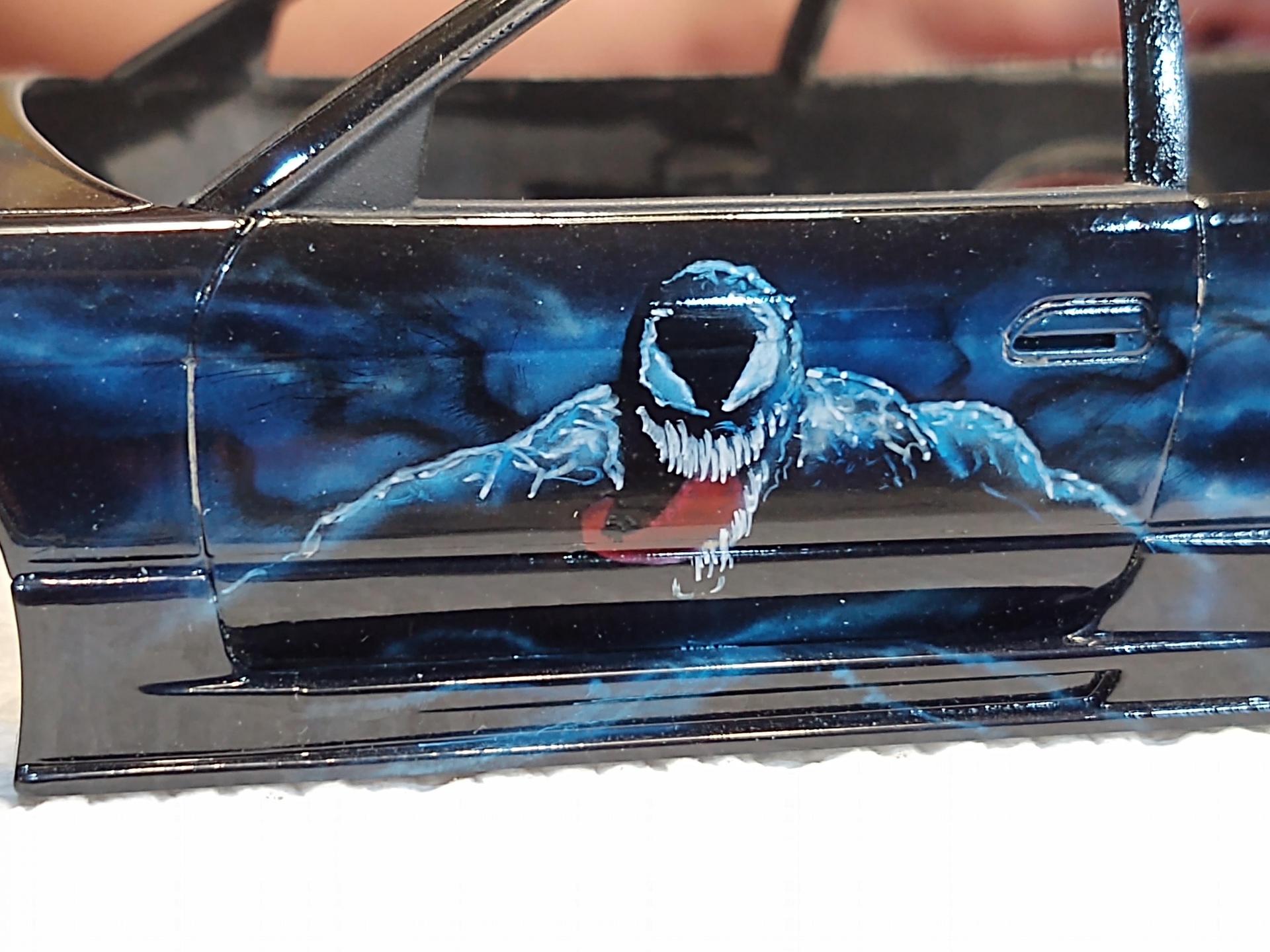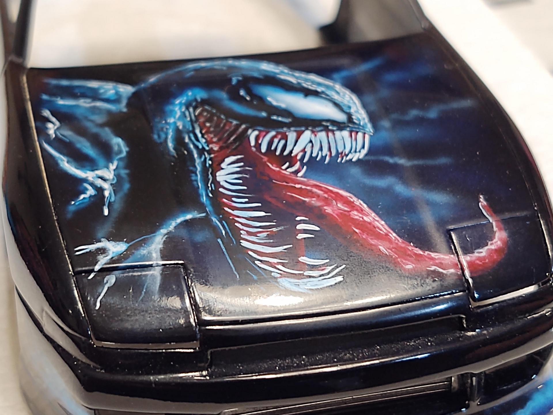 My good friend, Alexander Jurck, posted he would trade a paint job for a Moebius F100, so I sent the truck and a freshly re-primed 180SX. We decided that VENOM would be the theme, and he did his magic. It is all airbrush and detail painted by hand.