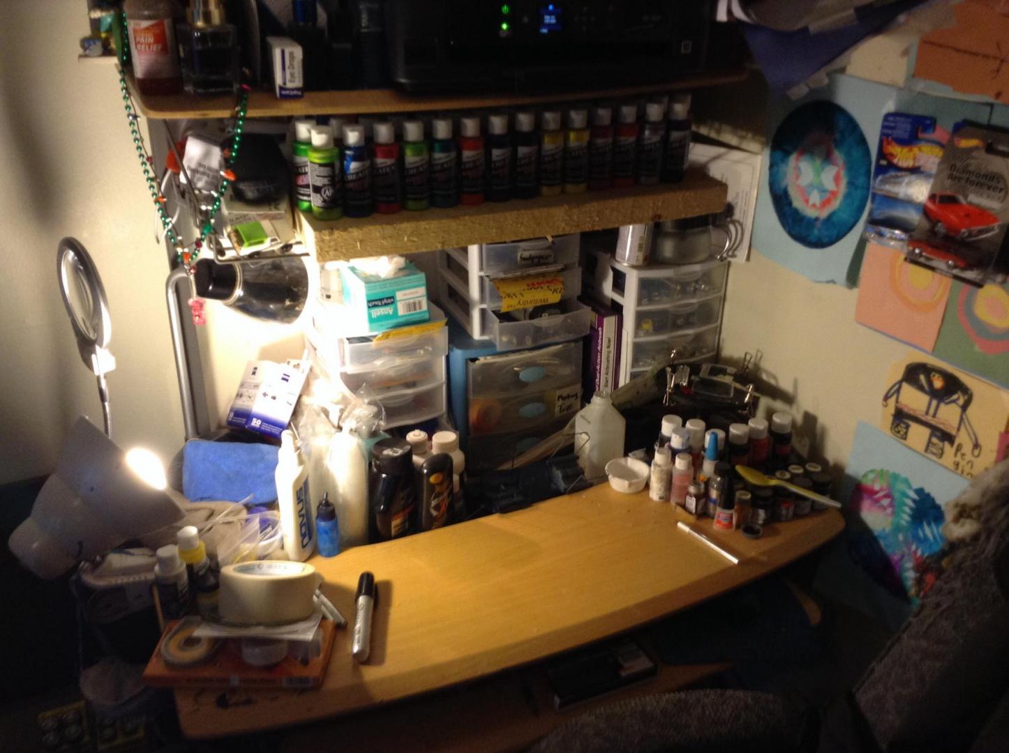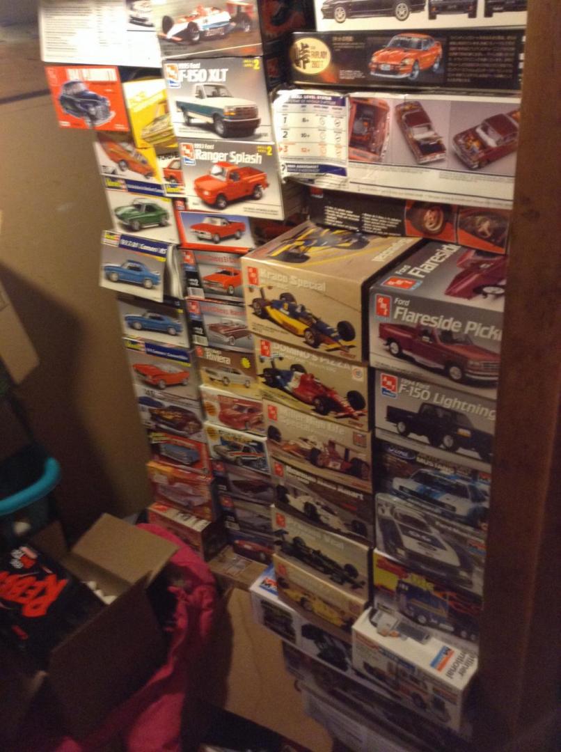 This is my current work area, I paint in another room however. My kits are stashed in the attic, there's way more kits behind those. These are my most recent acquisitions. -