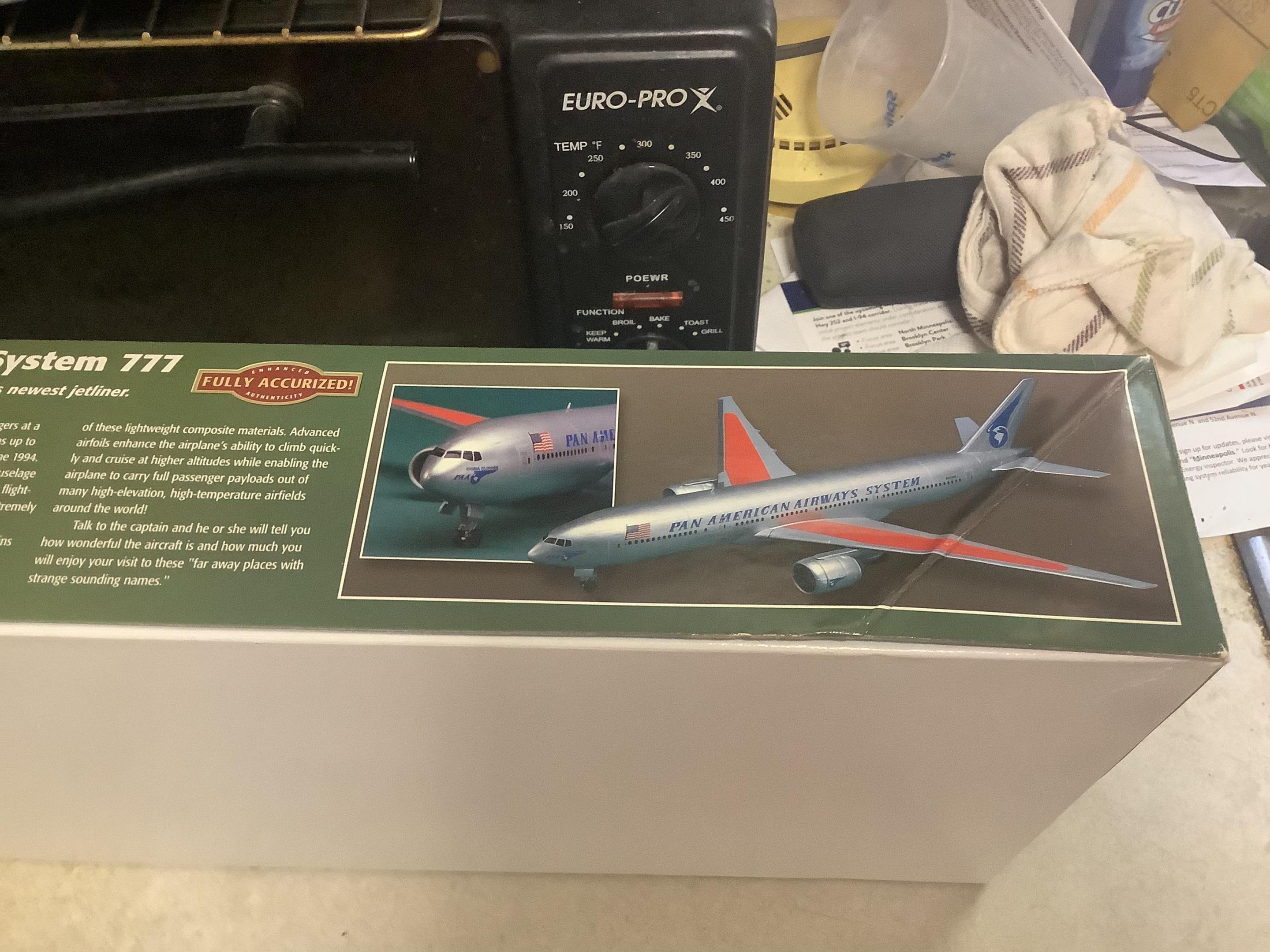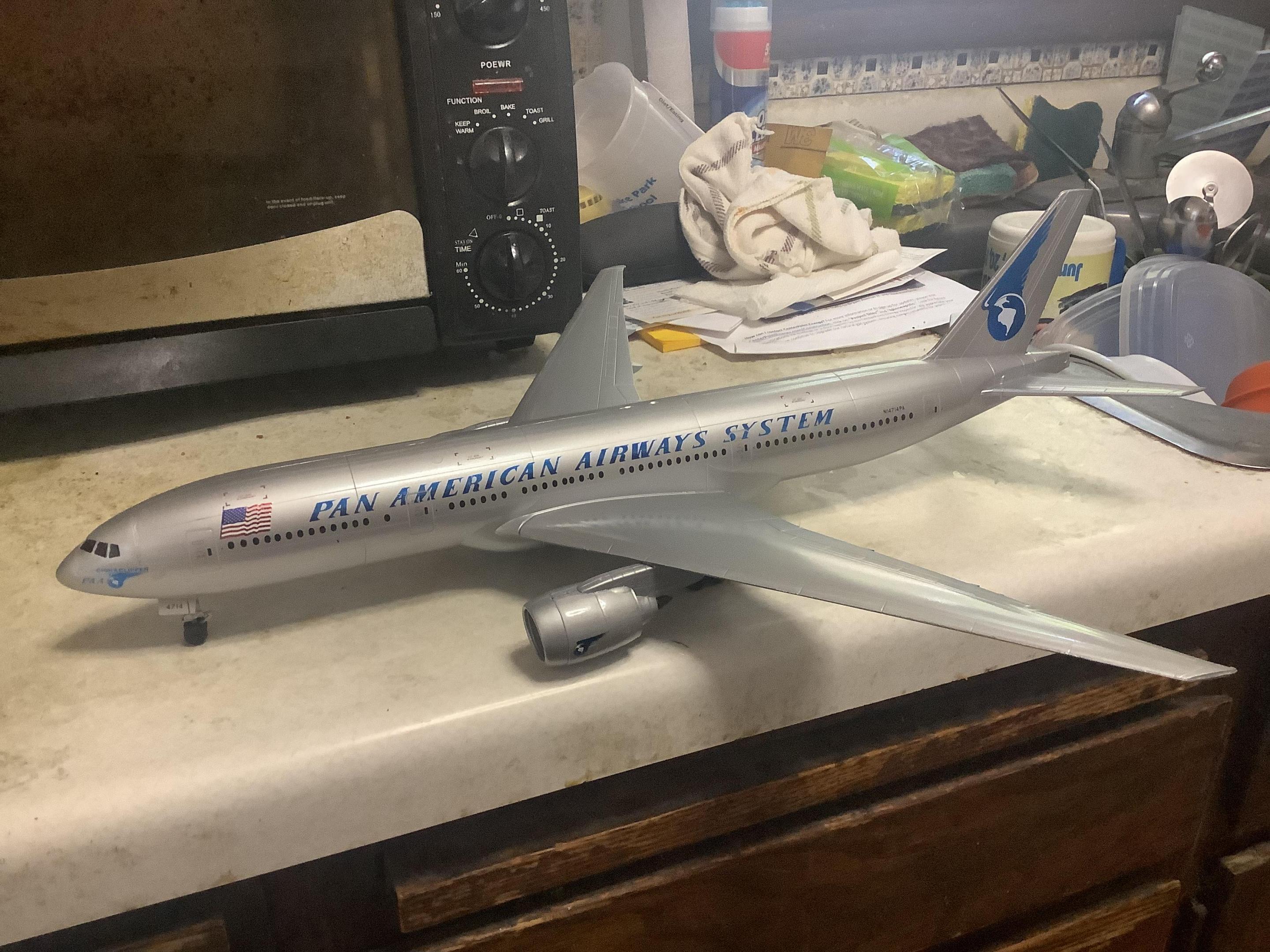 This is a fantasy plane. Pan Am was dead by the time Boeing introduced the 777. And the markings (decals) on this kit harken back to a time when flying was glamorous. Before they stuffed you into flying tubes with wings, like sardines, with little to no room or service. This model is part of Minicraft’s “Flights of Fancy” series of 1/144 scale commercial aircraft. I love it. I was never a big fan of Pan Ams “billboard” style livery they used on their plane near the end. Ive include a photo of Minicraft’s 1/144 scale Pan Am 727, for comparison in size of two aircraft and the livery. (Despite my dislike of Pan Am’s billboard livery, I am working on a 1/144 scale Revell Airbus A380-800 using that scheme.) I liked this kit a lot. It went together well. And the decals went down very nice. Ive got nothing to complain about. Minicraft suggested painting sections of the tops of the wings orange. This type of paint scheme was used on Pan Am’s flying boats back in the 1930’s and 40’s. But, never on their planes that landed on land. Plus I didn’t like the looks of it. So avoided following that suggestion.