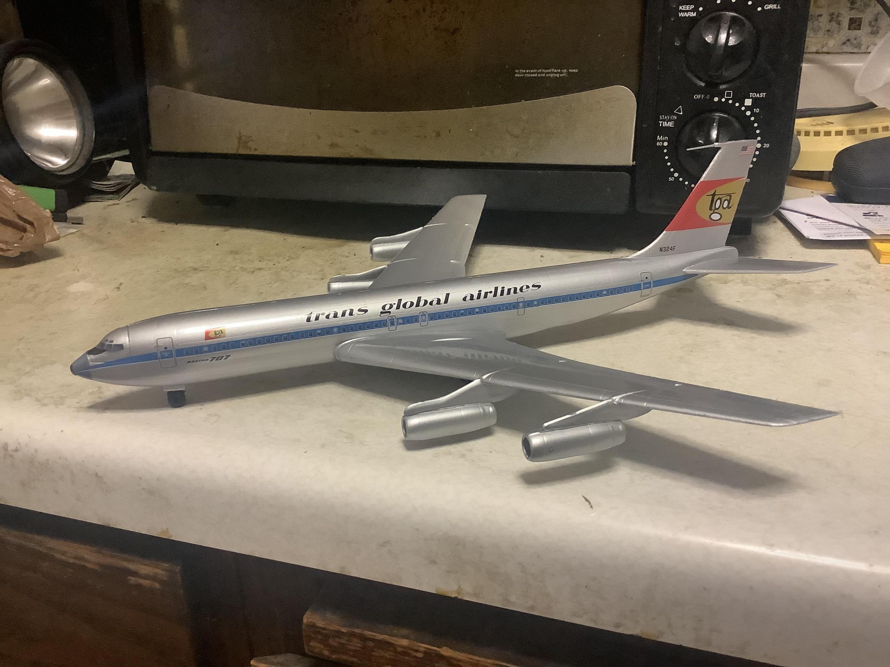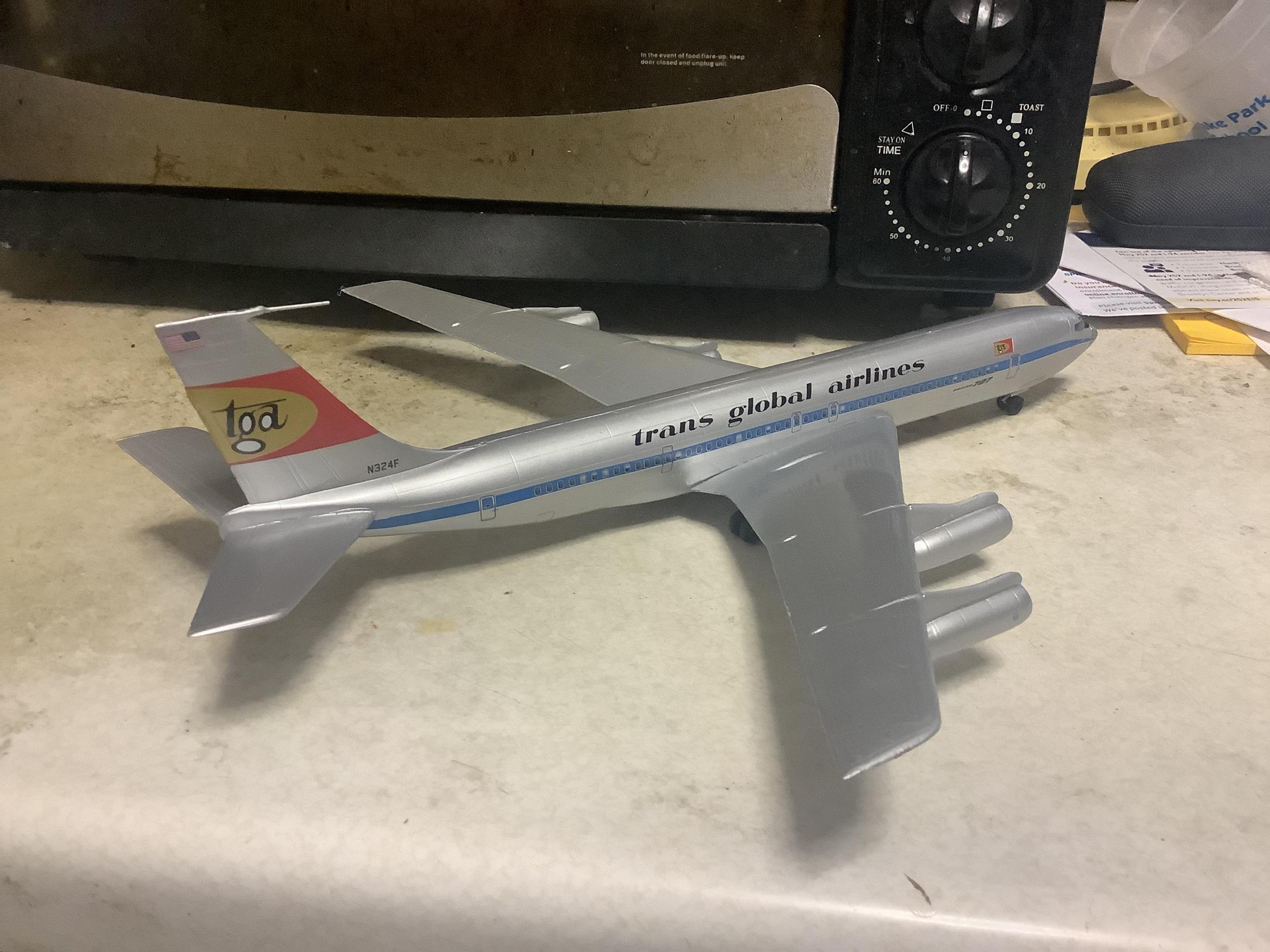 “That’s the nice thing about a 707. It can do everything but read.” I love Boeing’s good old 707. The plane that truly ushered in the commercial jet age. Despite DeHavilland’s Comet being there first. I also love old movies. And have always enjoyed the 1970 movie Airport. Most of the the shots of Chicago’s imaginary Lincoln airport, were shot here a Minneapolis. The I question from that movie, is whether I’d be willing to fly in airplane with Dean Martin as the pilot. I like Dean a lot. But, his on screen drinking, in other films and TV would make me question the wisdom of flying with him at the controls. Though he does have the first James Bond, Barry Nelson in the copilot’s seat. And Dean being Matt Helm, I assume he should know how to fly. On to the model. The kit is Minicraft’s TWA 707-331, in 1/144 scale. A fair kit quality wise. When all is said and done, it looks okay. Decals are from Vintage Flyer Decals. And are in general are very nice decals. Giving few to no problems in their application. This is not the first time I’ve used Vintage Flyer Decals. Ive been pleased enough with them, that I plan on using them on more in future builds.