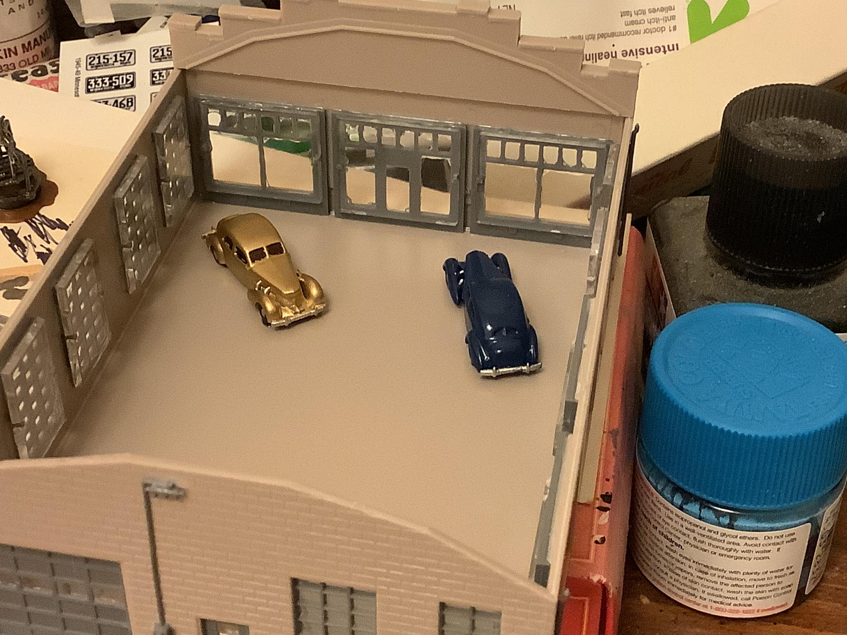 Another N scale building. This time, Walthers State Line Farm Supply, converted to a Cord automobile dealership. With two Shapeways 3D printed, N scale 1937 Cord 812 Beverly sedans on the show floor. (Shapeways claim they are 1935s. Since Cord 812s were only offered in 1937. And the similar Cord 810s in 1936. I’m assuming they mistaken in listing them 1935s.)