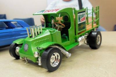 Finished this up just in time for the latest MCCM meeting this last Wednesday. Another member took the photos. A little disappointed in the front view photo. For some reason in that photo the paint looks like it has orange peel. Trust me, it looks smooth in real life. Other than that I'm very happy with the build. The kit is from the last reissue of the AMT/Ertl 1929 Ford Woody/Pickup kit. This a great kit. Very fun to build. And yes, this is the kit that comes with the Sting Ray bicycle seen in the photo. Originally tooled up and offered as an MPC kit back in the mid-60's. The Wild One. Which came with the surfer icon "Hot Curl". This is a kit I wish Round 2 would reissue with Hot Curl and his surf board restored to the kit. Scott Aho P.S. There was one part in the kit that confused me. It was not shown in the instructions. And it didn't look like it fit anywhere or served any propose. As I looked at it the other day, it dawn on me. It's a 1/25th scale skate board! So I'm not completely finished with kit. Got to do something kool with Hot Curl's skate board.