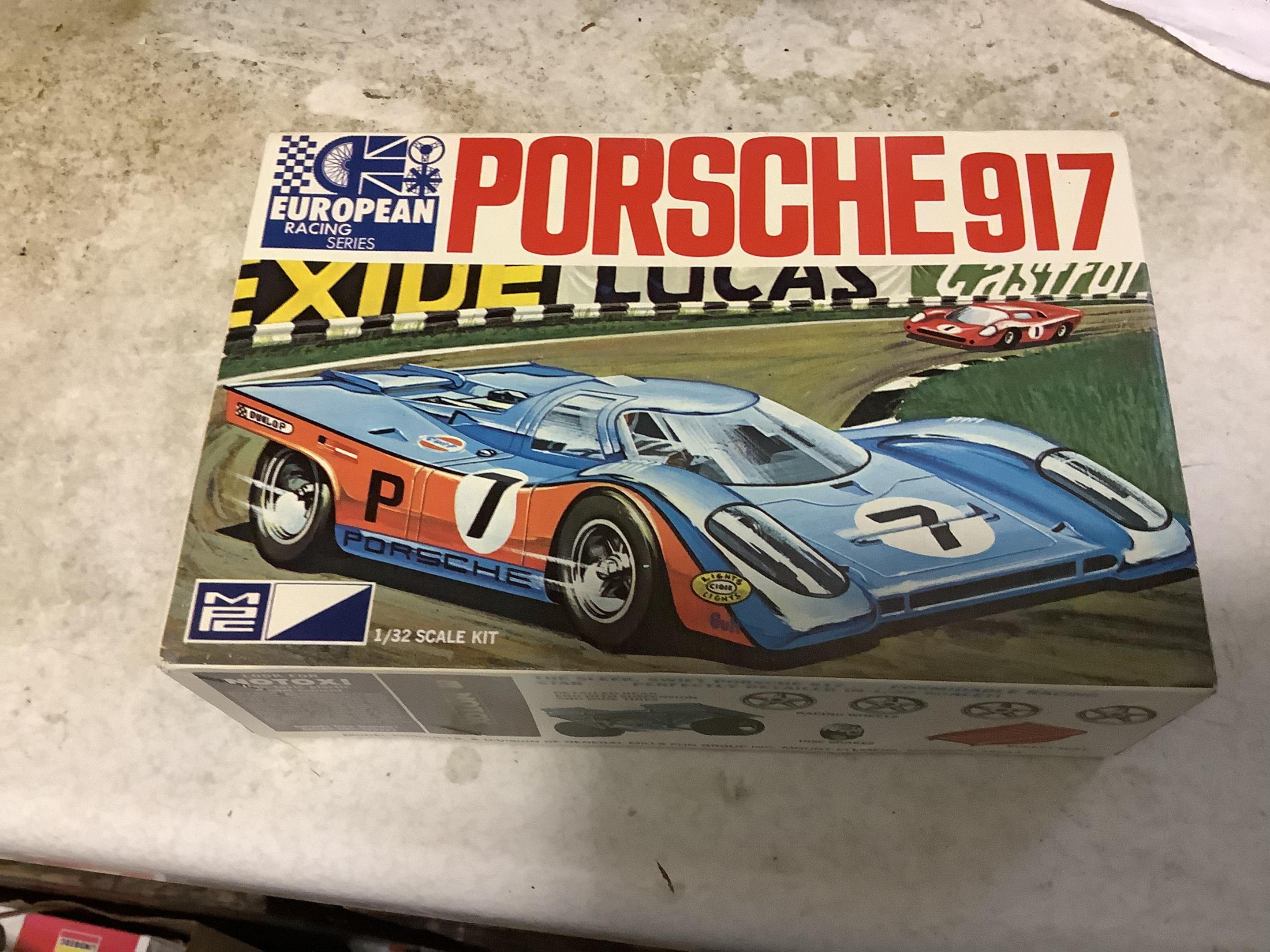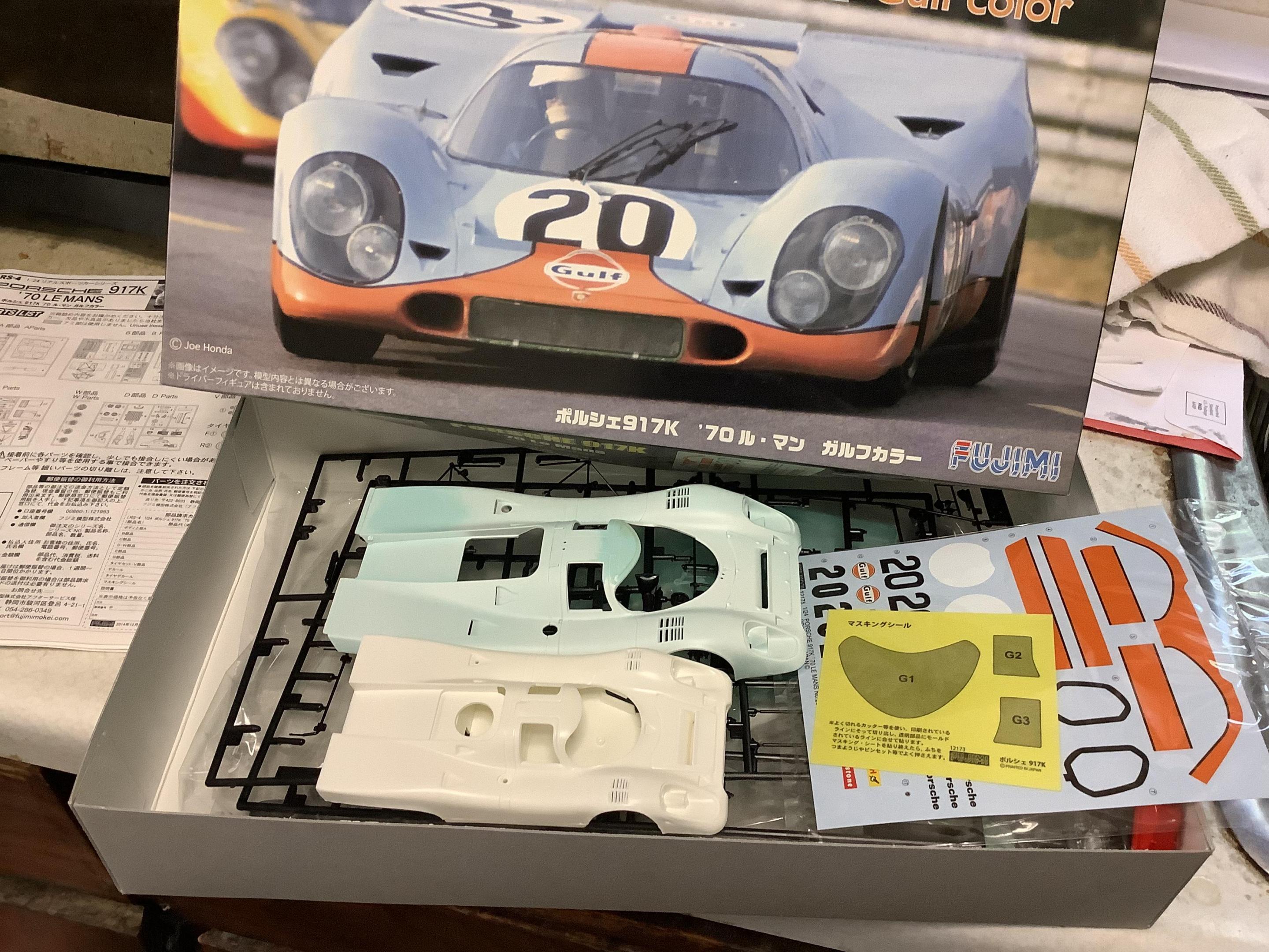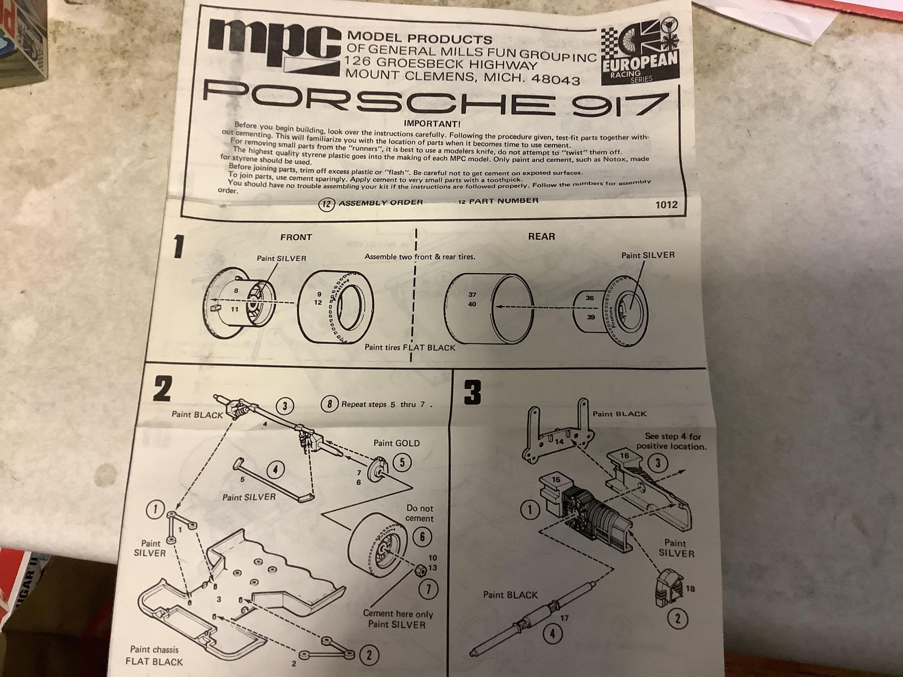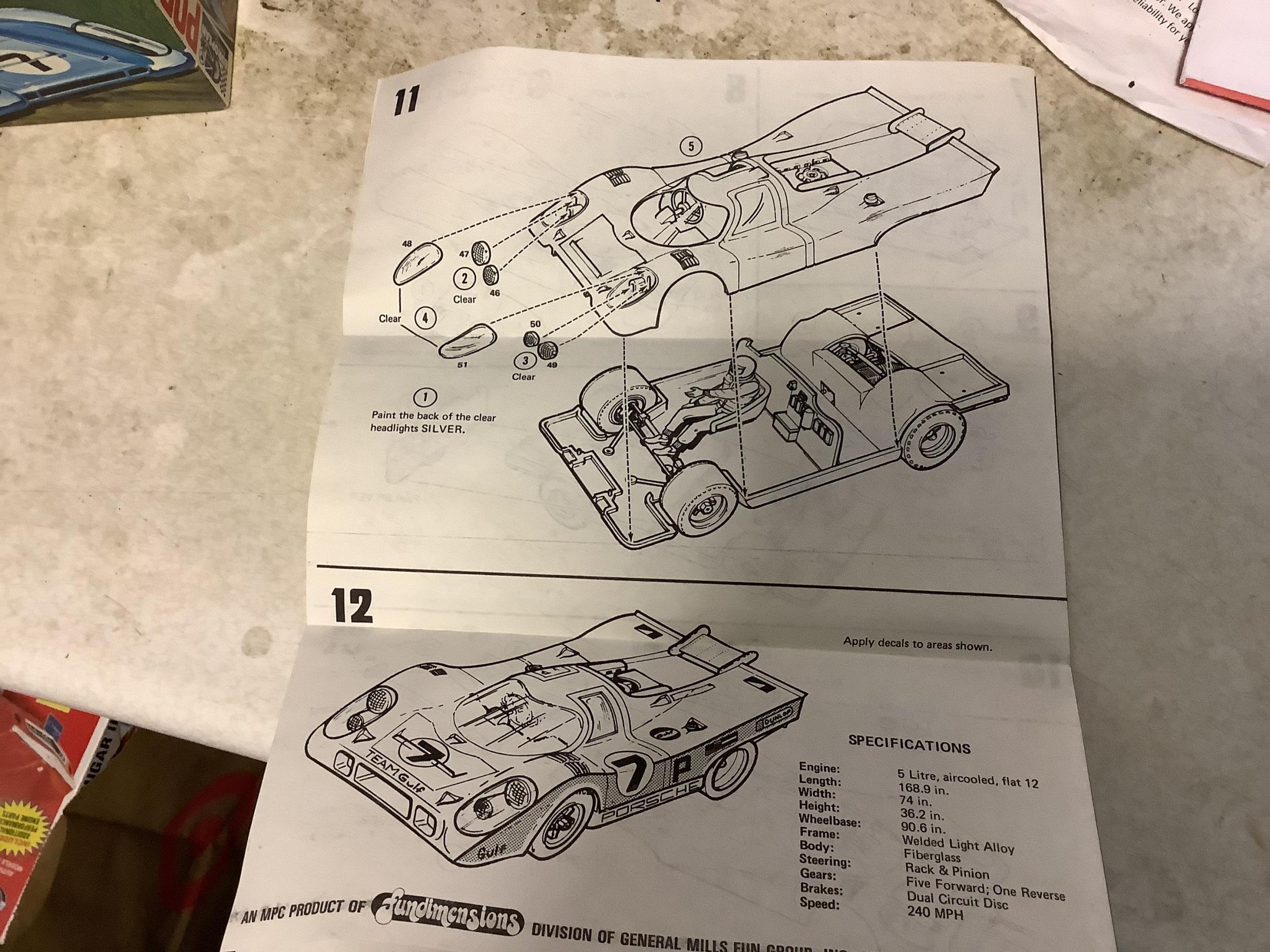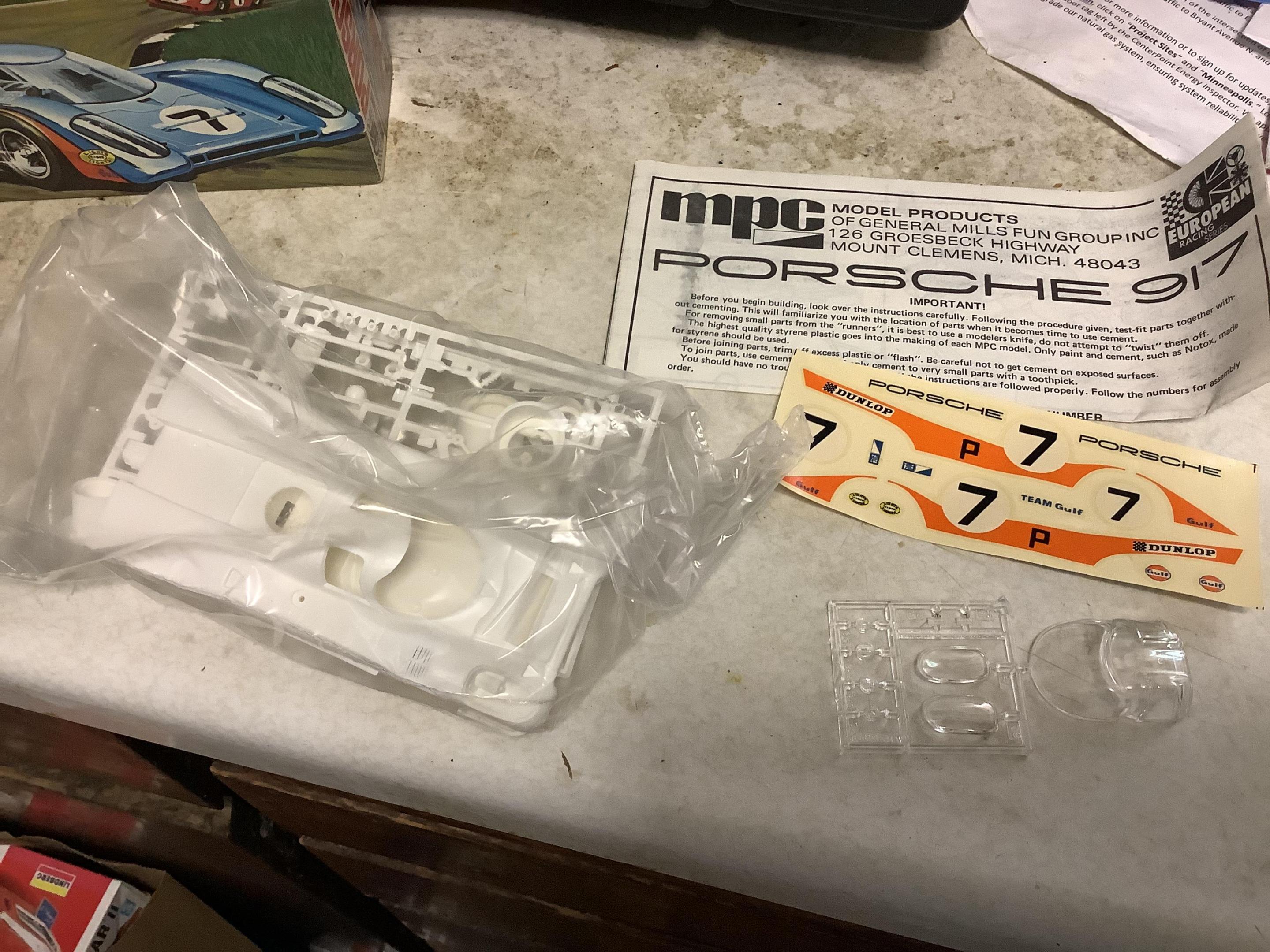 All right! My MPC (Airfix) Porsche 917 arrived in today’s mail. I ordered it on Friday. It’s here on Monday. Can’t ask for quicker service than that. The kit came new, still wrapped in it’s original plastic. (I was so excited to see what was inside. I didn’t think of taking a picture before taking the plastic off.) Because of this everything in the box was pristine. Even after sitting in the box for nearly 50 years, the decals look okay. As you can see from the photos below. I’m pleased. Two other things. One photo shows a comparison with my almost finished AMT/Matchbox Porsche 917/10. Another photo shows another Porsche 917 I got in todays mail. Enjoy! (Though sorry about the poor quality for photos. I did the best I could with what I have.)