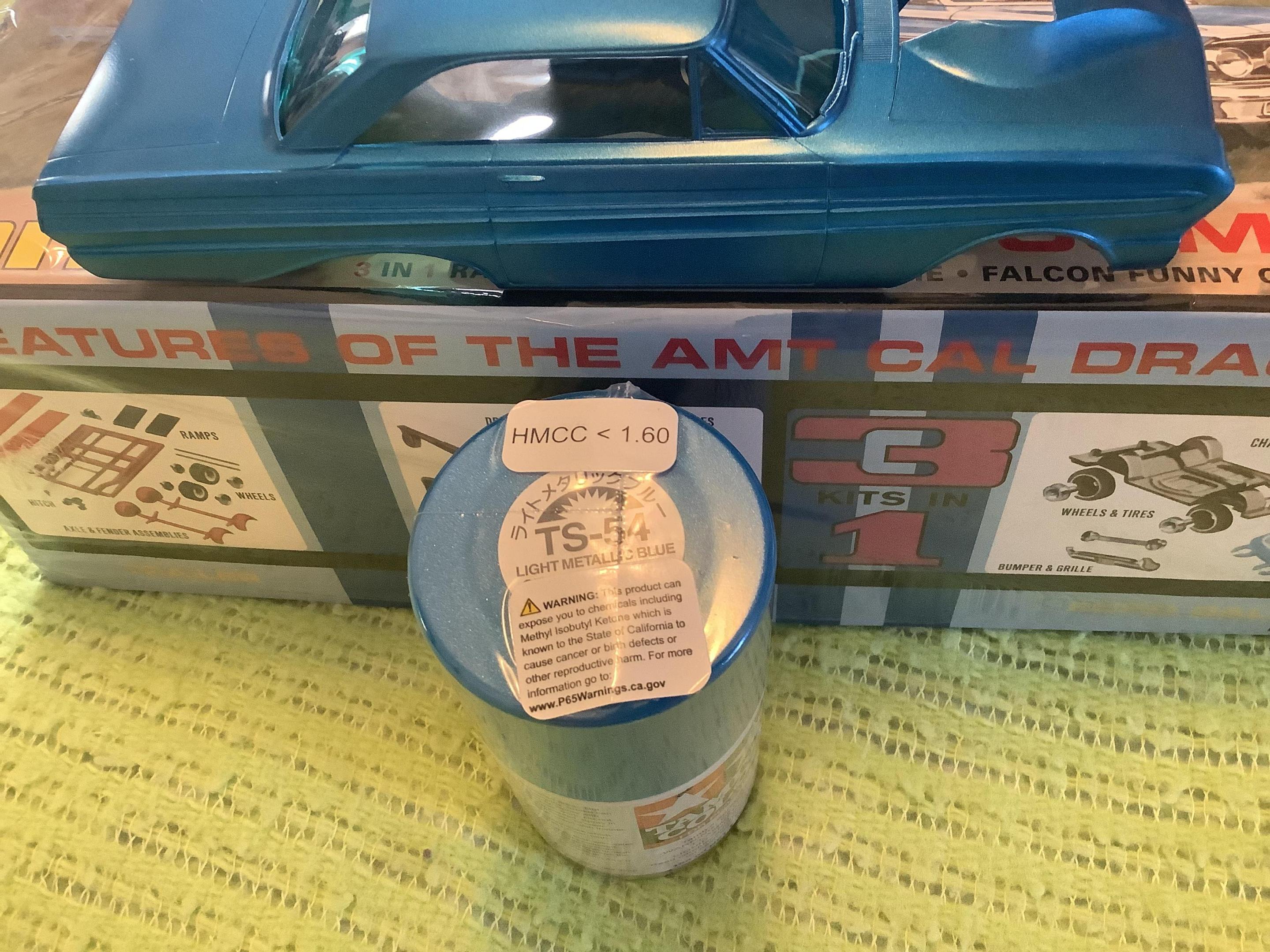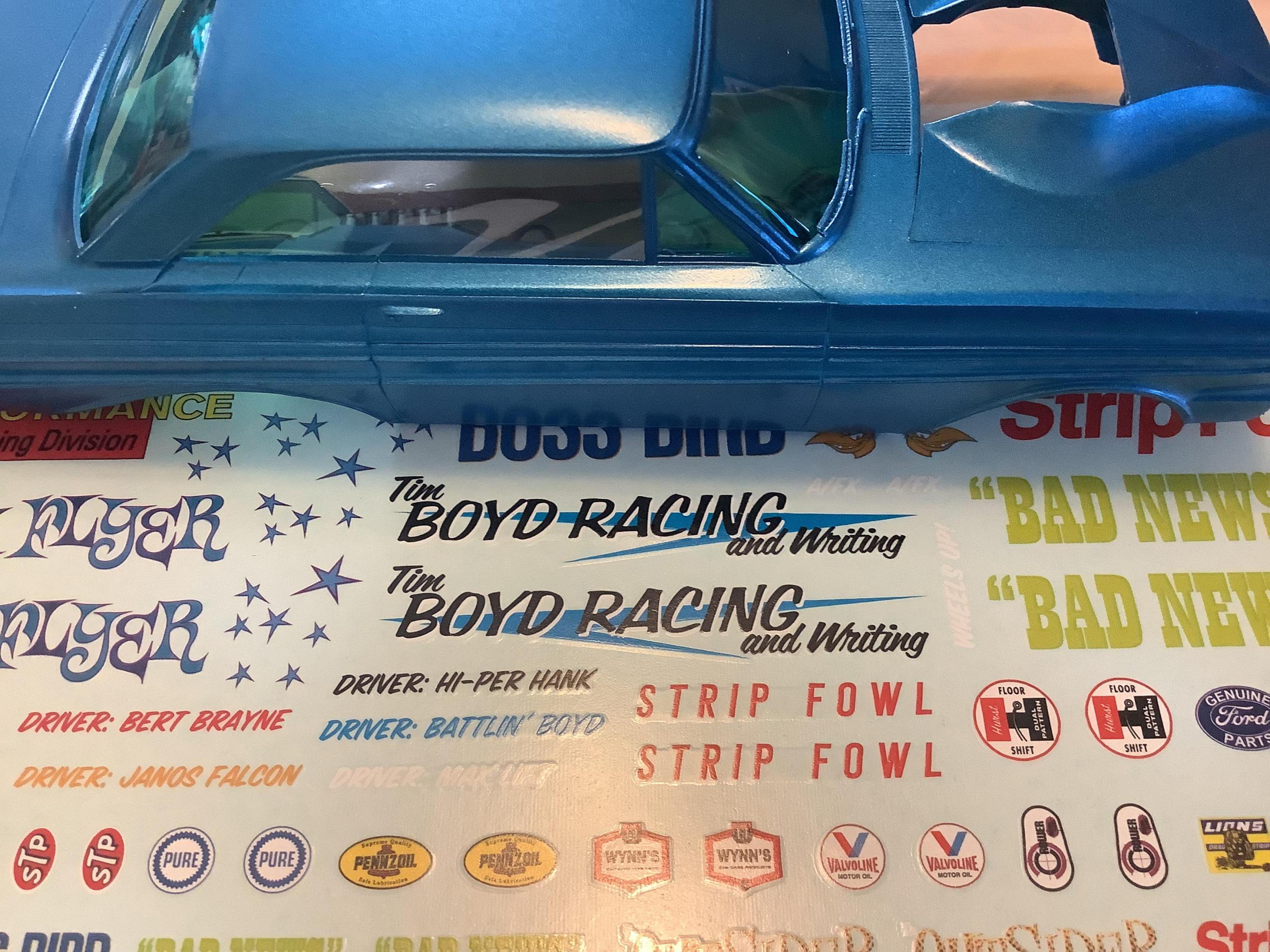 Oh! I forgot. What should have been my all time favorite drag racing model, is AMT’s Cal Drag Combo Falcon Funny Car. With the Tim Boyd Racing and Writing decals used as the sponsor for the car. The only reason it did not make it as my favorite, is because the Tim Boyd Racing and Writing decals, and the Driver: Battlin’ Boyd decal will not show up well with the color I choose to paint my Falcon, Galaxie, and trailer. And that is with Tamiya’s TS-54, Light Metallic Blue. Which is really not a very light blue as you can see below. And too close to the color of the decals I mentioned above. Which you can also see below. Bummer! Now, before people start jumping on me. The above is all done tongue in cheek. Giving a fun little poke at Mr. Boyd, whom I have the greatest respect for. I did seriously debate painting the Falcon white, to use the “Boyd” decals. And it is a shame they would not show up on my Falcon in the color I choose paint it in. Not to embarrass Mr. Body, but it would have been fun to use them. -