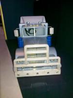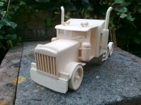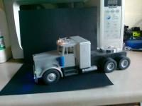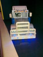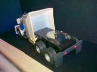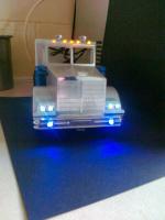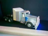 The black rig started out same as the red original truck. Did a few modifications...Extended the cab & added aerofoil to the roof,(made from balsa wood). Mirror brackets made from large staples. Primed & painted. Added larger custom exhausts (chrome gas pipe) & finally fitted the lights! All comments welcome. Cheers, Andy.