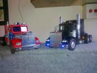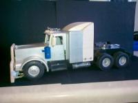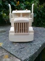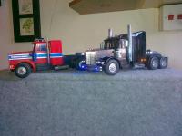 The black rig started out same as the red, original truck. Did a few modifications.. extended the cab & added aerofoil to the roof, & mirrors,(made from balsa wood), made the mirror brackets from large metal staples, Primed & painted. Added larger custom exhausts (chrome gas pipe) & fitted the lights. All comments welcome. Cheers, Andy.