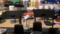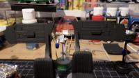 2nd coat of primer and under carriage done with can paint, gloss black. this build is gonna be more challenging then I thought. curdside dont mean its easy...sweet baby black jesus!!!!