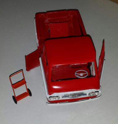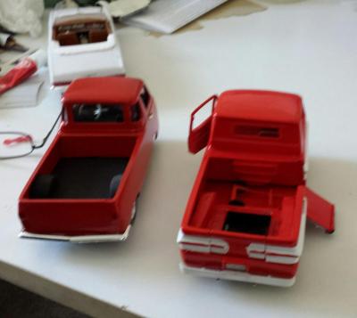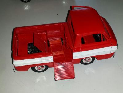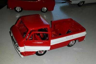 10. As a confessed Corvair nut, I'm happy to see any Corvair kit reissued. Of course, if I had it my way, I sure would like to see AMT reissue a pre-'65 Vair. Likewise, wouldn't it be great if some model manufacturer would tool-up a decent Corvair truck or Van? All we've ever had was that miserable little Premier kit claiming to replicate the Corvair "Rampside" pickup. Well, there's at least one Rampside model out there that I've seen. One of the members of my local model club, Ken Knose, decided to build one. See the attached photos. Believe it or not, the basis for the truck was the Lindberg reissue of the old "Little Red Wagon" Dodge. He built the Rampside without the benefit of having seen one, just working from a handful of magazine photos for reference. The other truck in the photo is Ken's Ford "Econoline", which likewise started out as a Little Red Wagon!