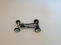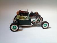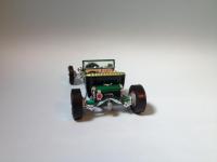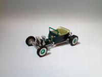Hi Folks: Here's my '25 T-Bucket, which I call "Shamrock" due to the metallic green color (plus I unveiled the rough draft on the weekend of St. Patrick's Day). I finally got it done after working on it off/on for approximately one year. My local model club decided to adopt the AMT '25 T as the official kit for our internal contest last year. I'm not much into Model-T or Model-A Fords, but I decided to play along and build a couple (I do respect the Model T's place in our American automotive history). Since I don't have much background with these cars, I read some 1:1 magazines to get some ideas. I spotted a roadster with this color scheme, and really like it. I also read where there's a trend towards using "alternative" powerplants these days, instead of the traditional Ford Flathead or SBC V-8, so I looked around in my stash and came up with something *really* alternative. I leave it to some of you more eagle-eyed observers to see if you can identify it. This was built mostly "out-of-the-box", with some mild kitbashing. Wheels are from the recent "Sock-It-To-Me" '62 Vette kit, with the brake drums from the '25 T Ford "phonebooth" version, modified to fit together. I got the rear tires out of the recent tire "parts pack" so the white wall sizes would match (the kit-issued tires didn't match). I fabricated the gas tank, using the chromed tank end-caps from a couple of the Model-T kits. Tail light is from the recently reissued "Fire Truck" model-T show car. Paint is Testors Metallic Green with Testors Citrus Yellow interior. I hope you find it amusing. Comments/questions/suggestions are always welcome - I'm always looking to improve. For those interested, the engine is a "Wankel" 4-Rotor rotary, which I sourced from an MPC '74 Corvette kit. "Corvette, you say"? For those who weren't around then, or don't recall, Chevy briefly considered powering a restyled Vette with a rotary. They even licensed the engine for production, and ultimately built a concept car. The project went away about as quickly as it came. I've always thought it would've been neat, though, as the engine supposedly would have developed 350HP. Anyway, that's more than sufficient HP to motivate my little T-Bucket!