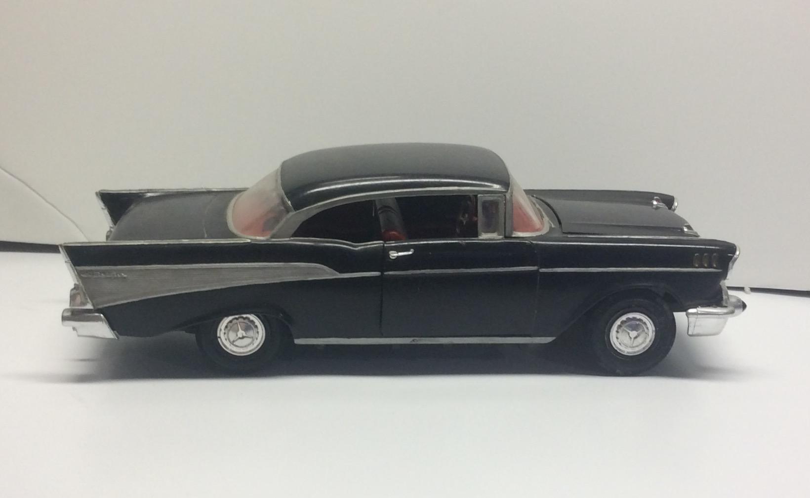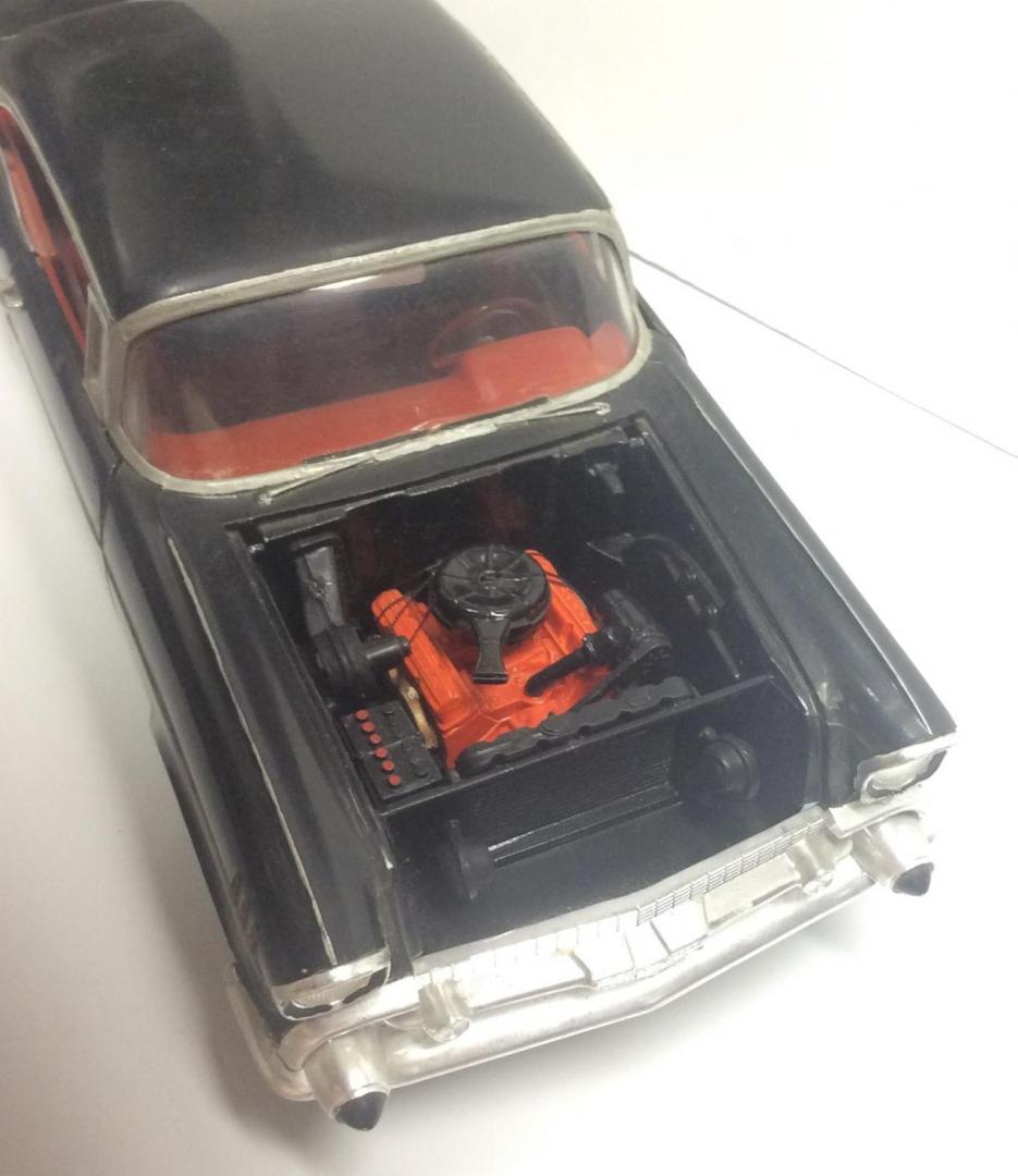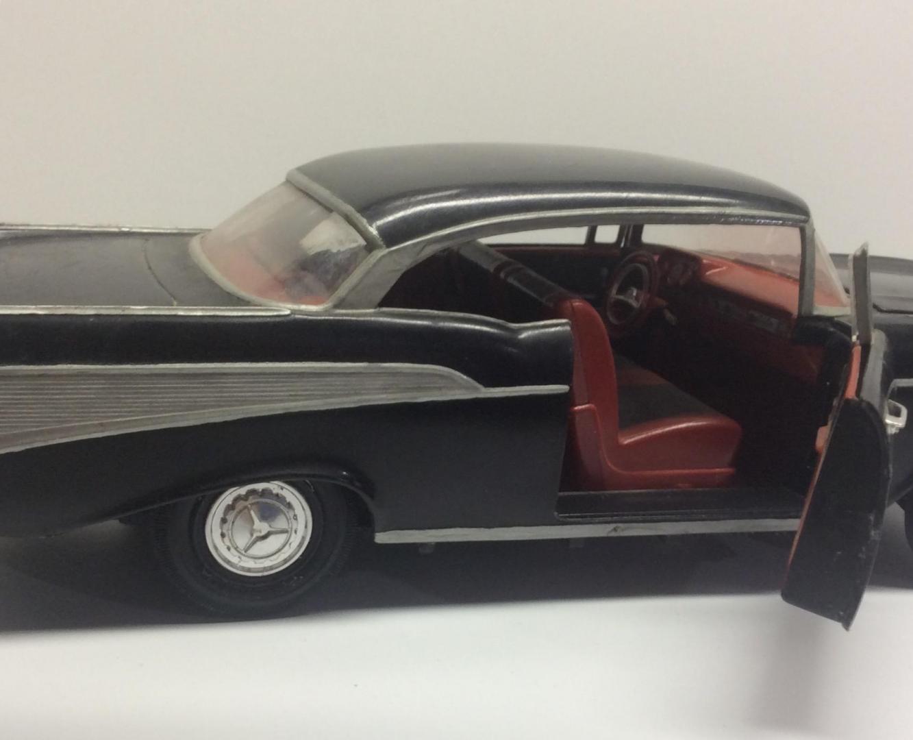 I know that a lot of you guys buy old built-ups and actively look for them. Have you ever had one of your own come back to you, sort of like a boomerang? Referencing the attached pix, a nearly 40 year old built-up of mine has come back to me. I had a friend and mentor named Sam who was a big part of my life until he passed away a while back at age 86. He was a true car nut, and I believe he had 30HD in his veins instead of blood. He was an expert mechanic and body man, and had restored several classic 1:1 to concours standards. The big thing for me, though, was when he helped me buy my first car and fix it up, a rusty and beat-up '62 Corvair Monza coupe. Sometime later, I built this AMT 1/16 '57 Chevy as a birthday present for him, which replicated one of his trophy-winning beauties. It definitely leaves a lot to be desired, both by my current build standards and by those of this Forum, but as the saying goes, "it's the thought that counts." What really got me was the fact that he had kept it all these years. His family found it in a glass enclosed bookcase in his den, along with the original note that had accompanied it in June 1979, as they were dealing with his estate. They contacted me and told me about it, and offered it to me as a memento. Ah, the memories. R.I.P., Sam. I remember a bit of a poem I read somewhere - "If there's a loose brick on the streets of gold, he can fix it. If the hinges on one of the Pearly Gates are loose, don't worry Saint Peter, he can fix those, too. And now he has wings...."