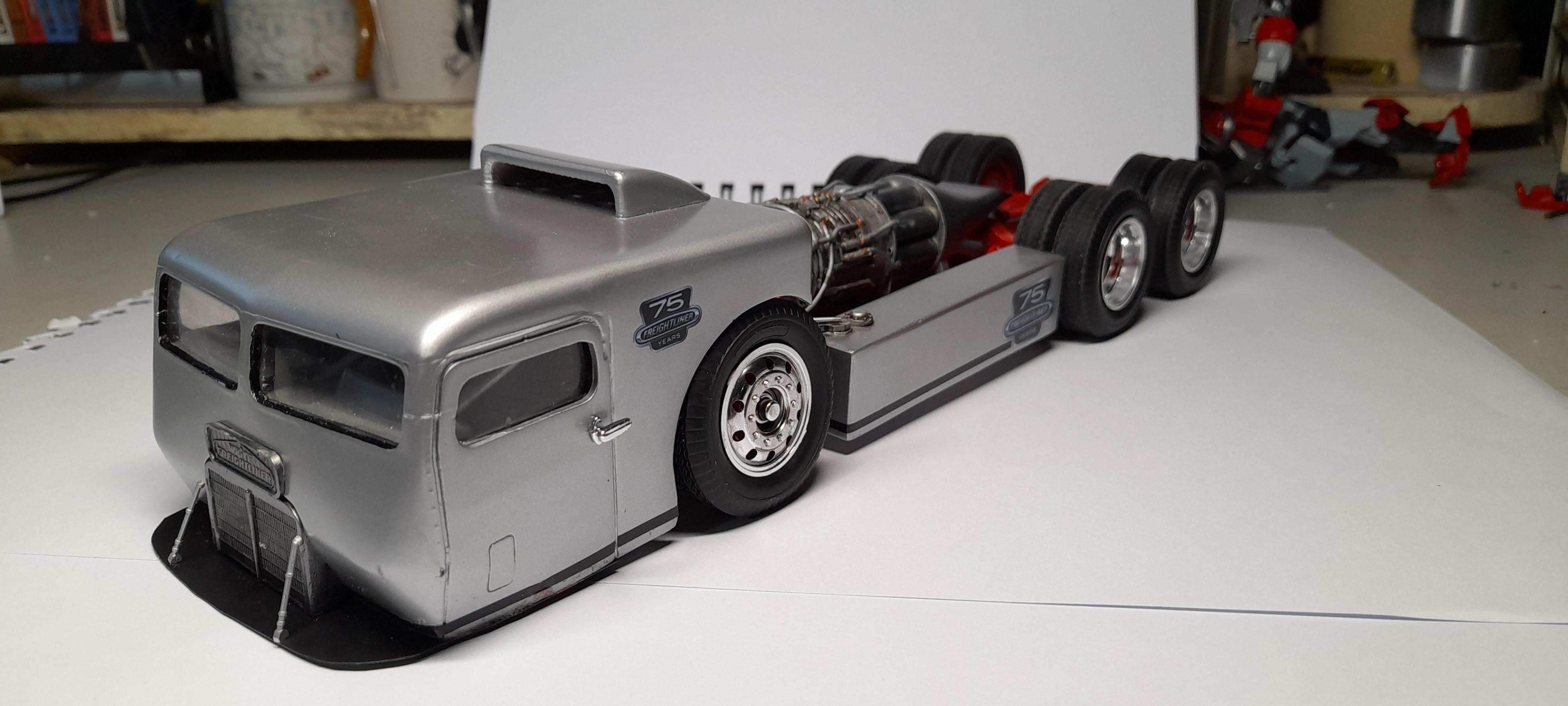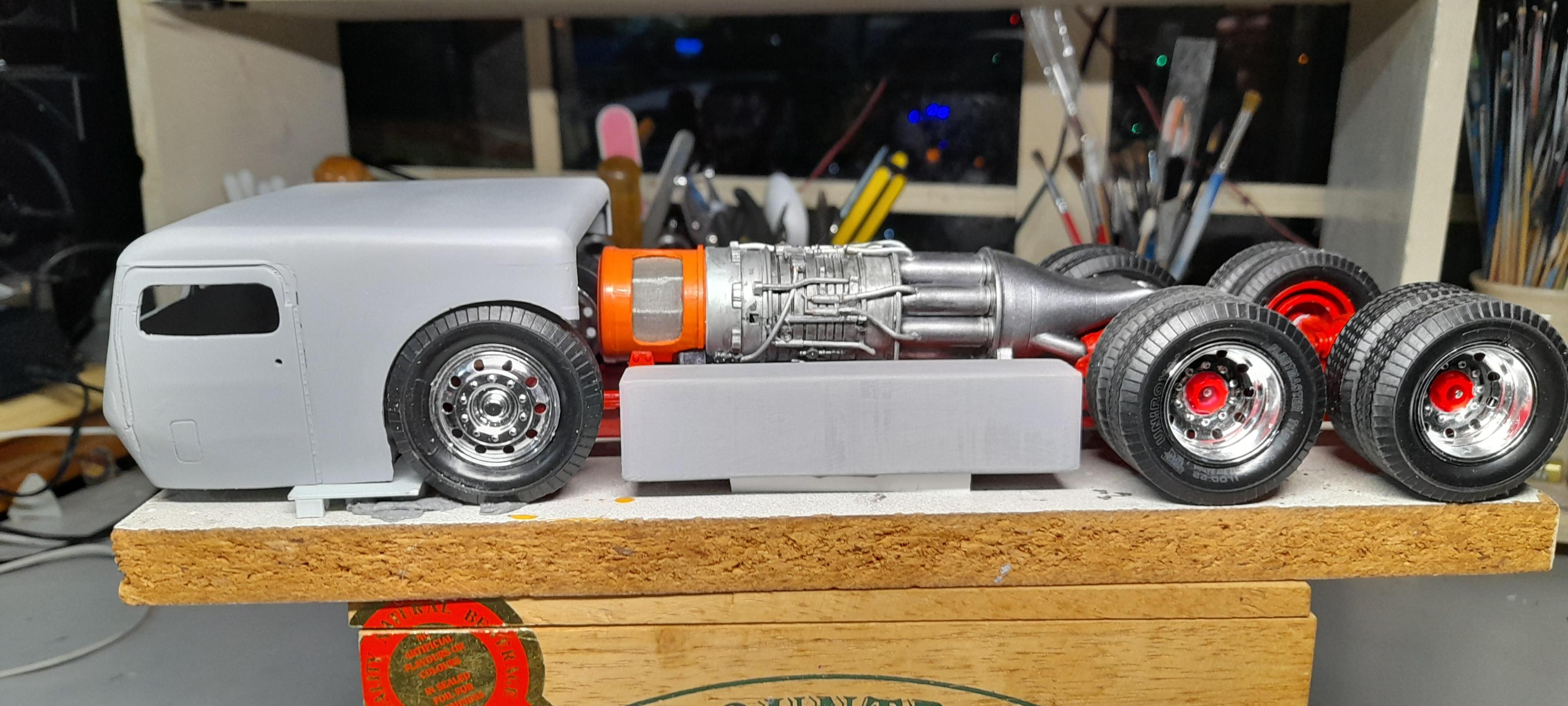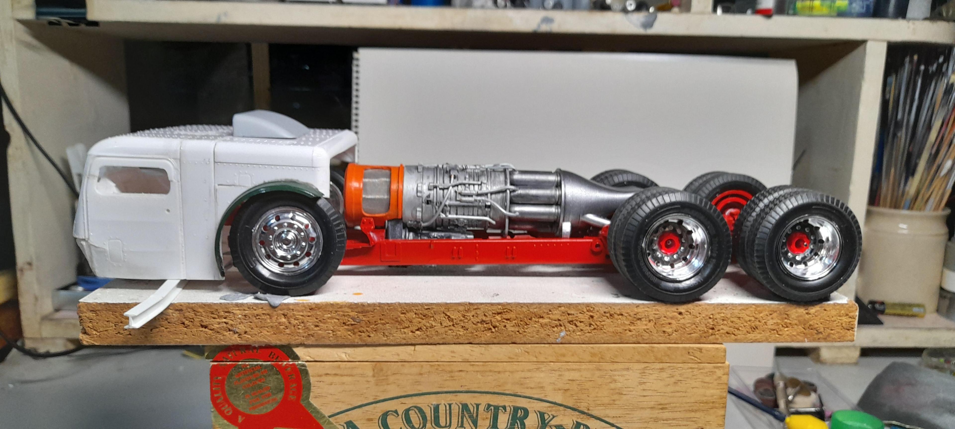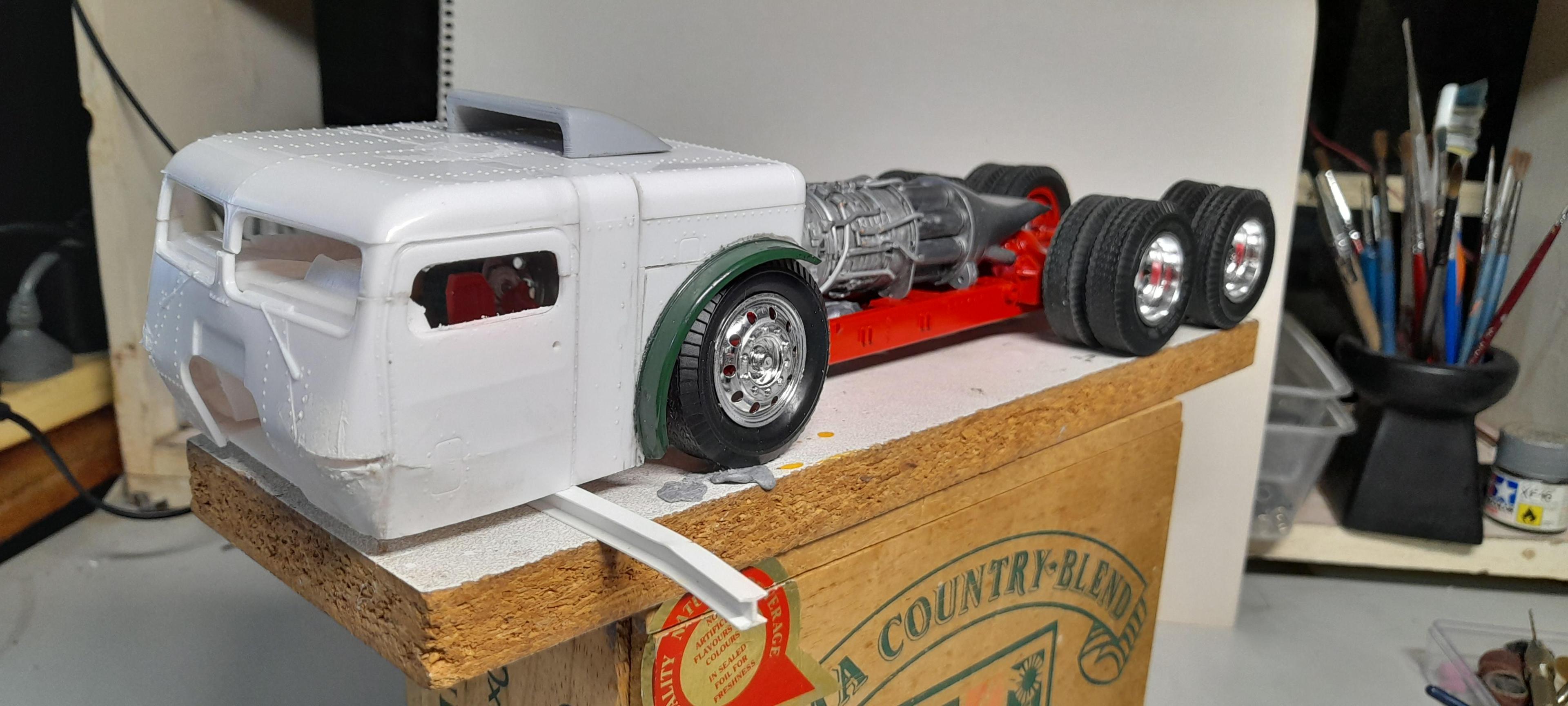 Always wanted to do a Rat Rod truck and I've been looking for something that can showcase the Sabre engine I've had for ages. Had to have dual drive and a cab over although it's now a cab forward.... way forward. Lot of body work to go and the saddle tanks will be scratch built rectangular items with proportions to match the cab. Original kit was the AMT White-Freightliner with the chassis underslung. Happy if you get a laugh out of it Brian