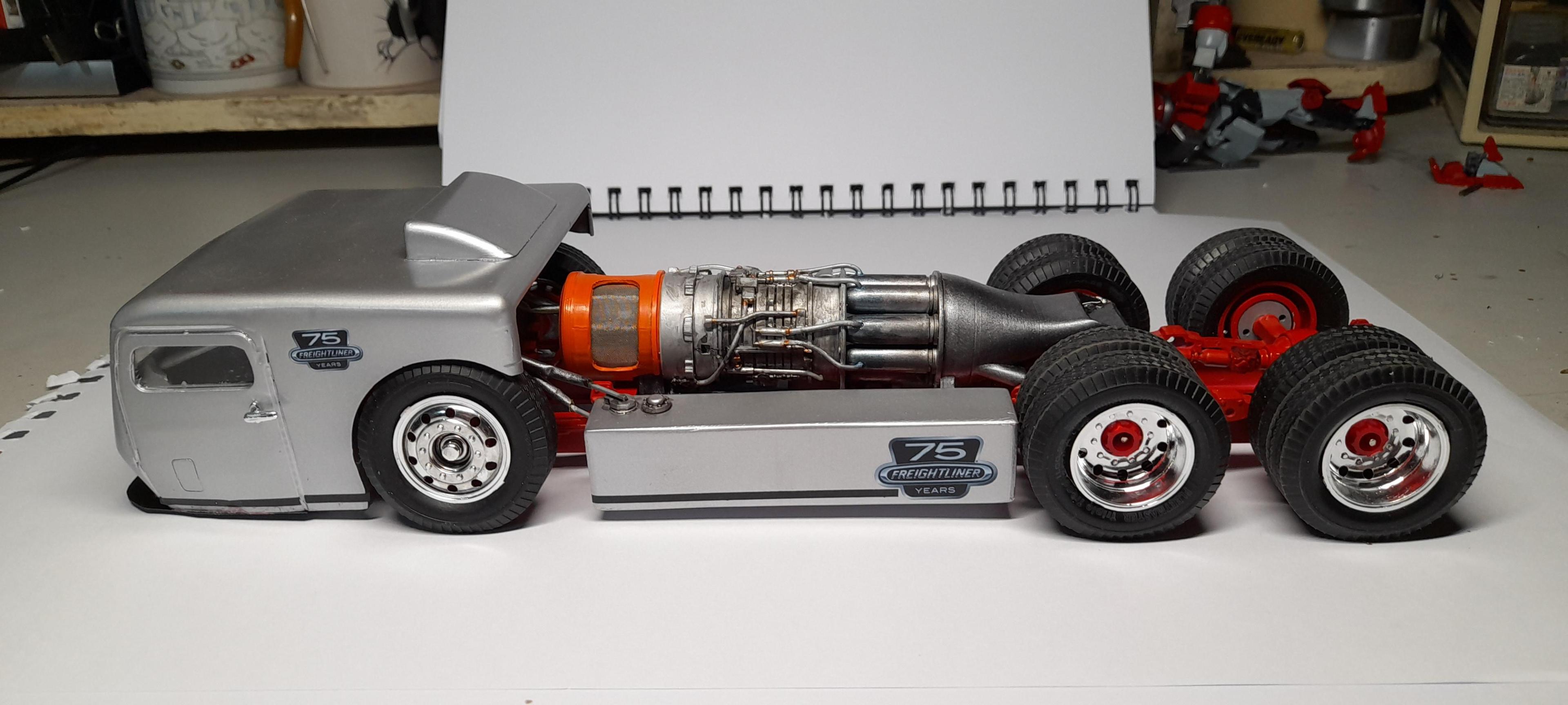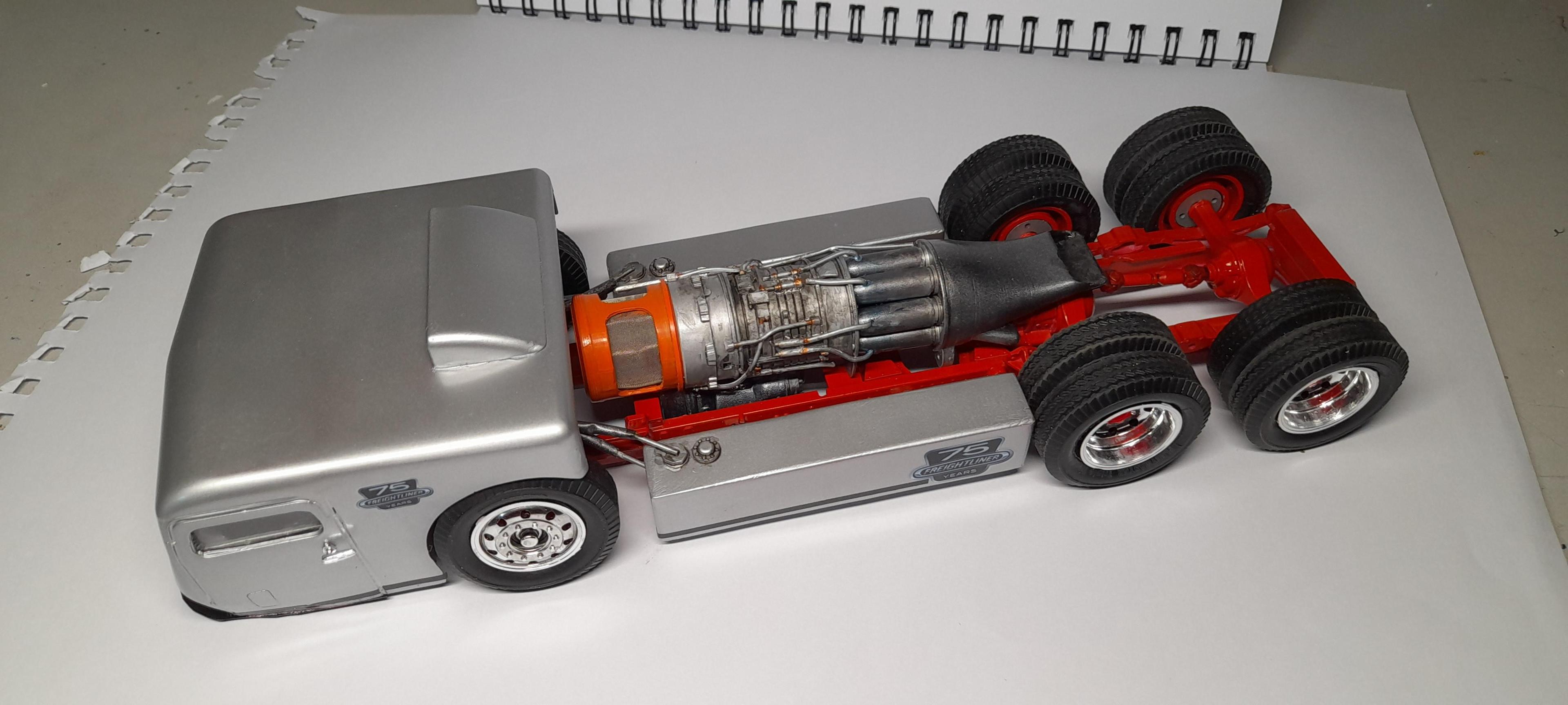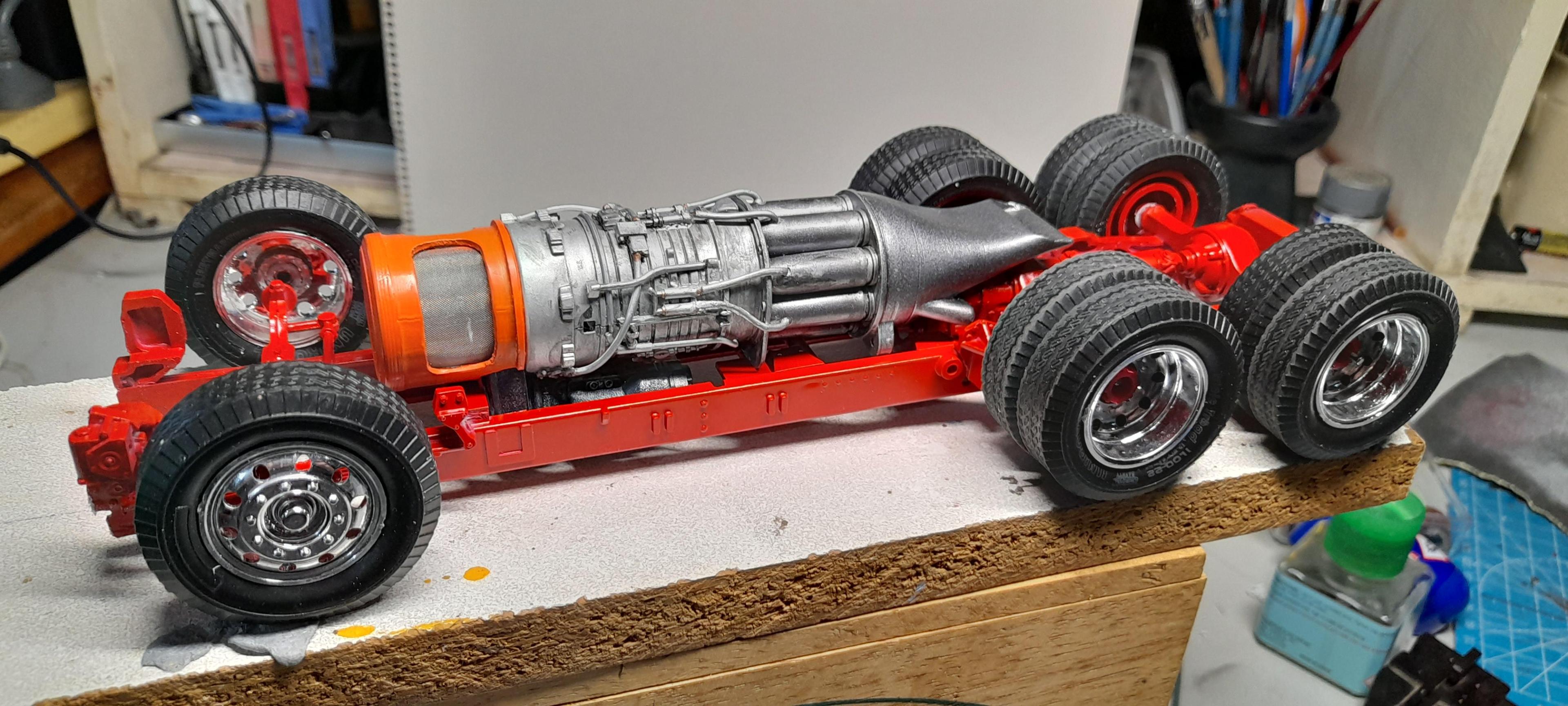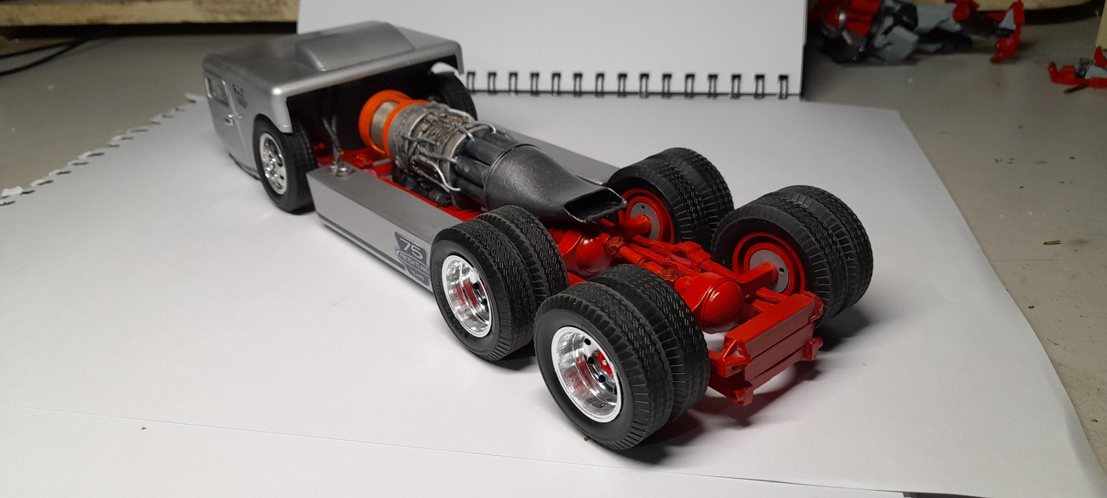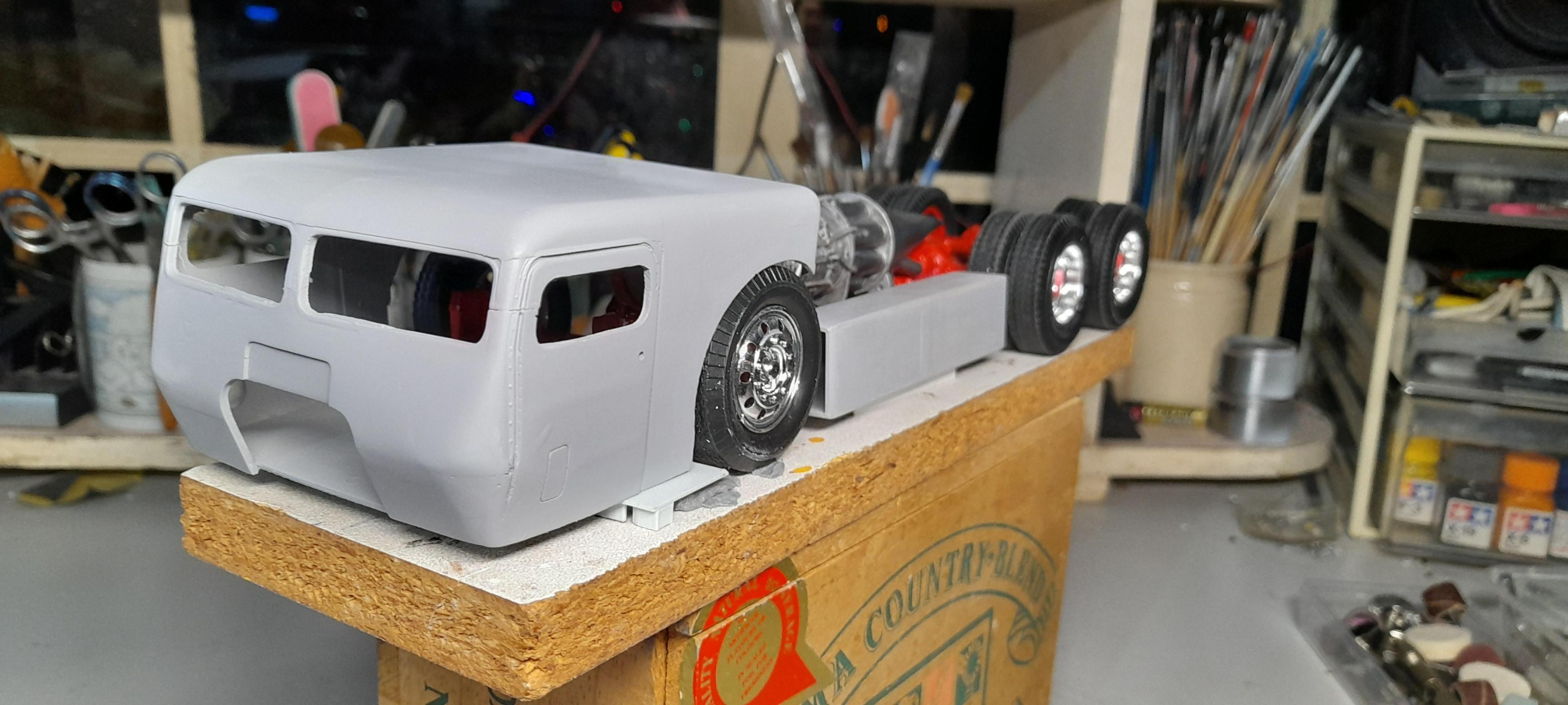 Always wanted to do a Rat Rod truck and I've been looking for something that can showcase the Sabre engine I've had for ages. Had to have dual drive and a cab over although it's now a cab forward.... way forward. Lot of body work to go and the saddle tanks will be scratch built rectangular items with proportions to match the cab. Original kit was the AMT White-Freightliner with the chassis underslung. Happy if you get a laugh out of it Brian