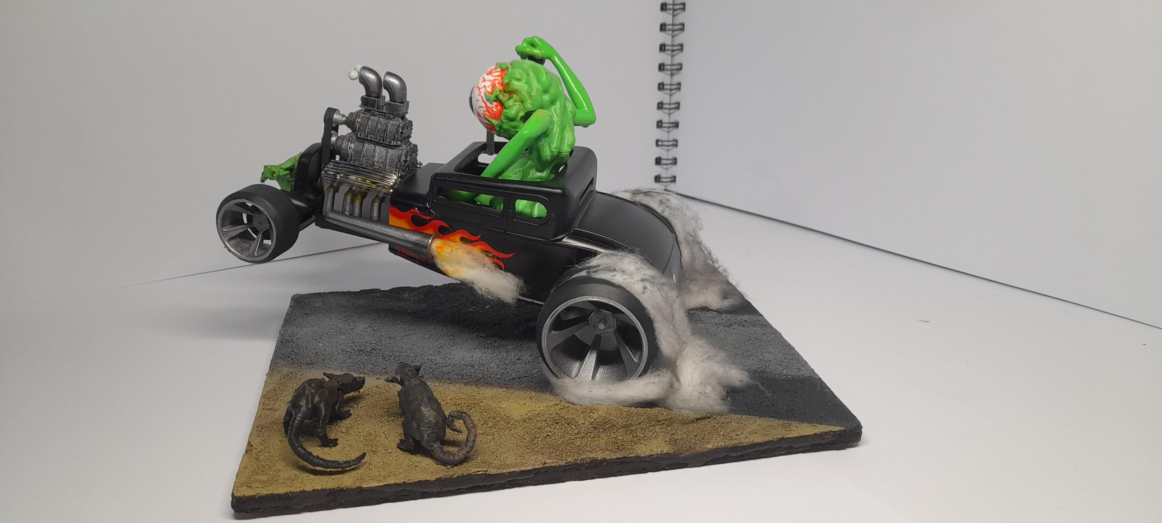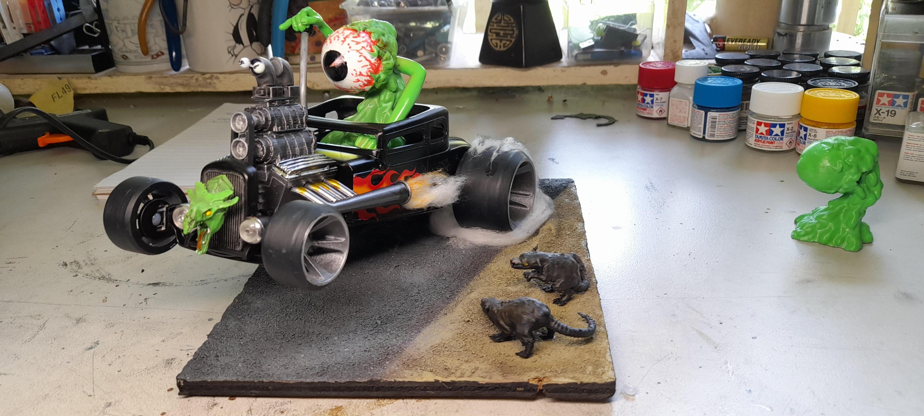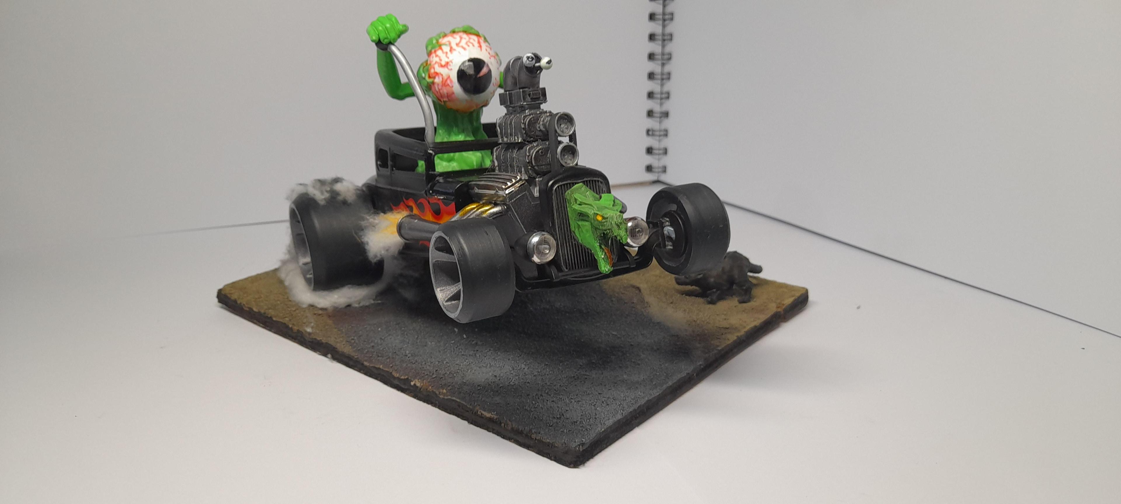 Not sure if this is the right place so feel free to move it if needed. Started out with the Moebius Eye Gone Wild kit. While the artwork was kool the kit was pretty staid so I modded the shell and found a more appropriate driver. Wheels needed upgrading and it wouldn't look right without some tyre smoke and some rats. Lot of fun. Happy New Year!! Brian