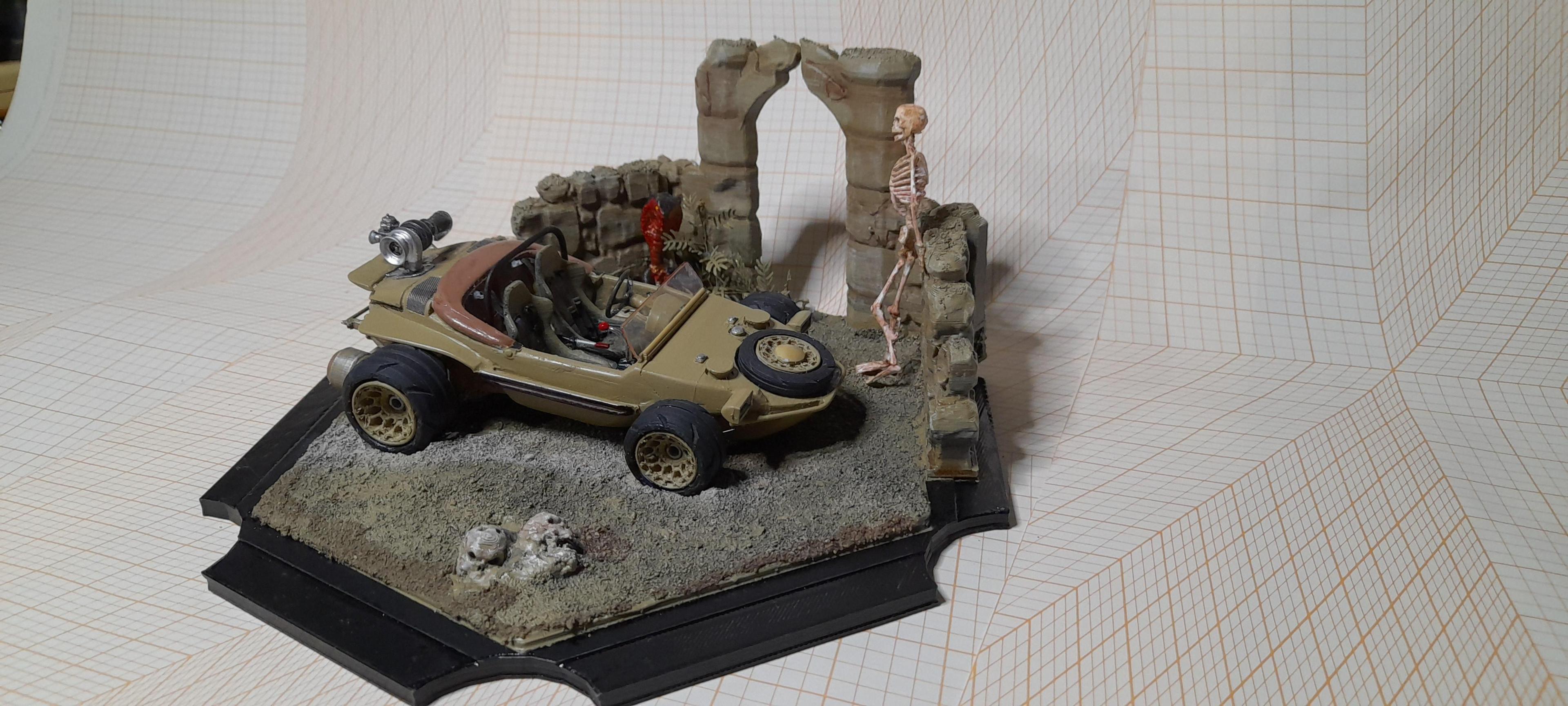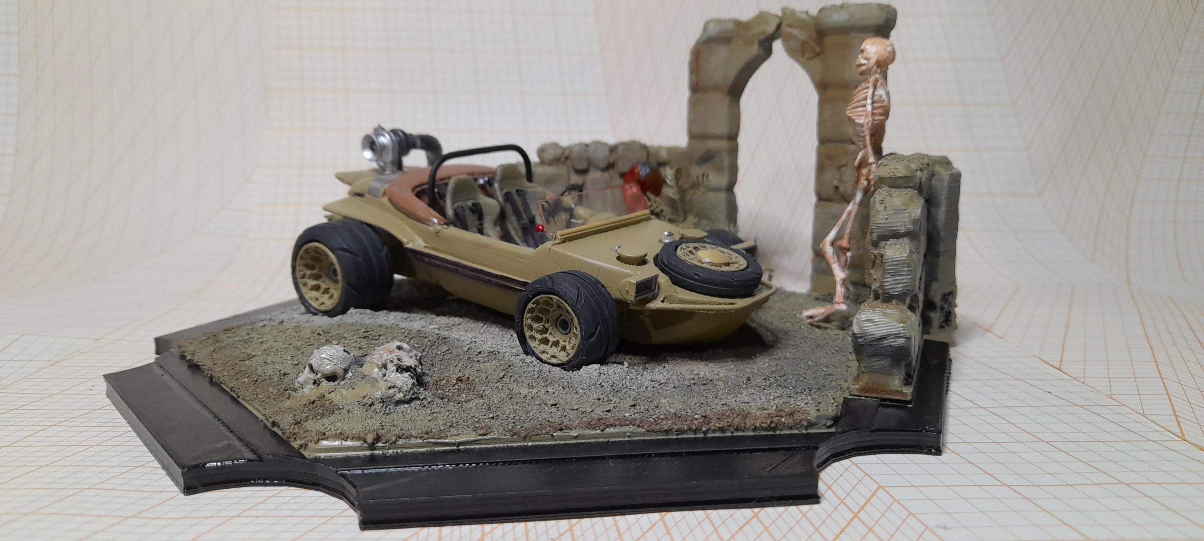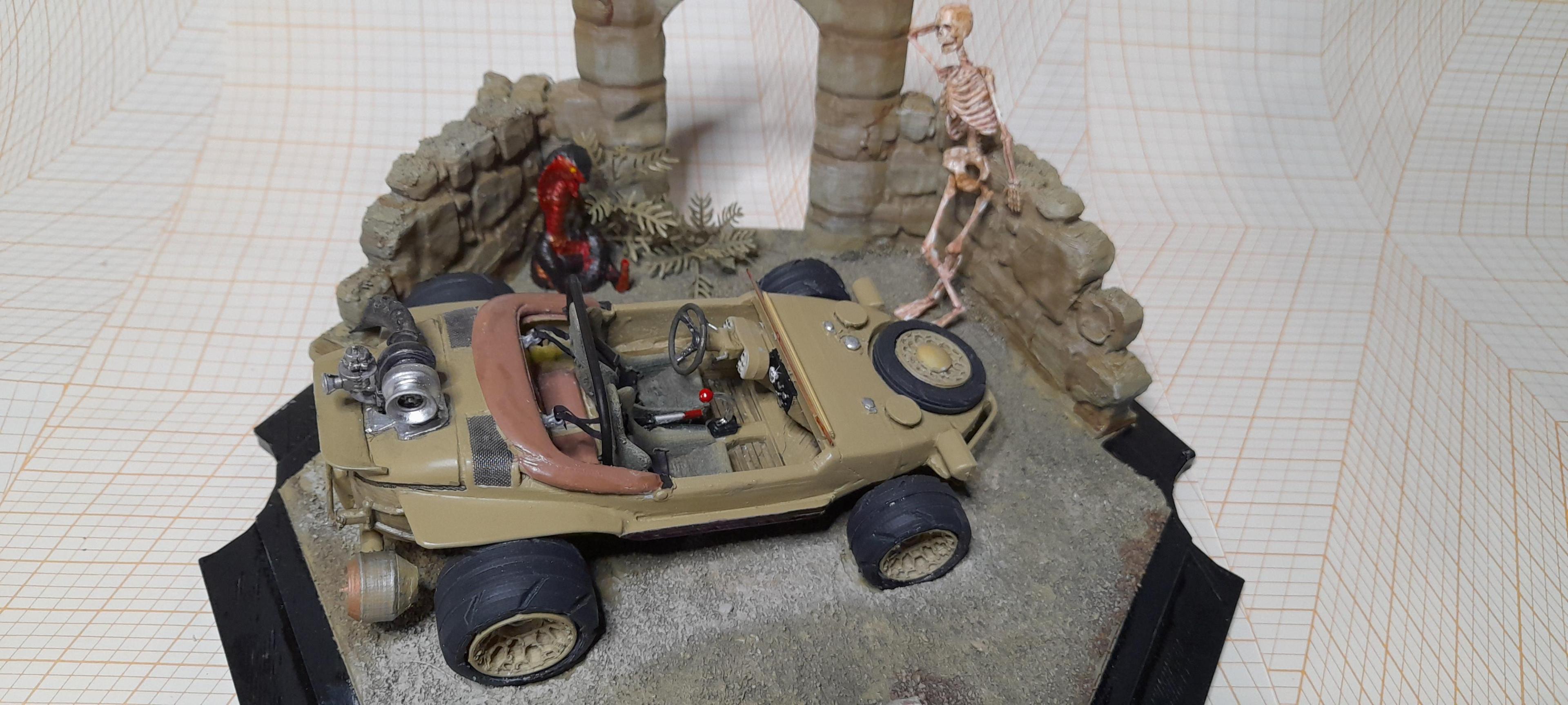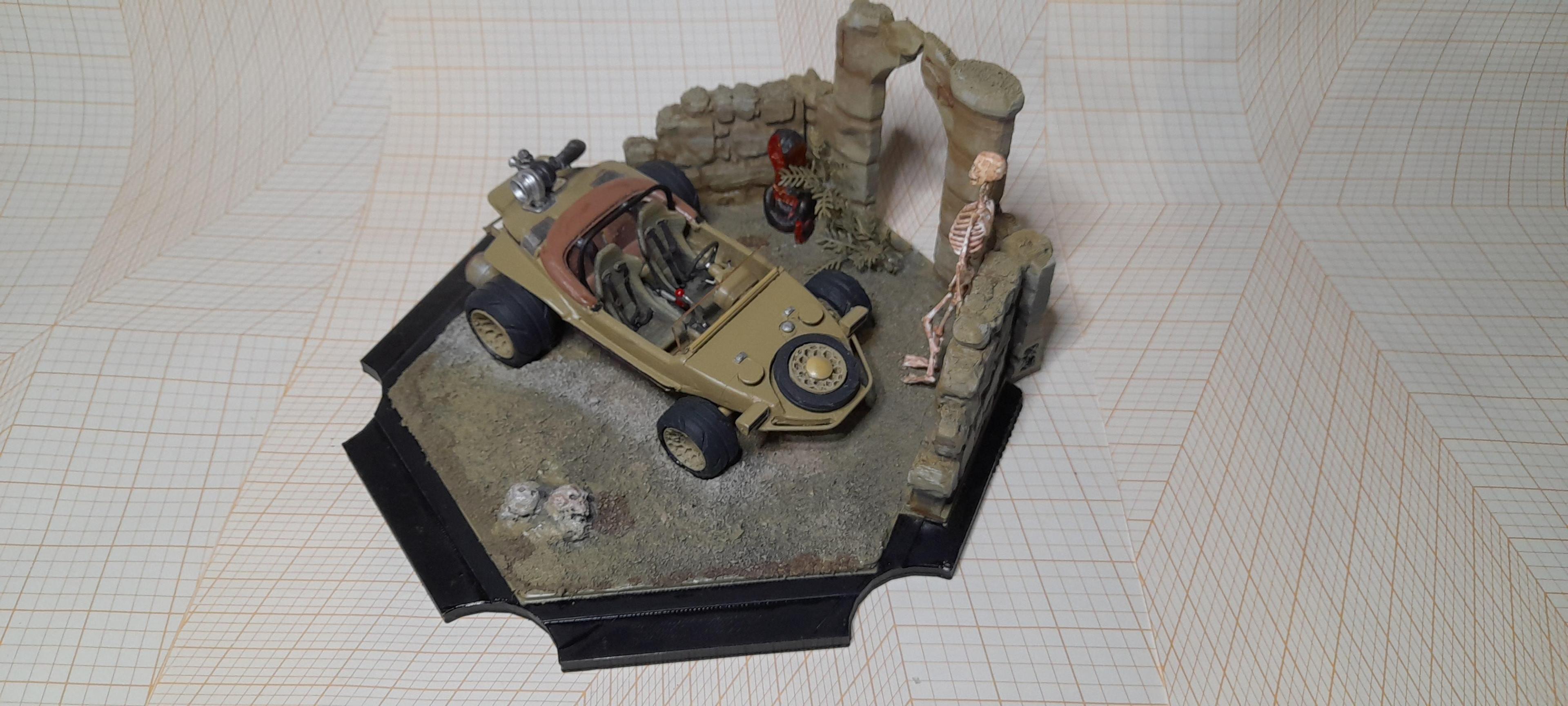 Club build theme was "water". Since I mainly build cars this was a bit of a challenge. The usual rally car/water splash was suggested but I wanted something different and i came up with an amphibious vehicle. The schwimmwagen was the most interesting looking and I found a 3D file on Thingiverse for one thanks to "WindhamGraves" who posted it. Best fun came when I put it into Cura and started playing with the xyz coordinates. to get a 1/24 scale, the x went to 350%, y to 390% and z to 300% which meant I had the correct wheelbase and wider and lower body!! I only have a filament printer so the body (tub?) is a bit ruff but as it was going into a diorama I figured I'd get away with it. The setting was obvious for a schwimmwagen for a water theme..... the desert. Brian