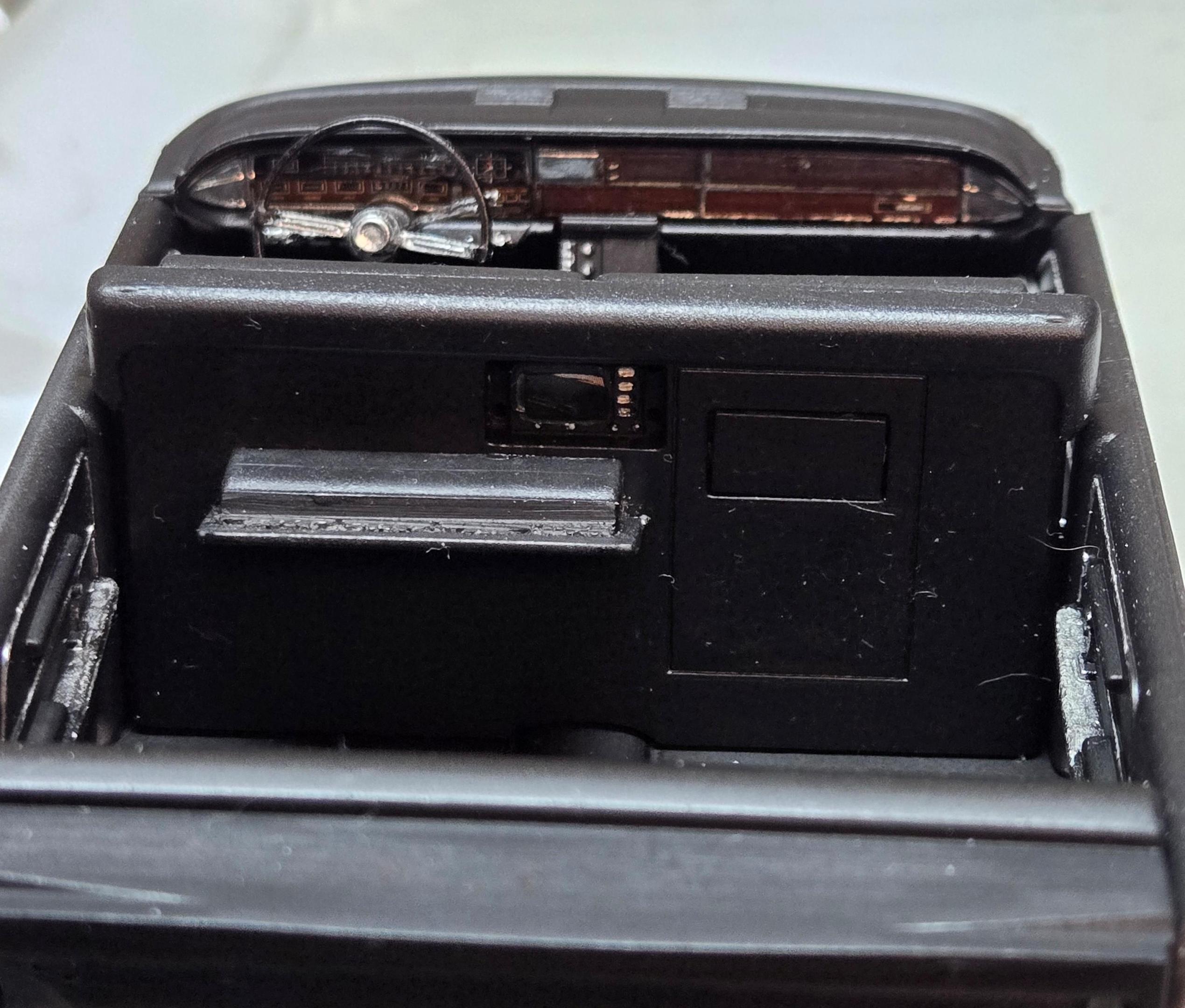 The interior is done! The color is some old Testor's flat gray military color. The steering wheel was painted with Revell Chrome spray. "Chrome" bits were hit with Molotow chrome. The guages, HVAC, and cassette/sound units are Model Car Garage items. While the instructions call for assembling the pieces in the body, per Tim Boyd's '37 Ford article in the 1990 Scale Auto Enthusiast article, I assembled it as one unit. I did a test fitting (not pictured) and this is definitely the way to go! -