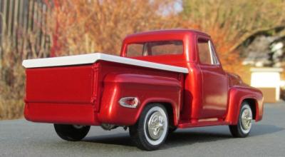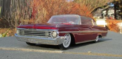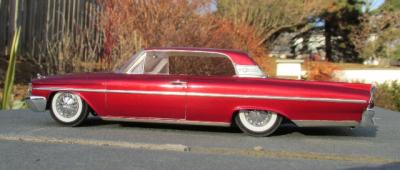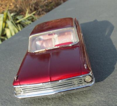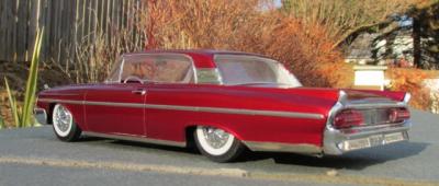 I bought this kit about 10 years ago with the intention of building a street machine. While it was missing several key items like an engine and firewall, it did contain new Modelhaus bumpers and the original kustom parts. I'm a sucker for early 60's AMT customs, so good-bye street machine, hello kustom. The interior is painted Tamiya pearl white, with Scale Motorsports decals on the seats. The exterior paint is Tamiya clear red over Tamiya Metallic Red. Wheels are from the AMT '61 Ford; tires are old Monogram items. This one time I wish the builder HAD glued on the fender skirts! Thanks for looking!