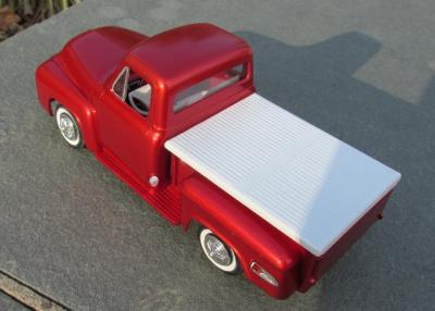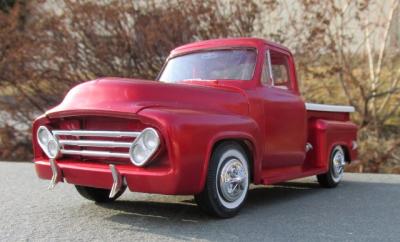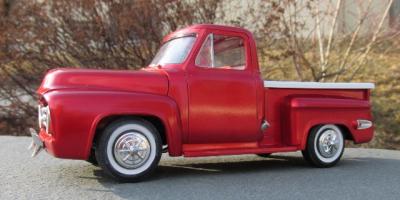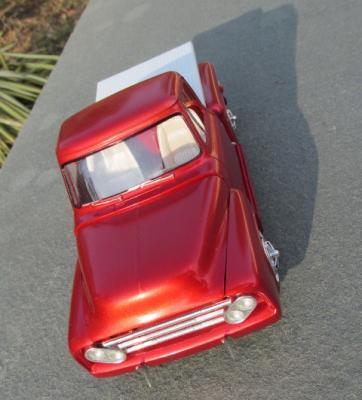 The major inspiration for this build was the box art from one of the many re-issues of this kit - I've always liked the canted headlights options for the custom. This one is based on the 90's "Diamond in the Rough" issue. Paint is Tamiya Mica Red over Testor's True Gold. Seats, steering wheel, and center console are from the AMT '49 Merc. Wheels are from the circa 1963 issue of the AMT 1950 Ford convertible. Tail lights are from the parts box; the remaining parts are from the kit. All in all, this is a surprisingly well engineered kit and was a hoot to build.